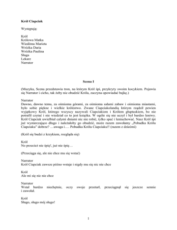 Król Ciapciak Występują: Król Królowa Matka Wiedźma Marieta Wróżka Daria Wróżka Paulina Sługa Lekarz Narrator Scena I (Muzyka, Scena przedstawia tron, na którym Król śpi, przykryty swoim kocykiem. Pojawia się Narrator i cicho, tak żeby nie obudzić Króla, zaczyna opowiadać bajkę.) Narrator Dawno, dawno temu, za ośmioma górami, za ośmioma salami zabaw i ośmioma miastami, było sobie piękne i wielkie królestwo. Zwane Ciapciakolandią którym rządził pewien wyjątkowy Król, którego wszyscy nazywali Ciapciakiem i Królem głuptaskiem, bo nie potrafił czytać i nie wiedział co to jest książka. W ogóle się nie uczył i był bardzo leniwy. Król Ciapciak uwielbiał całymi dniami nic nie robić, tylko spać i leniuchować. Nasz Król śpi już wystarczająco długo i należałoby go obudzić, może razem zawołamy „Pobudka Królu Ciapciaku” dobrze? …uwaga i…. Pobudka Królu Ciapciaku!! (razem z dziećmi) (Król się budzi z krzykiem, rozgląda się) Król No przecież nie śpię!, już nie śpię… (Przeciąga się, ale nie chce mu się wstać) Narrator Król Ciapciak zawsze późno wstaje i nigdy mu się nic nie chce Król Ale mi się nic nie chce Narrator Wstał bardzo i zawołał. niechętnie, oczy swoje przetarł, Król Sługo, sługo mój sługo! 1 przeciągnął się jeszcze sennie (Wchodzi sługa) Król Przypomnij mi, co ja mam teraz zrobić, bo znów zapomniałem? Sługa Trzeba się umyć Królu Król Aha… Narrator Bo Król o wszystkim zapominał, że trzeba zęby myć, że oczy trzeba myć, i ręce przed posiłkiem, nic Król nie pamiętał. Król Nie lubię myć zębów i w ogóle niczego nie lubię… Narrator Ale trzeba się myć Królu, trzeba Król No dobra, ale to ostatni raz, Sługo, to przynieś mi wody, mydełko i ręczniczek, bo mi się nie chce (Sługa przynosi misę z wodą, ręcznik i mydło. Król zamacza delikatnie palce w misie, wyciera paluszki, a potem rzuca ręcznik na ziemię) Narrator Król nigdy po sobie nie sprzątał, wszystko rzucał gdzie chciał… Król Jestem Królem, mogę rzucać, gdzie chcę… (Król śpiewa piosenkę) Nudzę się od rana Nie jadłem śniadania Muchy mam w nosie Brudny jestem jak prosie I co z tego, ja się pytam Jestem królem w sen pomykam Trochę pośpię w nosie dłubię Bo pracować ja nie lubię Nudzę się ogromnie Mucha biega po mnie Niczym się nie przejmuje Pewnie zamach na mnie knuje 2 Scena II Narrator I nagle wydarzyła się rzecz straszna! Król Ach, gdzie moja korona?, gdzie jest moja korona. Moja cudowna wspaniała, ukochana korona? Sługo, sługo mój, gdzie jest moja korona?, znajdź mi moją koronę, matko moja, gdzie jest moja korona?, znajdź moją koronę, ja muszę mieć koronę! (Król zaczyna się niepokoić i szukać korony, a z nim szuka Sługa i Matka Króla. Muzyka towarzyszy podczas biegania i szukania korony. Korona jest szukana również wśród dzieci. Dzieci są pytane, gdzie jest korona, czy nie widziały korony Króla. Wszyscy co chwilę wykrzykują „korona, gdzie jest korona”). KrólowaMatka O mam, znalazłam, jest, jest korona mój synu! (Muzyka się kończy, korona była pod tronem, sługa znika) Król Och Królowo mamo, jesteś wspaniała, dziękuję KrólowaMatka I jak to się rzeczy swoje szanuje co?!, trzeba dbać, trzeba szanować, żeby się nie zniszczyło, rozumiesz?! Król Ale mi się nie chcę Królowo Mamo KrólowaMatka Och ty Ciapciaku, Ciapciaku (Oddaje koronę Królowi, a on dumnie zakłada ją na głowę) KrólowaMatka Tylko nie zgub jej znowu! Król Tak Królowo Mamo (Królowa Matka odchodzi , a Król się drapie po głowie i spada mu korona, nie zauważa tego, po czym siada na tronie i myśli dalej, po chwili drapie się po głowie i wie, że znów nie ma korony) Król Ojej, ojej , zgubiłem koronę królestwa, znowu, ale ze mnie Ciapciak…Korona!, korona!, zgubiłem koronę!, niech mi ktoś pomoże?! 3 (Król się zwraca do dzieci, czy nie widziały Korony Króla. Z pomocą dzieci Król odnajduje Koronę i zasiada na tronie) Scena III (Król siedzi na tronie, podpiera się jedną ręką i się nudzi, wchodzi narrator) Narrator Król Ciapciak przez to, że nic mu się nie chciało, był bardzo głupiutki nie wiedział wielu rzeczy. W ogóle się nie uczył, bo mu się nie chciało. Król Och jak mi się nie chce… Narrator Więc Król nie zna się na najprostszych rzeczach, nie wie do czego służą i jak powinny wyglądać… (Król bierze do ręki samochód zabawkę, podchodzi do dzieci. W trakcie jego różnych pytań, słychać muzykę, pojedyncze dźwięki. Jakby wtórujące mu w jego pytaniach) Król Dlaczego samochód ma koła, czemu koń ma cztery nogi a nie trzy?, dlaczego nos mamy tam gdzie jest nos, a nie na przykład na ramieniu, dlaczego krowa robi muuuu, a nie ko ko ko, po co ta ściana jest twarda, a nie miękka?, po co w ogóle są grzejniki i skąd tu tyle dzieci?...ja nie rozumiem, ja nie wiem… Narrator A jak się Króla spyta, (mówi do Króla) Królu, a jakie zwierzę robi chał chał chał? To Król odpowie Król No oczywiście, że wiem, że to jest koń, koń robi chał chał chał Narrator No widzicie, jaki Król jest głupiutki, to dlatego, że jest leniwy i uczyć mu się nie chce. Całe królestwo Ciapciakolandi jest w rozsypce, bo Król nie potrafi doradzić swoim poddanym. (Na scenę wchodzi Sługa) Sługa Królu, mój Królu, obiad podano Król O cudownie, cudownie, a gdzie? Sługa W jadalni 4 Król O nie, to ja muszę wstać i iść? Oooo (Król wstaje, acz nie chętnie i schodzi ze sceny wraz ze Sługą) Scena IV (Muzyka na sam początek. Podczas tekstu cichnie. Wiedźma Marieta śmieje się straszliwie) Wiedźma ze mnie jest paskudna Wiedzę mam, nie jestem nudna Macham w kotle i czaruję Może króla ugotuję Jestem stara i okrutna Zeza mam nie jestem smutna Domek mam na kurzej łapie Jak się chwieje, to go złapie Ja dla Króla mam złe wieści Jak się dowie to się zemści Albo w łóżku si