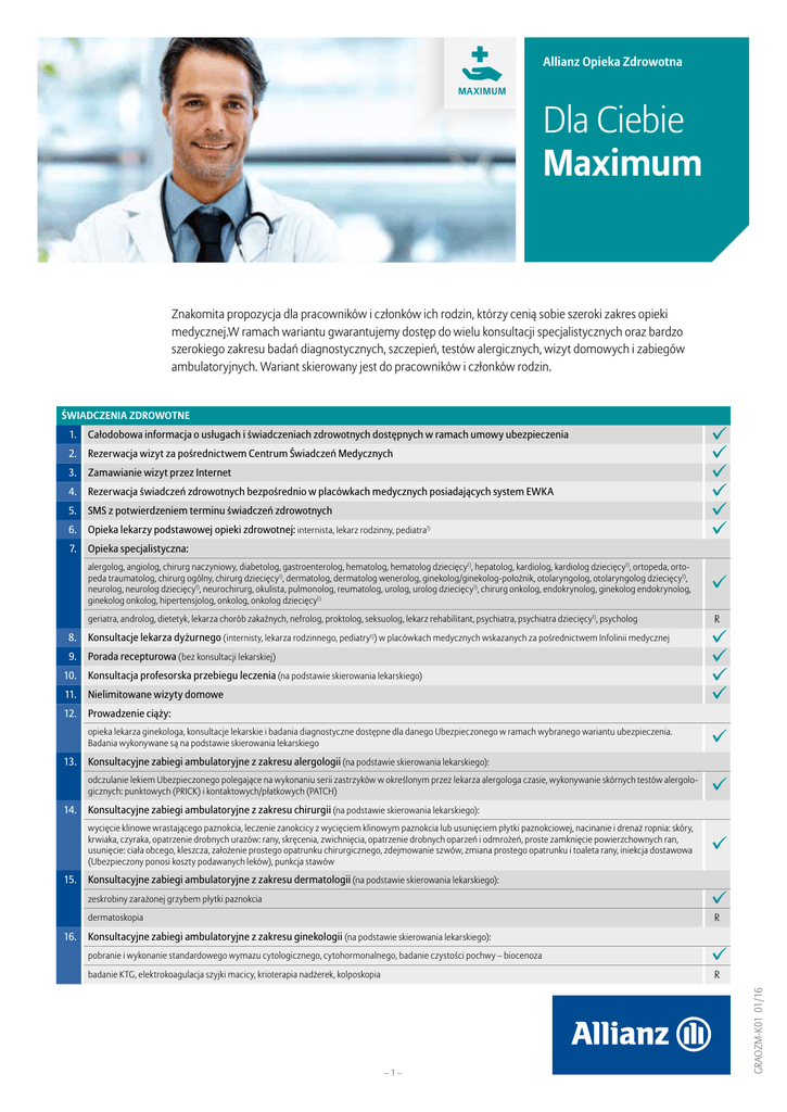 Allianz Opieka Zdrowotna MAXIMUM Dla Ciebie Maximum Znakomita propozycja dla pracowników i członków ich rodzin, którzy cenią sobie szeroki zakres opieki medycznej.W ramach wariantu gwarantujemy dostęp do wielu konsultacji specjalistycznych oraz bardzo szerokiego zakresu badań diagnostycznych, szczepień, testów alergicznych, wizyt domowych i zabiegów ambulatoryjnych. Wariant skierowany jest do pracowników i członków rodzin. ŚWIADCZENIA ZDROWOTNE 1. Całodobowa informacja o usługach i świadczeniach zdrowotnych dostępnych w ramach umowy ubezpieczenia 2. Rezerwacja wizyt za pośrednictwem Centrum Świadczeń Medycznych 3. Zamawianie wizyt przez Internet 4. Rezerwacja świadczeń zdrowotnych bezpośrednio w placówkach medycznych posiadających system EWKA 5. SMS z potwierdzeniem terminu świadczeń zdrowotnych 6. Opieka lekarzy podstawowej opieki zdrowotnej: internista, lekarz rodzinny, pediatra1) 7. Opieka specjalistyczna: alergolog, angiolog, chirurg naczyniowy, diabetolog, gastroenterolog, hematolog, hematolog dziecięcy1), hepatolog, kardiolog, kardiolog dziecięcy1), ortopeda, ortopeda traumatolog, chirurg ogólny, chirurg dziecięcy1), dermatolog, dermatolog wenerolog, ginekolog/ginekolog-położnik, otolaryngolog, otolaryngolog dziecięcy1), neurolog, neurolog dziecięcy1), neurochirurg, okulista, pulmonolog, reumatolog, urolog, urolog dziecięcy1), chirurg onkolog, endokrynolog, ginekolog endokrynolog, ginekolog onkolog, hipertensjolog, onkolog, onkolog dziecięcy1) geriatra, androlog, dietetyk, lekarza chorób zakaźnych, nefrolog, proktolog, seksuolog, lekarz rehabilitant, psychiatra, psychiatra dziecięcy1), psycholog 8. Konsultacje lekarza dyżurnego (internisty, lekarza rodzinnego, pediatry ) w placówkach medycznych wskazanych za pośrednictwem Infolinii medycznej 9. Porada recepturowa (bez konsultacji lekarskiej) Konsultacja profesorska przebiegu leczenia (na podstawie skierowania lekarskiego) 11. Nielimitowane wizyty domowe 12. Prowadzenie ciąży: opieka lekarza ginekologa, konsultacje lekarskie i badania diagnostyczne dostępne dla danego Ubezpieczonego w ramach wybranego wariantu ubezpieczenia. Badania wykonywane są na podstawie skierowania lekarskiego 13. Konsultacyjne zabiegi ambulatoryjne z zakresu dermatologii (na podstawie skierowania lekarskiego): zeskrobiny zarażonej grzybem płytki paznokcia ✓ ✓ ✓ ✓ R dermatoskopia 16. ✓ ✓ ✓ ✓ Konsultacyjne zabiegi ambulatoryjne z zakresu chirurgii (na podstawie skierowania lekarskiego): wycięcie klinowe wrastającego paznokcia, leczenie zanokcicy z wycięciem klinowym paznokcia lub usunięciem płytki paznokciowej, nacinanie i drenaż ropnia: skóry, krwiaka, czyraka, opatrzenie drobnych urazów: rany, skręcenia, zwichnięcia, opatrzenie drobnych oparzeń i odmrożeń, proste zamknięcie powierzchownych ran, usunięcie: ciała obcego, kleszcza, założenie prostego opatrunku chirurgicznego, zdejmowanie szwów, zmiana prostego opatrunku i toaleta rany, iniekcja dostawowa (Ubezpieczony ponosi koszty podawanych leków), punkcja stawów 15. R Konsultacyjne zabiegi ambulatoryjne z zakresu alergologii (na podstawie skierowania lekarskiego): odczulanie lekiem Ubezpieczonego polegające na wykonaniu serii zastrzyków w określonym przez lekarza alergologa czasie, wykonywanie skórnych testów alergologicznych: punktowych (PRICK) i kontaktowych/płatkowych (PATCH) 14. ✓ Konsultacyjne zabiegi ambulatoryjne z zakresu ginekologii (na podstawie skierowania lekarskiego): pobranie i wykonanie standardowego wymazu cytologicznego, cytohormonalnego, badanie czystości pochwy – biocenoza ✓ R badanie KTG, elektrokoagulacja szyjki macicy, krioterapia nadżerek, kolposkopia –1– GRAOZM-K01 01/16 10. 1) ✓ ✓ ✓ ✓ ✓ ✓ 17. Konsultacyjne zabiegi ambulatoryjne z zakresu okulistyki (na podstawie skierowania lekarskiego): badanie pola widzenia (perymetria), gonioskopia (ocena kąta przesączania), płukanie dróg łzowych, badanie dna oka, badanie forii, badanie lampą szczelinową, badanie ostrości widzenia, biometria, dobór szkieł okularowych, egzoftalmometria (badanie wytrzeszczu), opatrunek oczny z lekiem, pachymetria, pomiar ciśnienia śródgałkowego, refraktometria (komputerowe badanie wzroku), skiaskopia/retinoskopia (badanie refrakcji oka), usunięcie ciała obcego z oka/powieki 18. Konsultacyjne zabiegi ambulatoryjne z zakresu ortopedii (na podstawie skierowania lekarskiego): wykonanie doraźnego unieruchomienia w zwichnięciach, skręceniach i drobnych złamaniach, założenie lub zdjęcie opatrunku gipsowego, iniekcja dostawowa (Ubezpieczony ponosi koszty podawanych leków) punkcje stawów 19. Konsultacyjne zabiegi ambulatoryjne z zakresu urologii (na podstawie skierowania lekarskiego): cewnikowanie pęcherza moczowego, płukanie pęcherza moczowego, wymiana cewnika (Ubezpieczony pokrywa koszty cewnika) 20. Konsultacyjne zabiegi ambulatoryjne z zakresu laryngologii (na podstawie skierowania lekarskiego): opatrunek uszny z lekiem, pędzlowanie: gardła, jamy ustnej, płukanie uszu, postępowanie zachowawcze w przypadku krwawienia z nosa (założenie gąbki spongostanowej, założenie i usunięcie tamponady przedniej nosa, koagulacja naczyń splotu Kisselbacha), przedmuchiwanie trąbek słuchowych, usuwanie ciała obcego z: ucha, nosa, gardła punkcje zatok, płukanie zatok metodą Proteza, płukanie zatok po operacji Caldvell-Luca, anemizacja ujścia zatok, paracenteza 21. Alfa 1 – antytrypsyna, Alfa 1 – kwaśna glikoproteina, amoniak, białko C (PC) – aktywność, białko S, cholinesteraza (CHE), cynk (Zn), cystatyna C, dopełniacz – składowa C3, dopełniacz – składowa C4, miedź, prokalcytonina (PCT) – półilościowo, prokalcytonina (PCT) – ilościowo R Diagnostyka miażdżycy – badania z krwi (na podstawie skierowania lekarskiego): Diagnostyka cukrzycy – badania z krwi (na podstawie skierowania lekarskiego): glukoza/cukier na czczo, glukoza po obciążeniu/krzywa gl