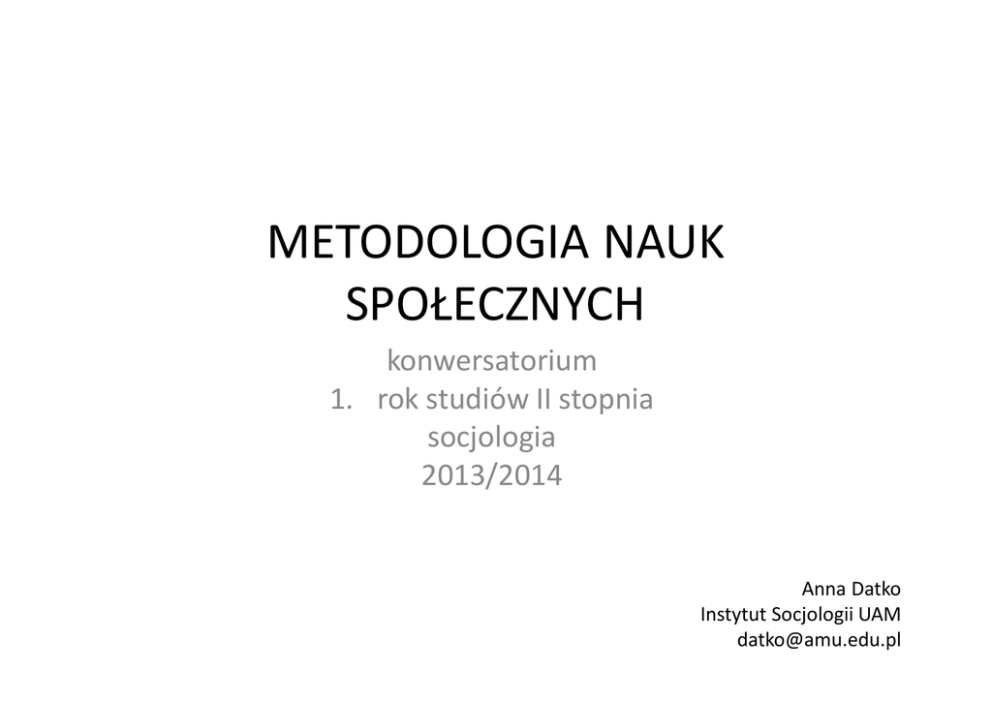 METODOLOGIA NAUK SPOŁECZNYCH konwersatorium 1. rok studiów II stopnia socjologia 2013/2014 Anna Datko Instytut Socjologii UAM [email protected] WSTĘP 1. Zajęcia organizacyjne a) podstawowe informacje dotyczące zajęć b) metodologia socjologii a jej przedmiot: – – – – definicja metodologii zadania metodologii pojęcie wiedzy metodologia w socjologii Literatura: • • • Encyklopedia socjologii. T 2: K – N, H. Domański (red.), Oficyna Naukowa, Warszawa 1999, hasło: Metodologia socjologiczna. Encyklopedia socjologii T 4:S – Ż, K. W. Frieske (red.), Oficyna Naukowa, Warszawa 2002, hasło: Wiedza. Filozofia a nauka. Zarys encyklopedyczny, PAN, Wydział Nauk Społecznych, Komitet Nauk Filozoficznych, Zakład Narodowy im. Ossolińskich, Wrocław 1987, hasło: Socjologia wiedzy. 2 PODSTAWOWE INFORMACJE • Rok akademicki: 2013/2014 • Forma zajęć: ćwiczenia obowiązkowe (15 godz.) • Forma zaliczenia: kolokwium zaliczeniowe • Uwagi: konieczna – znajomość literatury, premiowana – aktywność podczas zajęć, dopuszczalna – jedna nieusprawiedliwiona nieobecność (1,5 h zajęć) • http://www.socjologia.amu.edu.pl/isoc/downloads.php ?cat_id=1&user_id=113 3 PROGRAM KONWERSATORIÓW 1. Zajęcia organizacyjne – wprowadzenie do metodologii. 2. Specyficzne elementy metodologii nauk społecznych 3. Teoria naukowa. 4. Wyjaśnianie i przewidywanie, przyczynowość. 5. Pojęcia metodologiczne. 6. Racjonalność – zobiektywizowane pojęcie racjonalności. 7. Krytyczna interpretacja wiedzy naukowej. 8. Kolokwium zaliczeniowe. 4 WIEDZA 1. Ujęcie klasyczne: przekonania pewne i prawdziwe (episteme). a) epistemologia – filozoficzna teoria poznania • czy i w jaki sposób myślenie ludzkie jest zdolne poznać (=trafnie odzwierciedlić) świat zewnętrzny b) ≠ niepewne i zawodne opinie (doxa) 2. Immanuel Kant: każdy człowiek wnosi do aktu poznawczego subiektywny czynnik. 3. Poziomy analizy wiedzy: a) naturalno – biologiczny b) społeczno – kulturowo – historyczny 5 SOCJOLOGIA WIEDZY – – sposoby uprawiania Szukanie społecznych uwarunkowań poznania fałszywego. Klasyczna socjologia wiedzy – podejmowanie pytań epistemologicznych. Socjologia poznania naukowego (wiedzy naukowej) – wątki epistemologiczne w kontekście filozofii nauki. Socjologia nauki jako instytucji społecznej. Socjologia przekonań. 6 POZNANIE FAŁSZYWE 1. Przyczyny błędów poznania ludzkiego: a) początkowo – cechy natury ludzkiej b) w toku rozwoju nauki – specyficzne warunki społeczne 2. Koncepcja Francisa Bacona (XVI w) – złudzenia (idole) zakłócające poznanie rzeczywistości: a) plemienne – wynikające z natury ludzkiej b) jaskini – uwarunkowania społeczne (wychowanie, lektury, wpływ otoczenia) c) rynku – wynikające z pojęć używanego języka d) teatru – pochodzące z tradycji filozoficznej 7 DYSONANSE – –procesy automistyfikacji Naturalne, psychologicznie uwarunkowane ludzkie skłonności, z których jednostki mogą nie zdawać sobie sprawy (NIE oszustwo). 1. Friedrich Nietzsche – tworzenie iluzji odpowiadającej ludzkim potrzebom (perspektywa, nie prawda). 2. Zygmunt Freud – jednostki spychają niewygodne treści w podświadomość. 3. Vilfredo Pareto – rzeczywiste bodźce do działania (rezydua) są osłonięte upiększającymi usprawiedliwiającymi i racjonalizującymi wyjaśnieniami i legitymizacjami słownymi (derywacje) 8 DYSONANSE – –procesy automistyfikacji Skłonność do budowy fałszywych systemów poglądów to cecha uwarunkowana społecznie – dążenie do utrzymania i panowania klasowego. 1. Karol Marks i Fryderyk Engels – „fałszywa świadomość” a) systemy poglądów uporządkowane przez intelektualistów b) podstawy życia i zmian społecznych upatrywane w ideach a nie działaniach materialnych c) systemy wzmacniające i umacniające panowanie klas posiadających 9 KLASYCZNA SOCJOLOGIA WIEDZY 1. Analiza społecznych i historycznych uwarunkowań wiedzy (też wiedzy prawdziwej): a) sposób warunkowania b) stopień warunkowania 2. Analiza socjologiczna musi być stosowana zarówno wobec światopoglądowych oponentów, jak i wobec siebie. 3. Robert K. Merton – „nie tylko błąd, złudzenie czy nieudowodnione przekonanie jest warunkowane społecznie (historycznie), ale też odkrycie prawdy” (R. K. Merton, Teoria socjologiczna i struktura społeczna, PWN, Warszawa 2002, 10 s. 496) PYTANIA ROBERTA K. MERTONA 1. Podstawowe problemy na gruncie socjologii wiedzy: Jakiego typu egzystencjalne uwarunkowania należy uwzględnić? Jakie formy wiedzy i jej składniki są społecznie uwarunkowane? Jakiego typu powiązania istnieją między warunkami społecznymi a formami wiedzy? Jakie są funkcje społecznie uwarunkowanych form wiedzy? 11 KONCEPCJA KARLA MANNHEIMA 1. Obserwator wkracza w wyniki poznania. 2. Prawda w naukach społecznych jest społecznie uwarunkowana. 3. Relacjonizm: a) odmienne pozycje (grupowe „kąty widzenia”) to cząstkowe wizje rzeczywistości b) świadomość cząstkowości tworzy dystans do własnej wiedzy c) dzięki mobilności społecznej (zmianom) zmieniają się perspektywy poznawcze d) tworzenie „społecznie niezwiązanej” inteligencji 12 SOCJOLOGIA WIEDZY – – rozdwojenie Socjologia wiedzy jest nauką autorefleksyjną. 1. Socjologia poznania naukowego (pytania o zasadność poznania). 2. Socjologia badająca różne formy wiedzy społecznej (zwłaszcza potocznej). 13 POZNANIE NAUKOWE Socjologia poznania naukowego powiązana jest z filozofią nauki. o Thomas Kuhn – zmiana paradygmatu w nauce jako wynik wewnętrznej rywalizacji odłamów środowiska naukowego. o Stefan Amsterdamski – podkreślenie roli społecznej akceptacji określonych ideałów nauki i wzorów racjonalności naukowej. o Barry Barnes & David Bloor – sądy naukowe (też w naukach formalnych) zależą od reguł racjonalności wytwarzanych przez całe społeczeństwo. 14 SOCJOLOGIA NAUKI 1. Nauka jako instytucja sp