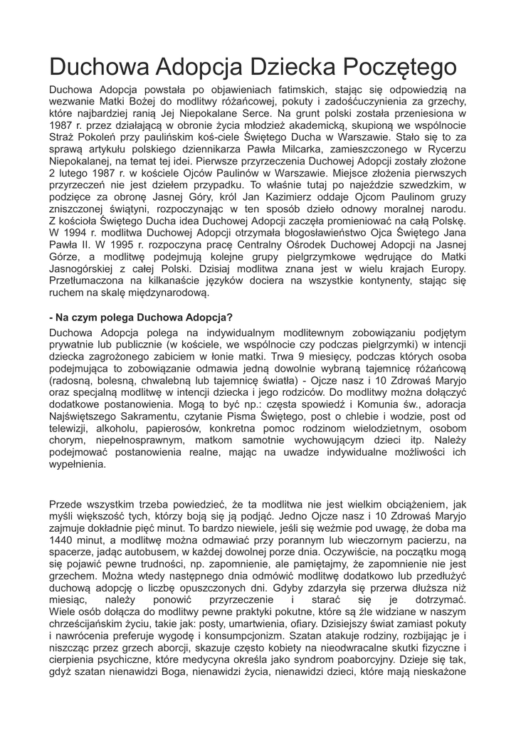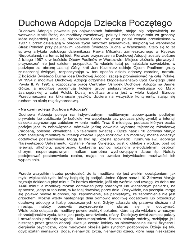 Duchowa Adopcja Dziecka Poczętego Duchowa Adopcja powstała po objawieniach fatimskich, stając się odpowiedzią na wezwanie Matki Bożej do modlitwy różańcowej, pokuty i zadośćuczynienia za grzechy, które najbardziej ranią Jej Niepokalane Serce. Na grunt polski została przeniesiona w 1987 r. przez działającą w obronie życia młodzież akademicką, skupioną we wspólnocie Straż Pokoleń przy paulińskim koś-ciele Świętego Ducha w Warszawie. Stało się to za sprawą artykułu polskiego dziennikarza Pawła Milcarka, zamieszczonego w Rycerzu Niepokalanej, na temat tej idei. Pierwsze przyrzeczenia Duchowej Adopcji zostały złożone 2 lutego 1987 r. w kościele Ojców Paulinów w Warszawie. Miejsce złożenia pierwszych przyrzeczeń nie jest dziełem przypadku. To właśnie tutaj po najeździe szwedzkim, w podzięce za obronę Jasnej Góry, król Jan Kazimierz oddaje Ojcom Paulinom gruzy zniszczonej świątyni, rozpoczynając w ten sposób dzieło odnowy moralnej narodu. Z kościoła Świętego Ducha idea Duchowej Adopcji zaczęła promieniować na całą Polskę. W 1994 r. modlitwa Duchowej Adopcji otrzymała błogosławieństwo Ojca Świętego Jana Pawła II. W 1995 r. rozpoczyna pracę Centralny Ośrodek Duchowej Adopcji na Jasnej Górze, a modlitwę podejmują kolejne grupy pielgrzymkowe wędrujące do Matki Jasnogórskiej z całej Polski. Dzisiaj modlitwa znana jest w wielu krajach Europy. Przetłumaczona na kilkanaście języków dociera na wszystkie kontynenty, stając się ruchem na skalę międzynarodową. - Na czym polega Duchowa Adopcja? Duchowa Adopcja polega na indywidualnym modlitewnym zobowiązaniu podjętym prywatnie lub publicznie (w kościele, we wspólnocie czy podczas pielgrzymki) w intencji dziecka zagrożonego zabiciem w łonie matki. Trwa 9 miesięcy, podczas których osoba podejmująca to zobowiązanie odmawia jedną dowolnie wybraną tajemnicę różańcową (radosną, bolesną, chwalebną lub tajemnicę światła) - Ojcze nasz i 10 Zdrowaś Maryjo oraz specjalną modlitwę w intencji dziecka i jego rodziców. Do modlitwy można dołączyć dodatkowe postanowienia. Mogą to być np.: częsta spowiedź i Komunia św., adoracja Najświętszego Sakramentu, czytanie Pisma Świętego, post o chlebie i wodzie, post od telewizji, alkoholu, papierosów, konkretna pomoc rodzinom wielodzietnym, osobom chorym, niepełnosprawnym, matkom samotnie wychowującym dzieci itp. Należy podejmować postanowienia realne, mając na uwadze indywidualne możliwości ich wypełnienia. Przede wszystkim trzeba powiedzieć, że ta modlitwa nie jest wielkim obciążeniem, jak myśli większość tych, którzy boją się ją podjąć. Jedno Ojcze nasz i 10 Zdrowaś Maryjo zajmuje dokładnie pięć minut. To bardzo niewiele, jeśli się weźmie pod uwagę, że doba ma 1440 minut, a modlitwę można odmawiać przy porannym lub wieczornym pacierzu, na spacerze, jadąc autobusem, w każdej dowolnej porze dnia. Oczywiście, na początku mogą się pojawić pewne trudności, np. zapomnienie, ale pamiętajmy, że zapomnienie nie jest grzechem. Można wtedy następnego dnia odmówić modlitwę dodatkowo lub przedłużyć duchową adopcję o liczbę opuszczonych dni. Gdyby zdarzyła się przerwa dłuższa niż miesiąc, należy ponowić przyrzeczenie i starać się je dotrzymać. Wiele osób dołącza do modlitwy pewne praktyki pokutne, które są źle widziane w naszym chrześcijańskim życiu, takie jak: posty, umartwienia, ofiary. Dzisiejszy świat zamiast pokuty i nawrócenia preferuje wygodę i konsumpcjonizm. Szatan atakuje rodziny, rozbijając je i niszcząc przez grzech aborcji, skazuje często kobiety na nieodwracalne skutki fizyczne i cierpienia psychiczne, które medycyna określa jako syndrom poaborcyjny. Dzieje się tak, gdyż szatan nienawidzi Boga, nienawidzi życia, nienawidzi dzieci, które mają nieskażone serca i do których należy Królestwo Niebieskie. Dlatego stara się wtargnąć w plany Boga, zniszczyć życie, przede wszystkim nie dopuszczając do poczęcia dziecka, oferując całą gamę środków antykoncepcyjnych, które rujnują zdrowie kobiety. Jeśli mimo to dziecko zostaje poczęte, chce je zabić jeszcze przed narodzeniem.Nie możemy być obojętni wobec tak wielkiego zła. Trzeba nam chwycić za broń, jaką jest modlitwa, pokuta, częsta spowiedź i Komunia św., zawierzenie Niepokalanemu Sercu Maryi i Różaniec św. Na tę broń, która jest ratunkiem dla świata i ocaleniem dusz przed potępieniem wiecznym, wskazała Matka Boża w uznanych przez Kościół objawieniach fatimskich. Oprócz ratowania życia konkretnego dziecka zagrożonego zabiciem, które bierzemy w modlitewną opiekę, modlitwa owocuje wielorakim dobrem. Jest nim systematyczna modlitwa w rodzinach, zwłaszcza gdy podejmują ją rodzice wraz z dziećmi. Dalej skutecznie leczy ona zranione serca matek i ojców, którzy odrzucili dar życia, przywracając pokój w rodzinach, budując nowe relacje między mężem i żoną, rodzicami i dziećmi. Modlitwa ta jest także darem duchowego macierzyństwa dla osób starszych, które czują się bardzo samotne i nikomu niepotrzebne oraz wspaniałym przygotowaniem do sakramentu małżeństwa. Modlitwa została wydana za pozwoleniem Kurii Metropolitalnej Warszawskiej (31 marca 1987 r. nr 1687/K/87). Ceremoniał przyrzeczeń opracowała Kuria Biskupia w Gdańsku 27 września1994 r. - ks. dr Wiesław Lauer, wikariusz generalny. Duchowa Adopcja otrzymała błogosławieństwo Ojca Świętego Jana Pawła II (List Sekretariatu Stanu z 25 kwietnia 1994 r., przesłany na ręce Przeora Klasztoru Jasnogórskiego).