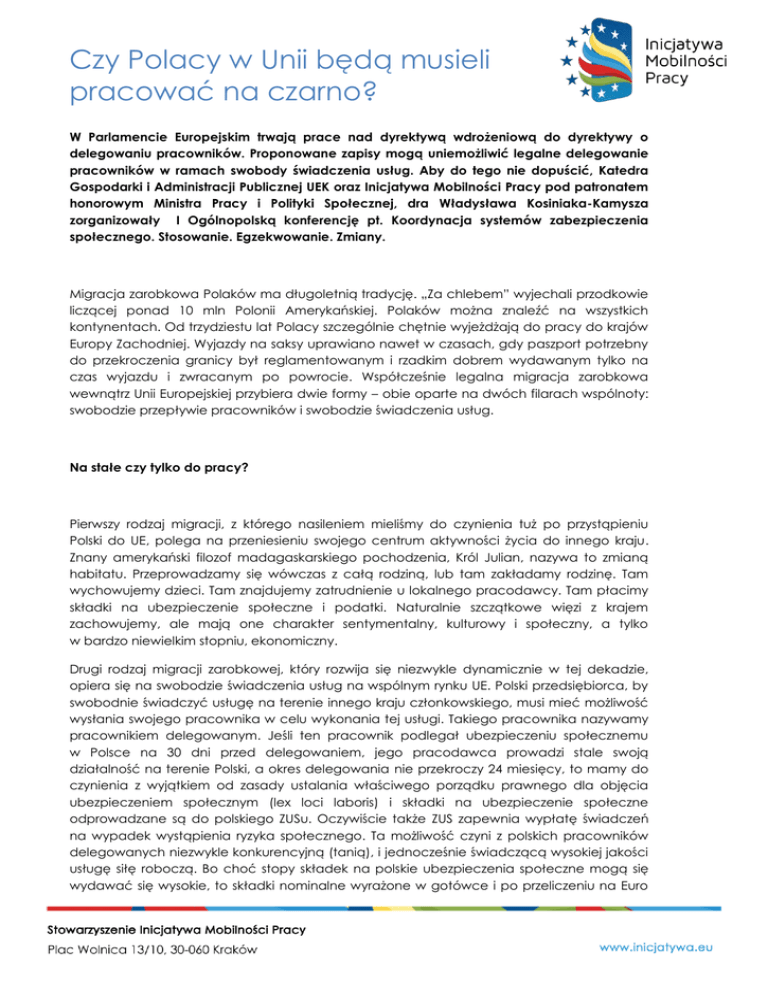 Czy Polacy w Unii będą musieli pracować na czarno? W Parlamencie Europejskim trwają prace nad dyrektywą wdrożeniową do dyrektywy o delegowaniu pracowników. Proponowane zapisy mogą uniemożliwić legalne delegowanie pracowników w ramach swobody świadczenia usług. Aby do tego nie dopuścić, Katedra Gospodarki i Administracji Publicznej UEK oraz Inicjatywa Mobilności Pracy pod patronatem honorowym Ministra Pracy i Polityki Społecznej, dra Władysława Kosiniaka-Kamysza zorganizowały I Ogólnopolską konferencję pt. Koordynacja systemów zabezpieczenia społecznego. Stosowanie. Egzekwowanie. Zmiany. Migracja zarobkowa Polaków ma długoletnią tradycję. „Za chlebem” wyjechali przodkowie liczącej ponad 10 mln Polonii Amerykańskiej. Polaków można znaleźć na wszystkich kontynentach. Od trzydziestu lat Polacy szczególnie chętnie wyjeżdżają do pracy do krajów Europy Zachodniej. Wyjazdy na saksy uprawiano nawet w czasach, gdy paszport potrzebny do przekroczenia granicy był reglamentowanym i rzadkim dobrem wydawanym tylko na czas wyjazdu i zwracanym po powrocie. Współcześnie legalna migracja zarobkowa wewnątrz Unii Europejskiej przybiera dwie formy – obie oparte na dwóch filarach wspólnoty: swobodzie przepływie pracowników i swobodzie świadczenia usług. Na stałe czy tylko do pracy? Pierwszy rodzaj migracji, z którego nasileniem mieliśmy do czynienia tuż po przystąpieniu Polski do UE, polega na przeniesieniu swojego centrum aktywności życia do innego kraju. Znany amerykański filozof madagaskarskiego pochodzenia, Król Julian, nazywa to zmianą habitatu. Przeprowadzamy się wówczas z całą rodziną, lub tam zakładamy rodzinę. Tam wychowujemy dzieci. Tam znajdujemy zatrudnienie u lokalnego pracodawcy. Tam płacimy składki na ubezpieczenie społeczne i podatki. Naturalnie szczątkowe więzi z krajem zachowujemy, ale mają one charakter sentymentalny, kulturowy i społeczny, a tylko w bardzo niewielkim stopniu, ekonomiczny. Drugi rodzaj migracji zarobkowej, który rozwija się niezwykle dynamicznie w tej dekadzie, opiera się na swobodzie świadczenia usług na wspólnym rynku UE. Polski przedsiębiorca, by swobodnie świadczyć usługę na terenie innego kraju członkowskiego, musi mieć możliwość wysłania swojego pracownika w celu wykonania tej usługi. Takiego pracownika nazywamy pracownikiem delegowanym. Jeśli ten pracownik podlegał ubezpieczeniu społecznemu w Polsce na 30 dni przed delegowaniem, jego pracodawca prowadzi stale swoją działalność na terenie Polski, a okres delegowania nie przekroczy 24 miesięcy, to mamy do czynienia z wyjątkiem od zasady ustalania właściwego porządku prawnego dla objęcia ubezpieczeniem społecznym (lex loci laboris) i składki na ubezpieczenie społeczne odprowadzane są do polskiego ZUSu. Oczywiście także ZUS zapewnia wypłatę świadczeń na wypadek wystąpienia ryzyka społecznego. Ta możliwość czyni z polskich pracowników delegowanych niezwykle konkurencyjną (tanią), i jednocześnie świadczącą wysokiej jakości usługę siłę roboczą. Bo choć stopy składek na polskie ubezpieczenia społeczne mogą się wydawać się wysokie, to składki nominalne wyrażone w gotówce i po przeliczeniu na Euro są jednymi z najniższych w Europie. W efekcie, dzięki wciąż występującej znacznej różnicy w wysokości nominalnych zarobków między krajami starej piętnastki i Polską, wszyscy są zadowoleni. Nabywca usługi otrzymuje wysokiej jakości usługę po niższej cenie niż gdyby ją wykonał lokalny dostawca tej samej usługi. Delegowany z Polski pracownik zarabia więcej niż za wykonanie tej samej usługi w Polsce, składki zostają w polskim ZUSie i wystarcza jeszcze na zysk dla pracodawcy. Pracownik delegowany, w odróżnieniu od emigranta zarobkowego, nie traci więzi ekonomicznej z krajem pochodzenia. Pozostaje tu ubezpieczony, tu wyda większość swoich zarobków, tu wychowa dzieci… Swoboda świadczenia usług kosztem praw pracowniczych Dyrektywa wdrożeniowa ma doprecyzować warunki delegowania pracowników by poprawić ochronę praw pracowniczych i jednocześnie chronić zasadę swobody świadczenia usług. Podczas pierwszego dnia konferencji prelegenci poddawali analizie poszczególne rozwiązania proponowane przez Komisję Europejską i z przerażeniem dochodzili do wniosku, że żaden z celów dyrektywy nie może zostać osiągnięty przy proponowanych zapisach. Zaś łączne zastosowanie proponowanych rozwiązań będzie przeciwskuteczne. W celu poprawy ochrony praw pracowników delegowanych proponuje się wprowadzenie wymogu przechowywania dokumentacji pracowniczej (umów, listy płac, ewidencji czasu pracy itd.) przetłumaczonej na język kraju goszczącego przez cały czas delegowanie i w okresie dwóch lat po delegowaniu. Podczas delegowania pracodawca ma wyznaczyć przebywającą w miejscu delegowania osobę do kontaktów (znającą dwa języki i dwa porządki prawne). Lokalne organy kontrolne, w szczególności inspekcja pracy, organy podatkowe oraz kontrola administracji ubezpieczeń społecznych, mają zostać wyposażone w otwartą listę kryteriów oceny, czy mamy do czynienia z pracownikiem delegowanym czy imigrantem zarobkowym. W połączeniu z niewiążącym charakterem potwierdzenia objęcia ubezpieczeniem społecznym pracownika delegowanego przez polski ZUS, żaden przedsiębiorca nie odważy się wysłać swojego pracownika do wykonania usługi za granicą. W projekcie dyrektywy jest więcej tego typu obostrzeń, którym nie będą w stanie sprostać małe i średnie przedsiębiorstwa. A to na nich opiera się polski sektor usług. Dojdzie zatem do ograniczenia swobody świadczenia usług w UE. Jeśli chodzi o drugi cel, to zostanie on osiągnięty w stu procentach; do naruszania praw pracowników delegowanych nie będzie już dochodziło, ponieważ nie będzie już pracowników delegowanych. Zagrożenie jest jednak poważniejsze. Dyrektywa wdroże
