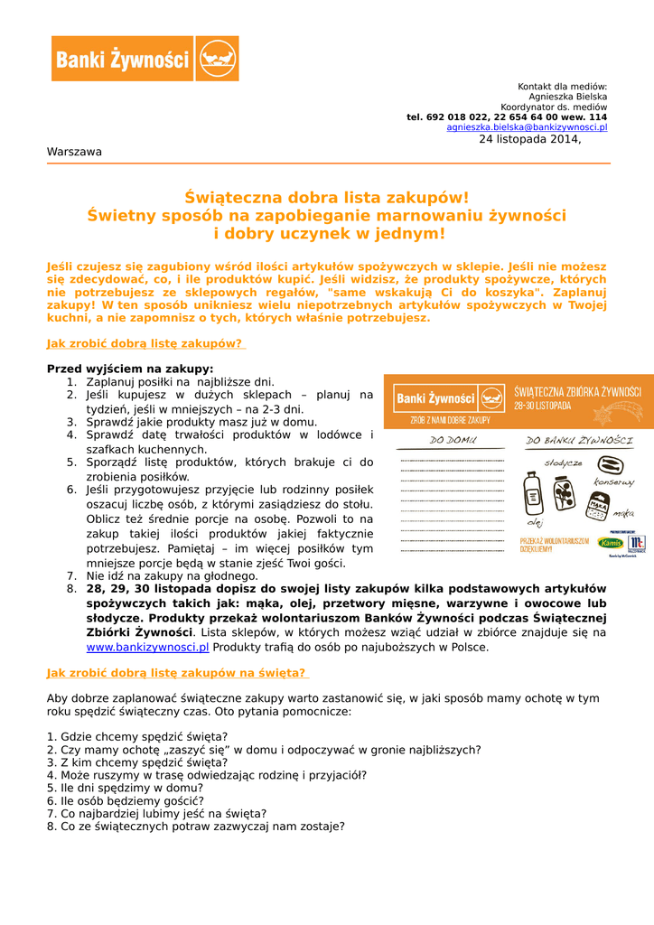 Kontakt dla mediów: Agnieszka Bielska Koordynator ds. mediów tel. 692 018 022, 22 654 64 00 wew. 114 [email protected] 24 listopada 2014, Warszawa Świąteczna dobra lista zakupów! Świetny sposób na zapobieganie marnowaniu żywności i dobry uczynek w jednym! Jeśli czujesz się zagubiony wśród ilości artykułów spożywczych w sklepie. Jeśli nie możesz się zdecydować, co, i ile produktów kupić. Jeśli widzisz, że produkty spożywcze, których nie potrzebujesz ze sklepowych regałów, "same wskakują Ci do koszyka". Zaplanuj zakupy! W ten sposób unikniesz wielu niepotrzebnych artykułów spożywczych w Twojej kuchni, a nie zapomnisz o tych, których właśnie potrzebujesz. Jak zrobić dobrą listę zakupów? Przed wyjściem na zakupy: 1. Zaplanuj posiłki na najbliższe dni. 2. Jeśli kupujesz w dużych sklepach – planuj na tydzień, jeśli w mniejszych – na 2-3 dni. 3. Sprawdź jakie produkty masz już w domu. 4. Sprawdź datę trwałości produktów w lodówce i szafkach kuchennych. 5. Sporządź listę produktów, których brakuje ci do zrobienia posiłków. 6. Jeśli przygotowujesz przyjęcie lub rodzinny posiłek oszacuj liczbę osób, z którymi zasiądziesz do stołu. Oblicz też średnie porcje na osobę. Pozwoli to na zakup takiej ilości produktów jakiej faktycznie potrzebujesz. Pamiętaj – im więcej posiłków tym mniejsze porcje będą w stanie zjeść Twoi gości. 7. Nie idź na zakupy na głodnego. 8. 28, 29, 30 listopada dopisz do swojej listy zakupów kilka podstawowych artykułów spożywczych takich jak: mąka, olej, przetwory mięsne, warzywne i owocowe lub słodycze. Produkty przekaż wolontariuszom Banków Żywności podczas Świątecznej Zbiórki Żywności. Lista sklepów, w których możesz wziąć udział w zbiórce znajduje się na www.bankizywnosci.pl Produkty trafią do osób po najuboższych w Polsce. Jak zrobić dobrą listę zakupów na święta? Aby dobrze zaplanować świąteczne zakupy warto zastanowić się, w jaki sposób mamy ochotę w tym roku spędzić świąteczny czas. Oto pytania pomocnicze: 1. 2. 3. 4. 5. 6. 7. 8. Gdzie chcemy spędzić święta? Czy mamy ochotę „zaszyć się” w domu i odpoczywać w gronie najbliższych? Z kim chcemy spędzić święta? Może ruszymy w trasę odwiedzając rodzinę i przyjaciół? Ile dni spędzimy w domu? Ile osób będziemy gościć? Co najbardziej lubimy jeść na święta? Co ze świątecznych potraw zazwyczaj nam zostaje? Następnie: 1. Oszacujmy liczbę gości oraz średnią wielkość porcji na osobę. Żeby tradycji stało się zadość należy spróbować każdej z 12 potraw. Dochowajmy tradycji ale zróbmy mniejsze, degustacyjne porcje – max. po 50 g/osobę, dzięki czemu po świętach nie wyrzucimy połowy jedzenia do kosza. 2. Zastanówmy się nad gustami kulinarnymi naszych bliskich, aby odpowiednio dobrać potrawy. Dania, które są mniej lubiane należy przygotować w mniejszej ilości. 3. Zaplanujmy jadłospis i na tej podstawie przygotujmy listę zakupów. Listy mogą być dwie: - jedna produktami trwałymi, które są niezbędne do przygotowywania potraw, takie jak: mąka, cukier, mak, bakalie, olej, soki, napoje, słodycze. Kiszoną kapustę na bigos; - druga z produktami nietrwałymi, które należy kupić bezpośrednio przed przygotowywaniem potraw. Do tych produktów należą: jaj, masło, mięso, wędliny, śmietana, owoce, warzywa, ryby; Federacja Polskich Banków Żywności jest organizacją pożytku publicznego (KRS 0000063599), której misją jest przeciwdziałanie marnowaniu żywności i niedożywieniu w Polsce. Federacja Polskich Banków Żywności zrzesza 31 Banków Żywności działających na terenie całego kraju. Banki Żywności udzielają codziennej, bezpłatnej pomocy żywnościowej blisko 3 600 organizacjom i instytucjom społecznym, za pośrednictwem których trafia ona do 1 300 000 osób najbardziej potrzebujących. W 2013 roku Banki Żywności przekazały łącznie 64 000 ton artykułów spożywczych.