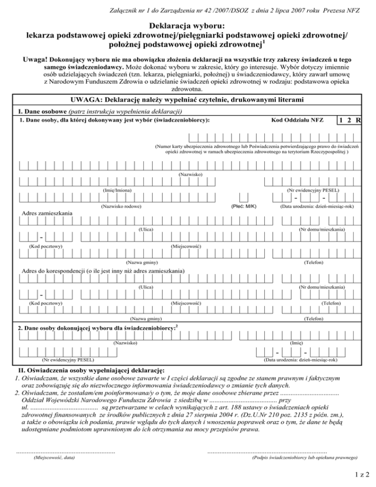 Załącznik nr 1 do Zarządzenia nr 42 /2007/DSOZ z dnia 2 lipca 2007 roku Prezesa NFZ Deklaracja wyboru: lekarza podstawowej opieki zdrowotnej/pielęgniarki podstawowej opieki zdrowotnej/ położnej podstawowej opieki zdrowotnej1 Uwaga! Dokonujący wyboru nie ma obowiązku złożenia deklaracji na wszystkie trzy zakresy świadczeń u tego samego świadczeniodawcy. Może dokonać wyboru w zakresie, który go interesuje. Wybór dotyczy imiennie osób udzielających świadczeń (tzn. lekarza, pielęgniarki, położnej) u świadczeniodawcy, który zawarł umowę z Narodowym Funduszem Zdrowia o udzielanie świadczeń opieki zdrowotnej w rodzaju: podstawowa opieka zdrowotna. UWAGA: Deklarację należy wypełniać czytelnie, drukowanymi literami I. Dane osobowe (patrz instrukcja wypełnienia deklaracji) 1. Dane osoby, dla której dokonywany jest wybór (świadczeniobiorcy): Kod Oddziału NFZ 1 2 R (Numer karty ubezpieczenia zdrowotnego lub Poświadczenia potwierdzającego prawo do świadczeń opieki zdrowotnej w ramach ubezpieczenia zdrowotnego na terytorium Rzeczypospolitej ) (Nazwisko) (Imię/Imiona) (Nr ewidencyjny PESEL) (Płeć: M/K) (Nazwisko rodowe) - (Data urodzenia: dzień-miesiąc-rok) Adres zamieszkania (Ulica) (Nr domu/mieszkania) (Kod pocztowy) (Miejscowość) (Nazwa gminy) (Telefon) Adres do korespondencji (o ile jest inny niż adres zamieszkania) (Ulica) (Nr domu/mieszkania) (Kod pocztowy) (Miejscowość) (Telefon) (Nazwa gminy) 2. Dane osoby dokonującej wyboru dla świadczeniobiorcy: (Telefon) 2 (Nazwisko) (Imię) (Nr ewidencyjny PESEL) - (Data urodzenia: dzień-miesiąc-rok) II. Oświadczenia osoby wypełniającej deklarację: 1. Oświadczam, że wszystkie dane osobowe zawarte w I części deklaracji są zgodne ze stanem prawnym i faktycznym oraz zobowiązuję się do niezwłocznego informowania świadczeniodawcy o zmianie tych danych. 2. Oświadczam, że zostałam/em poinformowana/y o tym, że moje dane osobowe zbierane przez .................................. Oddział Wojewódzki Narodowego Funduszu Zdrowia z siedzibą w ....................................... przy ul. ....................................... są przetwarzane w celach wynikających z art. 188 ustawy o świadczeniach opieki zdrowotnej finansowanych ze środków publicznych z dnia 27 sierpnia 2004 r. (Dz.U.Nr 210 poz. 2135 z późn. zm.), a także o obowiązku ich podania, prawie wglądu do tych danych i wnoszenia poprawek oraz o tym, że dane te będą udostępniane podmiotom uprawnionym do ich otrzymania na mocy przepisów prawa. ......................................................... (Miejscowość, data) ..................................................................... (Podpis świadczeniobiorcy lub opiekuna prawnego) 1z2 III. Deklaracja wyboru LEKARZA PODSTAWOWEJ OPIEKI ZDROWOTNEJ 3 1. Na podstawie art. 28 ust.1 ustawy o świadczeniach opieki zdrowotnej finansowanych ze środków publicznych z dnia 27 sierpnia 2004 r. (Dz. U. Nr 210, poz. 2135 z późn. zm.), deklaruję wybór: A L E K S A N D R A R O J K O W S K A (imię i nazwisko lekarza podstawowej opieki zdrowotnej) 2. W bieżącym roku dokonuję wyboru: 4 3. Deklarację składam w: - 4 po raz pierwszy miejscu pełnienia służby po raz drugi po raz kolejny Żołnierz Służby Zasadniczej - poborowy (POO ) 5 - (Data: dzień-miesiąc-rok) (Podpis świadczeniobiorcy lub opiekuna prawnego) (Pieczątka świadczeniodawcy z sygnaturą umowy z NFZ) (Podpis osoby przyjmującej deklarację) (Pieczątka firmowa świadczeniodawcy – miejsca udzielania świadczeń) IV. Deklaracja wyboru PIELĘGNIARKI PODSTAWOWEJ OPIEKI ZDROWOTNEJ 3 1. Na podstawie art. 28 ust.1 ustawy o świadczeniach opieki zdrowotnej finansowanych ze środków publicznych z dnia 27 sierpnia 2004 r. (Dz. U. Nr 210, poz. 2135 z późn. zm.), deklaruję wybór: (imię i nazwisko pielęgniarki podstawowej opieki zdrowotnej) 2. W bieżącym roku dokonuję wyboru: 4 3. Deklarację składam w: - 4 po raz pierwszy miejscu pełnienia służby po raz drugi po raz kolejny Żołnierz Służby Zasadniczej - poborowy (POO ) 5 - (Data: dzień-miesiąc-rok) (Podpis świadczeniobiorcy lub opiekuna prawnego) (Pieczątka świadczeniodawcy z sygnaturą umowy z NFZ) (Podpis osoby przyjmującej deklarację) (Pieczątka firmowa świadczeniodawcy – miejsca udzielania świadczeń) V. Deklaracja wyboru POŁOŻNEJ PODSTAWOWEJ OPIEKI ZDROWOTNEJ 3 1. Na podstawie art. 28 ust.1 ustawy o świadczeniach opieki zdrowotnej finansowanych ze środków publicznych z dnia 27 sierpnia 2004 r. (Dz. U. Nr 210, poz. 2135 z późn. zm.), deklaruję wybór: (proszę wpisać nazwisko i imię położnej podstawowej opieki zdrowotnej) 2. W bieżącym roku dokonuję wyboru: 4 - po raz pierwszy po raz drugi po raz kolejny - (Data: dzień-miesiąc-rok) (Podpis świadczeniobiorcy lub opiekuna prawnego) (Pieczątka świadczeniodawcy z sygnaturą umowy z NFZ) (Podpis osoby przyjmującej deklarację) (Pieczątka firmowa świadczeniodawcy - miejsca udzielania świadczeń) Objaśnienia: 1 niepotrzebne skreślić 2 wypełnić w przypadku gdy dane osobowe wyszczególnione w CZĘŚCI I.1 są inne niż dane wymagane w CZĘŚCI I.2 3 wypełnić w przypadku dokonania wyboru. 4 właściwe zakreślić znakiem ,,X" 5 Powszechny Obowiązek Obrony 2z2