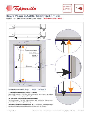 ® INSTRUKCJA POMIARU P R O D U K T U Roleta Vegas CLASSIC, tkaniny DZIEŃ/NOC POMIAR PRZY KANCIASTEJ LISTWIE PRZYSZYBOWEJ - WG WYMIARÓW KANTU Wzamówienia Wmateriału „NOC” listwa przyszybowa rama okna szyba Szamówienia Roleta materiałowa Vegas CLASSIC DZIEŃ/NOC S - szerokość zamówienia (listwa z kantem) Szerokość rolety CLASSIC DN mierzona jest jako szerokość kantów/skosów listew przyszybowych. W - wysokość zamówienia (listwa z kantem) Wysokość rolety CLASSIC DN mierzona jest od końca dolnej listwy przyszybowej do kantu górnej listwy. Wysokość materiału (w pozycji na „NOC”) mierzona jest od górnego punktu pomiaru do skosu/kantu dolnej listwy przyszybowej. www.tapparella.pl Zastrzegamy sobie możliwość wprowadzenia zmian technicznych. || Stan na 01.2015 Strona 1 z 2 ® INSTRUKCJA POMIARU P R O D U K T U Roleta Vegas CLASSIC, tkaniny DZIEŃ/NOC POMIAR PRZY ZAOKRĄGLONEJ LISTWIE PRZYSZYBOWEJ - WG WYMIARÓW CAŁKOWITYCH Wzamówienia Wmateriału „NOC” listwa przyszybowa rama okna szyba Szamówienia Roleta materiałowa Vegas CLASSIC DZIEŃ/NOC S - szerokość zamówienia (listwa zaokrąglona) Szerokość rolety CLASSIC DN mierzona jest jako szerokość zewnętrznych krawędzi listew przyszybowych. W - wysokość zamówienia (listwa zaokrąglona) Wysokość rolety CLASSIC DN mierzona jest jako wysokość zewnętrznych krawędzi listew przyszybowych. Wysokość materiału (w pozycji na „NOC”) mierzona jest od górnego punktu pomiaru do skosu/kantu dolnej listwy przyszybowej. www.tapparella.pl Zastrzegamy sobie możliwość wprowadzenia zmian technicznych. || Stan na 01.2015 Strona 2 z 2