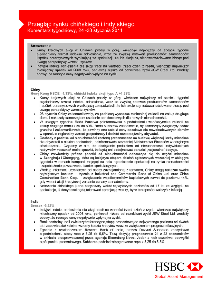 Przegl d rynku chi skiego i indyjskiego Komentarz tygodniowy, 24 -28 stycznia 2011 Streszczenie Kursy krajowych akcji w Chinach posz y w gór , wie cz c najwy szy od sze ciu tygodni pi ciodniowy wzrost indeksu odniesienia, wraz ze zwy k notowa producentów samochodów i spó ek przemys owych wynikaj c ze spekulacji, e ich akcje s niedowarto ciowane bior c pod uwag perspektywy wzrostu zysków. Indyjski indeks odniesienia dla akcji traci na warto ci trzeci dzie z rz du, wie cz c najwi kszy miesi czny spadek od 2008 roku, poniewa ni sze od oczekiwa zyski JSW Steel Ltd. zrodzi y obawy, e rosn ce ceny negatywnie wp yn na zyski. Chiny Hong Kong HSCEI -1,33%, chi ski indeks akcji typu A +1,38% Kursy krajowych akcji w Chinach posz y w gór , wie cz c najwy szy od sze ciu tygodni pi ciodniowy wzrost indeksu odniesienia, wraz ze zwy k notowa producentów samochodów i spó ek przemys owych wynikaj c ze spekulacji, e ich akcje s niedowarto ciowane bior c pod uwag perspektywy wzrostu zysków. 26 stycznia Chiny zakomunikowa y, e podnios wysoko minimalnej zaliczki na zakup drugiego domu i nakaza y samorz dom ustalenie cen docelowych dla nowych nieruchomo ci. W ubieg ym tygodniu Rada Pa stwa poinformowa a o podniesieniu wspó czynnika zaliczki na zakup drugiego domu z 50 do 60%. Rada Ministrów zaapelowa a, by samorz dy zwi kszy y poda gruntów i zakomunikowa a, e powinny one ustali ceny docelowe dla nowobudowanych domów w oparciu o regionalny wzrost gospodarczy i dochód rozporz dzalny obywateli. Dochody z podatku od nieruchomo ci zostan przeznaczone na budow wi kszej liczby mieszka dla obywateli o niskich dochodach, poinformowa o wcze niej Ministerstwo Finansów w odr bnym o wiadczeniu. Czytamy w nim, e obci enie podatkiem od nieruchomo ci indywidualnych nabywców mieszka mo e sprawi , e b d oni podejmowa bardziej racjonalne decyzje. Chiny zatwierdzi y próbne podatki od nieruchomo ci odnosz ce si do cz ci mieszka w Szanghaju i Chongqing, które s kolejnym etapem dzia a og oszonych wcze niej w ubieg ym tygodniu w ramach kampanii maj cej na celu ograniczenie spekulacji na rynku nieruchomo ci i zapobie enie powstawaniu baniek spekulacyjnych. Wed ug informacji uzyskanych od osoby zaznajomionej z tematem, Chiny mog nakaza swoim najwi kszym bankom cznie z Industrial and Commercial Bank of China Ltd. oraz China Construction Bank Corp. zwi kszenie wspó czynników kapita owych nawet do poziomu 14%, gdy wzrost akcji kredytowej zostanie uznany za nadmierny. Notowania chi skiego juana oscylowa y wokó najwy szych poziomów od 17 lat ze wzgl du na spekulacje, i decydenci b d tolerowa aprecjacj waluty, by w ten sposób walczy z inflacj . Indie Sensex -3,22% Indyjski indeks odniesienia dla akcji traci na warto ci trzeci dzie z rz du, wie cz c najwi kszy miesi czny spadek od 2008 roku, poniewa ni sze od oczekiwa zyski JSW Steel Ltd. zrodzi y obawy, e rosn ce ceny negatywnie wp yn na zyski. Bank centralny Indii zwi kszy referencyjn stop procentow do najwy szego poziomu od dwóch lat i zapowiedzia kolejne wzrosty kosztu kredytów wraz ze zwi kszeniem prognoz inflacyjnych. Zgodnie z o wiadczeniem Reserve Bank of India, prezes Duvvuri Subbarao zdecydowa o podniesieniu stopy repo z 6,25 do 6,5%. Tak decyzj prognozowa o 21 z 22 ekonomistów w ankiecie przeprowadzonej przez agencj Bloomberg News. Jeden z nich oczekiwa podwy ki o pó punktu procentowego. Subbarao podniós stop reverse repo z 5,25 do 5,5%. Subbarao poinformowa , e RBI prognozuje inflacj na poziomie 7% do dnia 31 marca, rewiduj c swoje wcze niejsze prognozy mówi ce o inflacji rz du 5,5%. Indyjska rupia przerwa a swój pi ciodniowy spadek po podwy ce stóp przez Reserve Bank of India i na skutek spekulacji, e zagraniczni inwestorzy dostarcz trzeciej najwi kszej azjatyckiej gospodarce zastrzyku funduszy, by skorzysta z jej przyspieszonego wzrostu. Inflacja cen ywno ci utrzymywa a si na poziomie ponad 15% przez czwarty tydzie z rz du, poniewa bank centralny podniós stopy procentowe, by z agodzi perspektyw wzrostu cen. Indeks obrazuj cy ceny hurtowe produktów rolnych wzrós o 15,57% w ko cz cym si tygodniu. Informacja prawna Niniejszy komentarz powsta na podstawie obserwacji i analiz przeprowadzonych przez spó k HSBC Global Asset Management, która jest cz ci Grupy HSBC. Dokument ten nale y traktowa wy cznie jako materia marketingowy, nie jest on natomiast ofert ani zach t lub zaproszeniem do nabycia lub udzia u w subskrypcji instrumentu finansowego; nie jest te porad ani rekomendacj inwestycyjn lub niezale n analiz finansow . Ze wzgl du na swoj specyfik inwestycje na rynkach wschodz cych s obarczone wi kszym ryzykiem i charakteryzuj si wi ksz zmienno ci cen ni inwestycje na rynkach w krajach rozwini tych. Na warto inwestycji mog równie wp ywa zmiany kursów walut, zw aszcza w przypadku inwestorów posiadaj cych papiery warto ciowe denominowane w walutach obcych. Wszelkie projekcje, prognozy lub cele dotycz ce przysz ych zysków lub poziomów cen zawarte w niniejszym dokumencie maj wy cznie charakter pogl dowy i nie s w aden sposób gwarantowane. Ani HSBC Global Asset Management ani HSBC Bank Polska SA nie ponosi adnej odpowiedzialno ci, je li te projekcje, prognozy lub cele oka si nietrafne. Niniejszy komentarz nie zast puje indywidualnej porady fachowej lokalnego doradcy inwestora. Komentarz jest przeznaczony wy cznie dla osób przebywaj cych na sta e w Polsce. Nie jest natomiast przeznaczony dla osób z innych krajów lub jurysdykcji, a w szczególno ci podmiotów lub osób b d cych rezydentami lub obywatelami Stanów Zjednoczonych Ameryki Pó nocnej jak równie nie jest przeznaczony dla osób z krajów lub jurysdykcji, które wprowadzi y zakaz b d ograniczenia rozpowszechniania materia ów analitycznych dla swoich obywateli. Warto inwestycji oraz dochodów uzyskiwanych z inwestycji mo e si zmniejszy lub zwi kszy . Wcze niejsze wyniki, symulacje lub prognozy nie s wiarygodnym wska nikiem przysz ych wyników. Informacje zamieszczone w niniejszym biulety