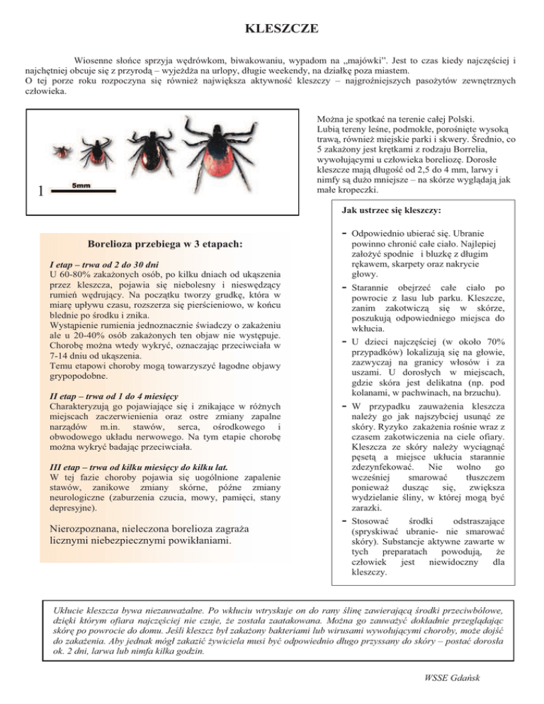 KLESZCZE Wiosenne s!o"ce sprzyja w#drówkom, biwakowaniu, wypadom na „majówki”. Jest to czas kiedy najcz#$ciej i najch#tniej obcuje si# z przyrod% – wyje&d&a na urlopy, d!ugie weekendy, na dzia!k# poza miastem. O tej porze roku rozpoczyna si# równie& najwi#ksza aktywno$' kleszczy – najgro(niejszych paso&ytów zewn#trznych cz!owieka. Mo&na je spotka' na terenie ca!ej Polski. Lubi% tereny le$ne, podmok!e, poro$ni#te wysok% traw%, równie& miejskie parki i skwery. )rednio, co 5 zaka&ony jest kr#tkami z rodzaju Borrelia, wywo!uj%cymi u cz!owieka borelioz#. Doros!e kleszcze maj% d!ugo$' od 2,5 do 4 mm, larwy i nimfy s% du&o mniejsze – na skórze wygl%daj% jak ma!e kropeczki. 1 Jak ustrzec si! kleszczy: - Odpowiednio ubiera' si#. Ubranie powinno chroni' ca!e cia!o. Najlepiej za!o&y' spodnie i bluzk# z d!ugim r#kawem, skarpety oraz nakrycie g!owy. - Starannie obejrze' ca!e cia!o po powrocie z lasu lub parku. Kleszcze, zanim zakotwicz% si# w skórze, poszukuj% odpowiedniego miejsca do wk!ucia. - U dzieci najcz#$ciej (w oko!o 70% przypadków) lokalizuj% si# na g!owie, zazwyczaj na granicy w!osów i za uszami. U doros!ych w miejscach, gdzie skóra jest delikatna (np. pod kolanami, w pachwinach, na brzuchu). - W przypadku zauwa&enia kleszcza nale&y go jak najszybciej usun%' ze skóry. Ryzyko zaka&enia ro$nie wraz z czasem zakotwiczenia na ciele ofiary. Kleszcza ze skóry nale&y wyci%gn%' p#set% a miejsce uk!ucia starannie zdezynfekowa'. Nie wolno go wcze$niej smarowa' t!uszczem poniewa& dusz%c si#, zwi#ksza wydzielanie $liny, w której mog% by' zarazki. - Stosowa' $rodki odstraszaj%ce (spryskiwa' ubranie- nie smarowa' skóry). Substancje aktywne zawarte w tych preparatach powoduj%, &e cz!owiek jest niewidoczny dla kleszczy. Borelioza przebiega w 3 etapach: I etap – trwa od 2 do 30 dni U 60-80% zaka&onych osób, po kilku dniach od uk%szenia przez kleszcza, pojawia si# niebolesny i niesw#dz%cy rumie" w#druj%cy. Na pocz%tku tworzy grudk#, która w miar# up!ywu czasu, rozszerza si# pier$cieniowo, w ko"cu blednie po $rodku i znika. Wyst%pienie rumienia jednoznacznie $wiadczy o zaka&eniu ale u 20-40% osób zaka&onych ten objaw nie wyst#puje. Chorob# mo&na wtedy wykry', oznaczaj%c przeciwcia!a w 7-14 dniu od uk%szenia. Temu etapowi choroby mog% towarzyszy' !agodne objawy grypopodobne. II etap – trwa od 1 do 4 miesi#cy Charakteryzuj% go pojawiaj%ce si# i znikaj%ce w ró&nych miejscach zaczerwienienia oraz ostre zmiany zapalne narz%dów m.in. stawów, serca, o$rodkowego i obwodowego uk!adu nerwowego. Na tym etapie chorob# mo&na wykry' badaj%c przeciwcia!a. III etap – trwa od kilku miesi#cy do kilku lat. W tej fazie choroby pojawia si# uogólnione zapalenie stawów, zanikowe zmiany skórne, pó(ne zmiany neurologiczne (zaburzenia czucia, mowy, pami#ci, stany depresyjne). Nierozpoznana, nieleczona borelioza zagra&a licznymi niebezpiecznymi powik!aniami. Uk!ucie kleszcza bywa niezauwa"alne. Po wk!uciu wtryskuje on do rany #lin$ zawieraj%c% #rodki przeciwbólowe, dzi$ki którym ofiara najcz$#ciej nie czuje, "e zosta!a zaatakowana. Mo"na go zauwa"y& dok!adnie przegl%daj%c skór$ po powrocie do domu. Je#li kleszcz by! zaka"ony bakteriami lub wirusami wywo!uj%cymi choroby, mo"e doj#& do zaka"enia. Aby jednak móg! zakazi& "ywiciela musi by& odpowiednio d!ugo przyssany do skóry – posta& doros!a ok. 2 dni, larwa lub nimfa kilka godzin. WSSE Gda'sk