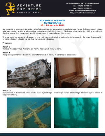 ALBANIA – SARANDA NURKOWANIE 13 – 20 sierpnia 2011 Nurkowania w okolicach Sarandy – albańskiego kurortu na najpiękniejszej riwierze Morza Śródziemnego. Miasto leży nad zatoką, u stóp amfiteatralnie opadających górskich zboczy. Okoliczne góry mają do 1500 m wysokości. Okolica usiana jest zabytkami greckimi, rzymskimi, bizantyjskimi i tureckimi. W programie nurkowania z brzegu, w tym m.in. na wrakach i w podwodnych kanionach. Do tego 3 wycieczki – w trakcie każdej odbędą się po dwa nurkowania z brzegu. Program: Dzień 1 Wylot z Warszawy lub Poznania do Korfu, nocleg w hotelu w Korfu. Dzień 2 Przeprawa promem do Sarandy, zakwaterowanie w hotelu w Sarandzie, czas wolny. Dni 3 – 4 Nurkowanie w Sarandzie, min. wraki kutra rybackiego i włoskiego okrętu szpitalnego zatopionego w czasie II wojny światowej. 1 Dzień 5 Wycieczka do Gjiri i Palermo, połączona z dwoma nurkowaniami. Dzień 6 Wycieczka do Butrind, Ciflik i Monastiri, połączona z dwoma nurkowaniami. 2 Dzień 7 Wycieczka do Gjirocastra i Libohova, połączona z nurkowaniem w Blue Eye, pionowej jaskini, z której wypływa krystalicznie czysta górska rzeka. Dzień 8 Przeprawa promem do Korfu, możliwość zwiedzenia miasta, wylot do Warszawy lub Poznania. W razie potrzeby punkty programu mogą być zmienione, a cena ponownie skalkulowana. 3 CENA WYNOSI: 1990 zł plus przelot CENA • • • • • • • • • • ZAWIERA: transport do hoteli, bilety na prom do/z Sarandy, pozostałe transfery, zakwaterowanie w hotelach klasy turystycznej, w pokojach 2-osobowych, trzy całodzienne wycieczki połączone z nurkowaniami, pakiet 9 nurkowań (dodatkowe nurkowania za dopłatą), butle 12l, balast, polskich przewodników i instruktorów pod wodą, opiekę przedstawiciela biura, ubezpieczenie biura podróży, ubezpieczenie turystyczne AXA – KL, NNW, bagaż. CENA NIE ZAWIERA: • przelotu międzynarodowego na Korfu (ok. 1200 – 1400 PLN) – w zależności od dostępności miejsc, możliwy wylot z Warszawy i Poznania, • wyżywienia, • wypożyczenia sprzętu nurkowego, • kursu nurkowego OWD, • ubezpieczenia nurkowego – 45 PLN. INFORMACJE DODATKOWE: ALBANIA (Republika Albanii) Stolica: Tirana Waluta: lek albański (ALL); Język urzędowy: albański WIZA, PRZEPISY WJAZDOWE. Obywatele RP mogą wjeżdżać bez wizy i przebywać na terytorium Albanii jednorazowo do 30 dni, zachowując prawo przedłużenia pobytu maksymalnie do 90 dni w okresie jednego roku. Formalności związanych z przedłużeniem pobytu można dopełnić w komisariacie policji właściwym dla miejsca pobytu. Od obywateli RP nie pobiera się granicznych opłat wjazdowych. Dotyczy to również kierowców tirów i autobusów. Nie wymaga się od turystów posiadania powrotnego biletu ani określonej kwoty pieniędzy. PRZEPISY CELNE. Nie ma specjalnych uregulowań dotyczących wwozu pieniędzy; wywóz pieniędzy ograniczony jest do kwoty 10 tys. EUR na osobę. Nie ma restrykcji celnych odbiegających od powszechnie przyjętych standardów. MELDUNEK. Nie ma obowiązku meldunkowego. UBEZPIECZENIE. Ubezpieczenie osobowe nie jest współpracujących z polskimi firmami ubezpieczeniowymi. obowiązkowe. W Albanii nie ma towarzystw SZCZEPIENIA, SŁUŻBA ZDROWIA. Od przyjeżdżających do Albanii nie wymaga się świadectwa szczepień ochronnych. W Tiranie i większych miastach powstały prywatne przychodnie lekarskie o dobrym poziomie diagnostycznym (bez możliwości hospitalizacji). Koszt wizyty wynosi ok. 20 – 30 EUR. INFORMACJE DLA KIEROWCÓW. Podróżujący samochodem powinni liczyć się z koniecznością wniesienia przy wyjeździe opłaty za korzystanie z dróg w wysokości 1 EUR za każdy dzień pobytu. Ponadto powinni mieć międzynarodowe prawo jazdy oraz ubezpieczenie OC – tzw. zieloną kartę. Uznawane są zielone karty wystawiane przez polskie towarzystwa ubezpieczeniowe. Ostatnio zmodernizowano część dróg głównych. Nie zaleca się poruszania po drogach po zmroku ze względu na nie oświetlonych użytkowników dróg (motocykle, rowery, piesi) oraz nie oznakowane i nie oświetlone przeszkody na drodze (m.in. otwarte studzienki kanalizacyjne). 4 BEZPIECZEŃSTWO. Należy zachować ostrożność z uwagi na możliwość kradzieży mienia lub samochodu. Do miejsc szczególnie niebezpiecznych zaliczyć można górskie tereny północnej Albanii. RELIGIA, OBYCZAJE. W Albanii obowiązują normy obyczajowe podobne do norm przyjętych w innych krajach bałkańskich. Na terenach wiejskich turystyka nie jest popularna, co niesie ze sobą pewne utrudnienia. Albania to kraj tolerancji religijnej, a kwestie natury religijnej nie stwarzają problemów przyjezdnym. ŚWIĘTA. Dniami wolnymi od pracy są początek i koniec muzułmańskiego postu ramadanu – tzw. Mały i Duży Bajram, ponadto Boże Narodzenie (obchodzone dwukrotnie: w grudniu wg wyznania katolickiego – 1 dzień, w styczniu wg wyznania prawosławnego – 1 dzień), Nowy Rok, 1 maja, 28 i 29 listopada – Święto Niepodległości. PRZYDATNE INFORMACJE: • Jest coraz więcej bankomatów, jednakże w większości tylko dla posiadaczy kart wydanych w Albanii. • Baza turystyczna jest słabo rozwinięta. W Tiranie można zatrzymać się w kilku hotelach o wysokim standardzie. Na wybrzeżu można skorzystać z pensjonatów. Brakuje pól namiotowych i kempingów. • Dyskomfortem – nie tylko dla turystów – są na terenie całej Albanii, a zwłaszcza na prowincji okresowe przerwy w dostawach energii elektrycznej i wody, dochodzące do kilku godzin na dobę. • Pewnym utrudnieniem jest niewydolna sieć telefoniczna i częste przeciążenia łączy internetowych. Sieć telefonii komórkowej nie obejmuje terenów północnych i górskich. • Znajomość języków obcych nie jest powszechna na prowincji. W dużych miastach można porozumieć się w języku włoskim lub angielskim, a na południu kraju także greckim. • Urzędy pracują w okresie letnim w godzinach 8.00 – 14.