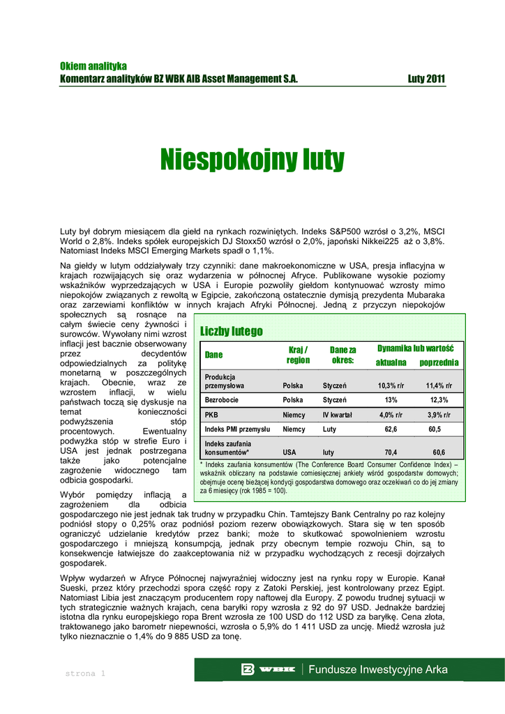 Okiem analityka Komentarz analityków BZ WBK AIB Asset Management S.A. Luty 2011 Niespokojny luty Luty był dobrym miesiącem dla giełd na rynkach rozwiniętych. Indeks S&P500 wzrósł o 3,2%, MSCI World o 2,8%. Indeks spółek europejskich DJ Stoxx50 wzrósł o 2,0%, japoński Nikkei225 aŜ o 3,8%. Natomiast Indeks MSCI Emerging Markets spadł o 1,1%. Na giełdy w lutym oddziaływały trzy czynniki: dane makroekonomiczne w USA, presja inflacyjna w krajach rozwijających się oraz wydarzenia w północnej Afryce. Publikowane wysokie poziomy wskaźników wyprzedzających w USA i Europie pozwoliły giełdom kontynuować wzrosty mimo niepokojów związanych z rewoltą w Egipcie, zakończoną ostatecznie dymisją prezydenta Mubaraka oraz zarzewiami konfliktów w innych krajach Afryki Północnej. Jedną z przyczyn niepokojów społecznych są rosnące na całym świecie ceny Ŝywności i Liczby lutego surowców. Wywołany nimi wzrost inflacji jest bacznie obserwowany Dynamika lub wartość Kraj / Dane za przez decydentów Dane region okres: aktualna poprzednia odpowiedzialnych za politykę monetarną w poszczególnych Produkcja krajach. Obecnie, wraz ze przemysłowa Polska Styczeń 10,3% r/r 11,4% r/r wzrostem inflacji, w wielu Bezrobocie Polska Styczeń 13% 12,3% państwach toczą się dyskusje na temat konieczności PKB Niemcy IV kwartał 4,0% r/r 3,9% r/r podwyŜszenia stóp Indeks PMI przemysłu Niemcy Luty 62,6 60,5 procentowych. Ewentualny podwyŜka stóp w strefie Euro i Indeks zaufania USA jest jednak postrzegana konsumentów* USA luty 70,4 60,6 takŜe jako potencjalne * Indeks zaufania konsumentów (The Conference Board Consumer Confidence Index) – zagroŜenie widocznego tam wskaźnik obliczany na podstawie comiesięcznej ankiety wśród gospodarstw domowych; odbicia gospodarki. obejmuje ocenę bieŜącej kondycji gospodarstwa domowego oraz oczekiwań co do jej zmiany za 6 miesięcy (rok 1985 = 100). Wybór pomiędzy inflacją a zagroŜeniem dla odbicia gospodarczego nie jest jednak tak trudny w przypadku Chin. Tamtejszy Bank Centralny po raz kolejny podniósł stopy o 0,25% oraz podniósł poziom rezerw obowiązkowych. Stara się w ten sposób ograniczyć udzielanie kredytów przez banki; moŜe to skutkować spowolnieniem wzrostu gospodarczego i mniejszą konsumpcją, jednak przy obecnym tempie rozwoju Chin, są to konsekwencje łatwiejsze do zaakceptowania niŜ w przypadku wychodzących z recesji dojrzałych gospodarek. Wpływ wydarzeń w Afryce Północnej najwyraźniej widoczny jest na rynku ropy w Europie. Kanał Sueski, przez który przechodzi spora część ropy z Zatoki Perskiej, jest kontrolowany przez Egipt. Natomiast Libia jest znaczącym producentem ropy naftowej dla Europy. Z powodu trudnej sytuacji w tych strategicznie waŜnych krajach, cena baryłki ropy wzrosła z 92 do 97 USD. JednakŜe bardziej istotna dla rynku europejskiego ropa Brent wzrosła ze 100 USD do 112 USD za baryłkę. Cena złota, traktowanego jako barometr niepewności, wzrosła o 5,9% do 1 411 USD za uncję. Miedź wzrosła juŜ tylko nieznacznie o 1,4% do 9 885 USD za tonę. strona 1 Okiem Analityka Komentarz analityków BZ WBK AIB Asset Management S.A. Wzrost cen ropy korzystny dla Rosji Sytuacja w Libii i wywołany nią wzrost cen ropy naftowej, przełoŜył się na zachowanie rynków akcji w naszym regionie. Najlepiej radziła sobie Rosja – w której kluczową rolę odgrywają spółki surowcowe, Index MICEX zakończył miesiąc wzrostem o 3,2%. Umocnił się takŜe rosyjski rubel. Zgoła odmienne nastroje panowały w Turcji. Po dość słabym styczniu, w lutym inwestorzy dalej wycofywali środki z rynku akcji w obawie, Ŝe wysokie ceny ropy wpłyną niekorzystnie na bilans handlowy tego kraju. Dodatkowo pewna część tureckiego eksportu trafia do krajów północnej Afryki i Bliskiego Wschodu, choć akurat udział Libii jest nieduŜy. Wiele tureckich firm, zwłaszcza z sektora budowlanego, realizuje za to sporo kontraktów w Afryce. Właśnie te spółki naleŜały do najbardziej przecenianych w lutym. Ostatecznie indeks giełdy w Stambule spadł w lutym o 3,2%. NaleŜy jednak pamiętać, Ŝe spadki nie są poparte zmieniającymi się fundamentami tureckiej gospodarki. Wraz z unormowaniem się nastrojów na Bliskim Wschodzie moŜemy spodziewać się powrotu inwestorów do Turcji i dynamicznego odbicia na tamtejszym rynku. Od początku marca moŜemy zauwaŜyć juŜ odwrócenie tendencji. Rynek turecki dynamicznie odbija mimo spadków na innych rynkach. Rynek Polski Sytuacja na polskim rynku w lutym była pokłosiem nastrojów panujących na rynkach światowych. Niepokoje w Afryce Północnej obniŜały skłonność do ryzyka inwestorów takŜe na polskim rynku. Pod koniec miesiąca na polskim rynku było zauwaŜalne odbicie i oŜywienie inwestorów. Ostatecznie luty zakończył się umiarkowanymi wzrostami. Indeks WIG20 wzrósł o 0,5%, indeks mWIG40 wzrósł o 1,6%, indeks sWIG80 wzrósł o 1,8%. Indeks szerokiego rynku WIG wzrósł o 0,8%. W lutym polskie spółki zaczynają publikować sprawozdania za IV kwartał oraz za cały poprzedni rok. Większość publikacji przypada jednak na marzec. Ze spółek, które zaraportowały dotychczas moŜemy mówić o pozytywnym zaskoczeniu w bankach (Millenium, BZ WBK) oraz w spółkach z sektora chemicznego (Police, Puławy). Poza kilkoma przypadkami spółki jak na razie publikują w większości wyniki zgodne z oczekiwaniami, jednak musimy poczekać do marca na ostateczne wyniki całego rynku. Rynek długu Luty przyniósł kontynuacje wzrostu rentowności (spadek cen obligacji) na największych rynkach długu - zarówno w USA, jak i w Europie. Wzrost rentowności naleŜy wiązać z napływem na rynek kolejnych informacji potwierdzających bardzo dobra kondycję niemieckiej gospodarki i oŜywienie w USA. W Niemczech Produkt Krajowy Brutto wzrósł w IV kwartale o 4% w skali roku, a rekordowo wysokie wskaźniki optymizmu przedsiębiorców oraz spada