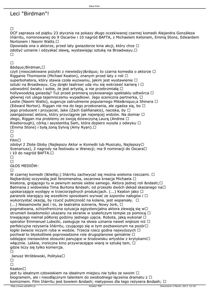 Odra-Film Leci "Birdman"! DCF zaprasza od piątku 23 stycznia na pokazy długo oczekiwanej czarnej komedii Alejandra Gonzáleza Ińárritu, nominowanej do 9 Oscarów i 10 nagród BAFTA, z Michaelem Ketonem, Emmą Stone, Edwardem Nortonem i Naomi Watts. Opowiada ona o aktorze, przed laty gwiazdorze kina akcji, który chce zdobyć uznanie i odzyskać sławę, wystawiając sztukę na Broadwayu. „Birdman, czyli (nieoczekiwane pożytki z niewiedzy)” to czarna komedia o aktorze Rigganie Thomsonie (Michael Keaton), znanym przed laty z roli superbohatera, który stawia czoła wyzwaniu, jakim jest wystawienie sztuki na Broadwayu. Czy dzięki teatrowi uda mu się wskrzesić karierę i udowodnić światu i sobie, że jest artystą, a nie przebrzmiałą hollywoodzką gwiazdą? Tuż przed premierą szykowanego spektaklu odtwórca głównej roli ulega tajemniczemu wypadkowi. Jego sceniczna partnerka, Leslie (Naomi Watts), sugeruje zatrudnienie popularnego Mike’a Shinera (Edward Norton). Riggan nie ma do tego przekonania, ale zgadza się, bo jego producent i przyjaciel, Jake (Zach Galifianakis), naciska, by zaangażować aktora, który przyciągnie jak najwięcej widzów. Na domiar złego, Riggan ma problemy ze swoją dziewczyną Laurą (Andrea Riseborough), córką i asystentką Sam, która dopiero wyszła z odwyku (Emma Stone) i byłą żoną Sylvią (Amy Ryan). Film zdobył 2 Złote Globy (Najlepszy Aktor w Komedii lub Musicalu, Najlepszy Scenariusz), 2 nagrody na festiwalu w Wenecji; ma 9 nominacji do Oscara i 10 do nagród BAFTA. GŁOS MEDIÓW: W czarnej komedii (…) Ińárritu zachwycać się można wieloma rzeczami. Najbardziej oczywistą jest fenomenalna, oscarowa kreacja Michaela Keatona, grającego tu w pewnym sensie siebie samego. Aktora jednej roli – Batmana z widowiska Tima Burtona – od przeszło dwóch dekad skazanego na upokarzające występy w trzeciorzędnych produkcjach. (...) Keaton jako paranoik starający się wszelkimi sposobami wyrwać ze szponów nałogów i wykorzystać okazję, by rzucić publiczność na kolana, jest wspaniały. (...) Niesamowite jest i to, że teatralna sceneria, Nowy Jork, pogmatwana, schizofreniczna sytuacja egzystencjalna aktora zlewają się w strumień świadomości ukazany na ekranie w szaleńczym tempie za pomocą trwającego niemal półtorej godziny jednego ujęcia. Robota, jaką wykonał operator Emmanuel Lubezki, zasługuje na słowa uznania nawet większe niż perfekcyjna reżyseria Ińárritu, czującego się w tym pozbawionym na pozór logiki świecie niczym ryba w wodzie. Trzecia rzecz godna najwyższych pochwał to błyskotliwie poprowadzone role drugoplanowe genialnie oddające nienawistne stosunki panujące w środowisku artystów z krytykami włącznie. Lekkie, ironiczne kino przywracające wiarę w sztukę tam, gdzie liczy się tylko komercja. Janusz Wróblewski, Polityka Keaton jest tu idealnym człowiekiem na idealnym miejscu nie tylko ze swoim biogramem, ale i nieodłącznym talentem do swobodnego łączenia dramatu z komizmem. Film Ińárritu jest bowiem – nietypowo dla tego reżysera – http://www.odrafilm.pl Kreator PDF Utworzono 2 March, 2017, 01:42 Odra-Film komedią. Czarną, bolesną i domagającą się przedrostka „tragi-”, ale jednak komedią. (...) Ińárritu pokazuje tu rozdźwięk między światami aktorów a celebrytów, między nowojorską śmietanką a Hollywoodzkim motłochem. To jak młot i kowadło, między którymi utknął bohater, żywiący ambicje o tworzeniu sztuki przez duże „S”, ale nie mogący uciec od pokusy powrotu do świata blockbusterów. (...) Z realizacyjnego punktu jest to prawdziwy majstersztyk, wrażenie robi niemal wszystko: praca kamery, inscenizacja, logistyka, ścieżka dźwiękowa wykorzystująca jedynie perkusję (bębniarz zresztą co jakiś czas sam pojawia się w kadrze)… Ale Ińárritu nie interesuje techniczny popis sam w sobie. Jego stylistyczny koncept doskonale sprawdza się jako zapośredniczenie doświadczenia bohatera. Jakub Popielecki, Filmweb Twórcom udało się uzyskać prawdziwe uczucie teatralnej przestrzeni. Zmiany czasowe odbywają się bez cięcia, imitując nieprzerwany spektakl i monolog wewnętrzny bohatera. Dzięki płynnej formie wizualnej film może być oglądany na wielu niezależnych poziomach: jako bezlitosna satyra na show-biznes wypełniona po brzegi branżowymi żartami, przejmujący portret wypalonego człowieka pochłanianego przez własne demony i metaforyczna przypowieść o cenie prawdziwej sztuki. Marek Baranowski, Stopklatka Zwiastun: http://youtu.be/8wM86-LAItg Ińárritu przyznaje, że wewnętrzna walka Riggana i jego pragnienie zostania docenionym są mu bliskie: „Pragnąłem zrobić film o walce z własnym ego i o sukcesie. Nieważne, czy pragniemy pieniędzy czy uznania – to tylko chwilowa iluzja. Satysfakcja i duma powinny wynikać z nas samych – szukając poważania tylko u innych, w końcu zdajemy sobie sprawę z tego, że to za mało. Riggan przeżywa ludzkie dylematy, z którymi zmaga się każdy z nas. Widzę go jako współczesnego Don Kichota. Nie radzi sobie z otaczającą go rzeczywistością i żyje w świecie swoich wyobrażeń, a humor wynika z cierpienia, którego doznaje. Film o Rigganie jest filmem o każdym z nas. Lubię snuć historie o bohaterach, którzy mają wady i problemy, bo z takimi postaciami możemy się identyfikować. Riggan całe życie mylił miłość z podziwem. Kiedy wreszcie zrozumiał, że to drugie jest nieważne, desperacko zapragnął bliskości i uświadomił sobie, jak trudno kochać siebie i innych.” Michael Keaton: „Przygotowując się do roli, spojrzałem na mojego bohatera jak na zwykłego człowieka. To niełatwe zadanie. Aktorzy słyną z wybujałego ego – Riggan ma ogromny problem z samoświadomością, dumą, potrzebą uznania.”. Granica między rzeczywistością a iluzją jest dla Riggana bardzo cienka, a często wręcz zanika. Na każdym kroku towarzyszy mu cie