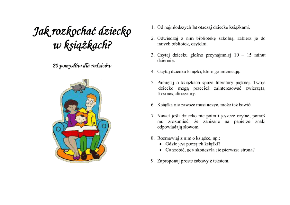 Jak rozkochać dziecko w książkach? 20 pomysłów dla rodziców 1. Od najmłodszych lat otaczaj dziecko książkami. 2. Odwiedzaj z nim bibliotekę szkolną, zabierz je do innych bibliotek, czytelni. 3. Czytaj dziecku głośno przynajmniej 10 – 15 minut dziennie. 4. Czytaj dziecku książki, które go interesują. 5. Pamiętaj o książkach spoza literatury pięknej. Twoje dziecko mogą przecież zainteresować zwierzęta, kosmos, dinozaury. 6. Książka nie zawsze musi uczyć, może też bawić. 7. Nawet jeśli dziecko nie potrafi jeszcze czytać, pomóż mu zrozumieć, że zapisane na papierze znaki odpowiadają słowom. 8. Rozmawiaj z nim o książce, np.: Gdzie jest początek książki? Co zrobić, gdy skończyła się pierwsza strona? 9. Zaproponuj proste zabawy z tekstem. 10.W rozmowach z dzieckiem używaj takich określeń jak: książka, rozdział, tytuł, autor, ilustracja, wiersz, opowiadanie, treść, bohater. 11.Nie zmuszaj dziecka do słuchania, jeśli straciło na to ochotę. 12.Zwracaj uwagę dziecka na ilustracje, które często niosą dodatkowe informacje. Opiszcie z dzieckiem na podstawie ilustracji np. bohatera lub otoczenie, w którym przebywa. 13.Nie ustalaj z góry czasu pracy nad książką. Dziecko wyczuje przymus i zamiast polubić czytanie może się zniechęcić. 14.Pokaż dziecku, że czytanie jest także twoją przyjemnością i jest dla ciebie ważne. Możecie ustalić czas wspólnego czytania i czas lektury indywidualnej. 16.Naucz dziecko szanować książki. Myć ręce przed czytaniem, odkładać na półkę. 17.Znajdź też czas na czytanie lektur ze starszym dzieckiem i rozmowę o nich. 18.Zaproponuj dziecku aby po przeczytaniu tytułu, tytułów rozdziałów, obejrzeniu ilustracji odgadło o czym będzie książka. Czytanie będzie służyło sprawdzeniu czy dziecko miało rację. 19.Pomóż dziecku zrozumieć tekst, wyodrębnić główne postaci, przyczyny i skutki zdarzeń, główne wątki. 20.Postaraj się jak najwcześniej przygotować dziecko do lektury różnych tekstów: literackich, informacyjnych, książek, czasopism. Pokaż dziecku, że czasem tylko wyszukujemy informacje, a czasem czytamy dokładnie. Opracowanie: 15.Pokaż dziecku, że za pomocą lektury rozwiązujesz codzienne problemy. Razem z dzieckiem: Przeczytajcie jaki film możecie dziś obejrzeć Zróbcie sałatkę według przepisu z książki kucharskiej Krystyna Dobosz Ewa Bogucka