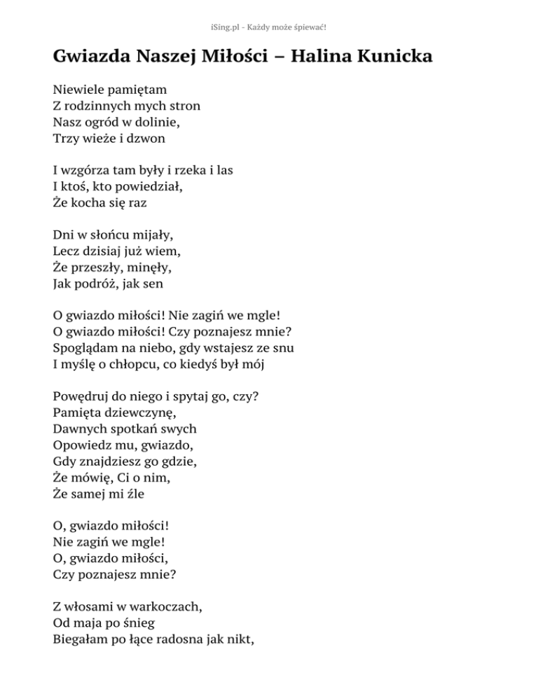 iSing.pl - Każdy może śpiewać! Gwiazda Naszej Miłości – Halina Kunicka Niewiele pamiętam Z rodzinnych mych stron Nasz ogród w dolinie, Trzy wieże i dzwon I wzgórza tam były i rzeka i las I ktoś, kto powiedział, Że kocha się raz Dni w słońcu mijały, Lecz dzisiaj już wiem, Że przeszły, minęły, Jak podróż, jak sen O gwiazdo miłości! Nie zagiń we mgle! O gwiazdo miłości! Czy poznajesz mnie? Spoglądam na niebo, gdy wstajesz ze snu I myślę o chłopcu, co kiedyś był mój Powędruj do niego i spytaj go, czy? Pamięta dziewczynę, Dawnych spotkań swych Opowiedz mu, gwiazdo, Gdy znajdziesz go gdzie, Że mówię, Ci o nim, Że samej mi źle O, gwiazdo miłości! Nie zagiń we mgle! O, gwiazdo miłości, Czy poznajesz mnie? Z włosami w warkoczach, Od maja po śnieg Biegałam po łące radosna jak nikt, Bo przy mnie był chłopiec, W górze byłaś Ty La la la la la la La la la la la La la la la la la La la la la la O gwiazdo miłości! Nie zagiń we mgle! O, gwiazdo miłości! Do snu kołysz mnie, Kołysz mnie, kołysz mnie! Słowa: brak danych Muzyka: brak danych Rok wydania: brak danych Płyta: brak danych