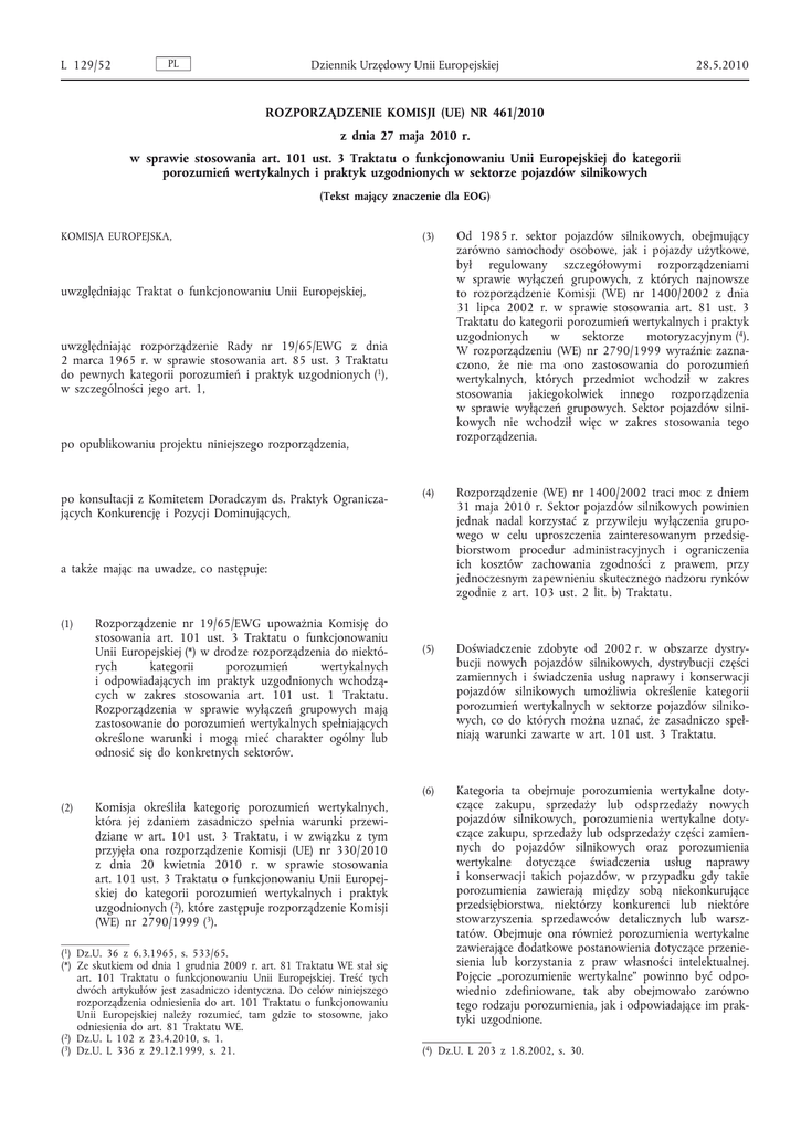 L 129/52 PL Dziennik Urzędowy Unii Europejskiej 28.5.2010 ROZPORZĄDZENIE KOMISJI (UE) NR 461/2010 z dnia 27 maja 2010 r. w sprawie stosowania art. 101 ust. 3 Traktatu o funkcjonowaniu Unii Europejskiej do kategorii porozumień wertykalnych i praktyk uzgodnionych w sektorze pojazdów silnikowych (Tekst mający znaczenie dla EOG) KOMISJA EUROPEJSKA, (3) Od 1985 r. sektor pojazdów silnikowych, obejmujący zarówno samochody osobowe, jak i pojazdy użytkowe, był regulowany szczegółowymi rozporządzeniami w sprawie wyłączeń grupowych, z których najnowsze to rozporządzenie Komisji (WE) nr 1400/2002 z dnia 31 lipca 2002 r. w sprawie stosowania art. 81 ust. 3 Traktatu do kategorii porozumień wertykalnych i praktyk uzgodnionych w sektorze motoryzacyjnym (4). W rozporządzeniu (WE) nr 2790/1999 wyraźnie zazna czono, że nie ma ono zastosowania do porozumień wertykalnych, których przedmiot wchodził w zakres stosowania jakiegokolwiek innego rozporządzenia w sprawie wyłączeń grupowych. Sektor pojazdów silni kowych nie wchodził więc w zakres stosowania tego rozporządzenia. (4) Rozporządzenie (WE) nr 1400/2002 traci moc z dniem 31 maja 2010 r. Sektor pojazdów silnikowych powinien jednak nadal korzystać z przywileju wyłączenia grupo wego w celu uproszczenia zainteresowanym przedsię biorstwom procedur administracyjnych i ograniczenia ich kosztów zachowania zgodności z prawem, przy jednoczesnym zapewnieniu skutecznego nadzoru rynków zgodnie z art. 103 ust. 2 lit. b) Traktatu. (5) Doświadczenie zdobyte od 2002 r. w obszarze dystry bucji nowych pojazdów silnikowych, dystrybucji części zamiennych i świadczenia usług naprawy i konserwacji pojazdów silnikowych umożliwia określenie kategorii porozumień wertykalnych w sektorze pojazdów silniko wych, co do których można uznać, że zasadniczo speł niają warunki zawarte w art. 101 ust. 3 Traktatu. (6) Kategoria ta obejmuje porozumienia wertykalne doty czące zakupu, sprzedaży lub odsprzedaży nowych pojazdów silnikowych, porozumienia wertykalne doty czące zakupu, sprzedaży lub odsprzedaży części zamien nych do pojazdów silnikowych oraz porozumienia wertykalne dotyczące świadczenia usług naprawy i konserwacji takich pojazdów, w przypadku gdy takie porozumienia zawierają między sobą niekonkurujące przedsiębiorstwa, niektórzy konkurenci lub niektóre stowarzyszenia sprzedawców detalicznych lub warsz tatów. Obejmuje ona również porozumienia wertykalne zawierające dodatkowe postanowienia dotyczące przenie sienia lub korzystania z praw własności intelektualnej. Pojęcie „porozumienie wertykalne” powinno być odpo wiednio zdefiniowane, tak aby obejmowało zarówno tego rodzaju porozumienia, jak i odpowiadające im prak tyki uzgodnione. uwzględniając Traktat o funkcjonowaniu Unii Europejskiej, uwzględniając rozporządzenie Rady nr 19/65/EWG z dnia 2 marca 1965 r. w sprawie stosowania art. 85 ust. 3 Traktatu do pewnych kategorii porozumień i praktyk uzgodnionych (1), w szczególności jego art. 1, po opublikowaniu projektu niniejszego rozporządzenia, po konsultacji z Komitetem Doradczym ds. Praktyk Ogranicza jących Konkurencję i Pozycji Dominujących, a także mając na uwadze, co następuje: (1) (2) Rozporządzenie nr 19/65/EWG upoważnia Komisję do stosowania art. 101 ust. 3 Traktatu o funkcjonowaniu Unii Europejskiej (*) w drodze rozporządzenia do niektó rych kategorii porozumień wertykalnych i odpowiadających im praktyk uzgodnionych wchodzą cych w zakres stosowania art. 101 ust. 1 Traktatu. Rozporządzenia w sprawie wyłączeń grupowych mają zastosowanie do porozumień wertykalnych spełniających określone warunki i mogą mieć charakter ogólny lub odnosić się do konkretnych sektorów. Komisja określiła kategorię porozumień wertykalnych, która jej zdaniem zasadniczo spełnia warunki przewi dziane w art. 101 ust. 3 Traktatu, i w związku z tym przyjęła ona rozporządzenie Komisji (UE) nr 330/2010 z dnia 20 kwietnia 2010 r. w sprawie stosowania art. 101 ust. 3 Traktatu o funkcjonowaniu Unii Europej skiej do kategorii porozumień wertykalnych i praktyk uzgodnionych (2), które zastępuje rozporządzenie Komisji (WE) nr 2790/1999 (3). (1) Dz.U. 36 z 6.3.1965, s. 533/65. (*) Ze skutkiem od dnia 1 grudnia 2009 r. art. 81 Traktatu WE stał się art. 101 Traktatu o funkcjonowaniu Unii Europejskiej. Treść tych dwóch artykułów jest zasadniczo identyczna. Do celów niniejszego rozporządzenia odniesienia do art. 101 Traktatu o funkcjonowaniu Unii Europejskiej należy rozumieć, tam gdzie to stosowne, jako odniesienia do art. 81 Traktatu WE. (2) Dz.U. L 102 z 23.4.2010, s. 1. (3) Dz.U. L 336 z 29.12.1999, s. 21. (4) Dz.U. L 203 z 1.8.2002, s. 30. 28.5.2010 PL Dziennik Urzędowy Unii Europejskiej (7) Pewne rodzaje porozumień mogą poprawiać efektywność gospodarczą w ramach danej sieci produkcji lub dystry bucji przez umożliwienie lepszej koordynacji między działającymi w niej przedsiębiorstwami. W szczególności mogą one prowadzić do obniżenia kosztów transakcji i dystrybucji ponoszonych przez strony porozumienia oraz do optymalizacji ich poziomów sprzedaży i inwestycji. (8) Prawdopodobieństwo, że takie wzmacniające efektyw ność skutki przeważą nad skutkami antykonkurencyj nymi spowodowanymi ograniczeniami zawartymi w porozumieniach wertykalnych, zależy od skali władzy rynkowej stron porozumienia i stąd od stopnia, do jakiego przedsiębiorstwa te konkurują z innymi dostaw cami towarów lub usług uważanych przez ich klientów za wzajemnie zamienne lub za substytucyjne z uwagi na ich cechy, ceny i zamierzone przeznaczenie. Porozu mienia wertykalne zawierające ograniczenia, które najprawdopodobniej będą ograniczać konkurencję i szkodzić konsumentom lub które nie są niezbędne do osiągnięcia skutków poprawiających wydajność, nie powinny korzystać z przywileju wyłączenia grupowego. (9) (10) Aby ustalić właściwy zakres stosowani