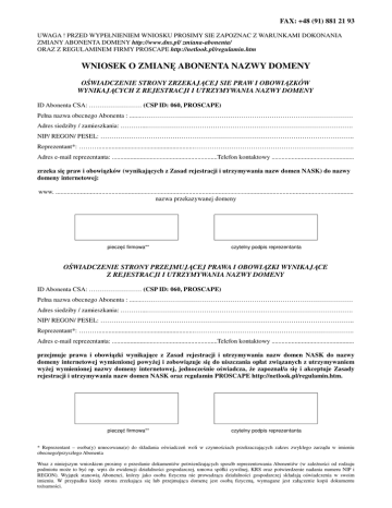 FAX: +48 (91) 881 21 93 UWAGA ! PRZED WYPEŁNIENIEM WNIOSKU PROSIMY SIE ZAPOZNAC Z WARUNKAMI DOKONANIA ZMIANY ABONENTA DOMENY http://www.dns.pl/ zmiana-abonenta/ ORAZ Z REGULAMINEM FIRMY PROSCAPE http://netlook.pl/regulamin.htm WNIOSEK O ZMIANĘ ABONENTA NAZWY DOMENY OŚWIADCZENIE STRONY ZRZEKAJĄCEJ SIE PRAW I OBOWIĄZKÓW WYNIKAJĄCYCH Z REJESTRACJI I UTRZYMYWANIA NAZWY DOMENY ID Abonenta CSA: …………………… (CSP ID: 060, PROSCAPE) Pełna nazwa obecnego Abonenta : ........…………………………………………………………………………………… Adres siedziby / zamieszkania: .………...…………………………………………………………………………………. NIP/ REGON/ PESEL: …………………………………………………………………………………………………….. Reprezentant*: ………..........................................................………………………………………………………………. Adres e-mail reprezentanta: ................................................................Telefon kontaktowy .................................................. zrzeka się praw i obowiązków (wynikających z Zasad rejestracji i utrzymywania nazw domen NASK) do nazwy domeny internetowej: www. ..................................................................................................................................................................................... nazwa przekazywanej domeny pieczęć firmowa** czytelny podpis reprezentanta OŚWIADCZENIE STRONY PRZEJMUJĄCEJ PRAWA I OBOWIĄZKI WYNIKAJĄCE Z REJESTRACJI I UTRZYMYWANIA NAZWY DOMENY ID Abonenta CSA: …………………… (CSP ID: 060, PROSCAPE) Pełna nazwa obecnego Abonenta : ........…………………………………………………………………………………… Adres siedziby / zamieszkania: .………...…………………………………………………………………………………. NIP/ REGON/ PESEL: …………………………………………………………………………………………………….. Reprezentant*: ………..........................................................………………………………………………………………. Adres e-mail reprezentanta: ................................................................Telefon kontaktowy .................................................. przejmuje prawa i obowiązki wynikające z Zasad rejestracji i utrzymywania nazw domen NASK do nazwy domeny internetowej wymienionej powyżej i zobowiązuje się do uiszczania opłat związanych z utrzymywaniem wyżej wymienionej nazwy domeny internetowej, jednocześnie oświadcza, że zapoznał/a się i akceptuje Zasady rejestracji i utrzymywania nazw domen NASK oraz regulamin PROSCAPE http://netlook.pl/regulamin.htm. pieczęć firmowa** czytelny podpis reprezentanta * Reprezentant – osoba(y) umocowana(e) do składania oświadczeń woli w czynnościach przekraczających zakres zwykłego zarządu w imieniu obecnego/przyszłego Abonenta Wraz z niniejszym wnioskiem prosimy o przesłanie dokumentów potwierdzających sposób reprezentowania Abonentów (w zależności od rodzaju podmiotu może to być np. wpis do ewidencji działalności gospodarczej, umowa spółki cywilnej, KRS oraz potwierdzenie nadania numeru NIP i REGON). Wyjątek stanowią Abonenci, którzy jako osoba fizyczna nie prowadząca działalności gospodarczej składają oświadczenia w swoim imieniu. W przypadku kiedy strona zrzekająca się lub przejmująca domenę jest osobą fizyczną, wymagane jest załączenie kopii dokumentu tożsamości.