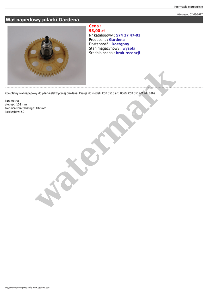 Informacje o produkcie Utworzono 02-03-2017 Wał napędowy pilarki Gardena Cena : 93,00 zł er m ar k Nr katalogowy : 574 27 47-01 Producent : Gardena Dostępność : Dostępny Stan magazynowy : wysoki Średnia ocena : brak recenzji Kompletny wał napędowy do pilarki elektrycznej Gardena. Pasuje do modeli: CST 3518 art. 8860, CST 3519-X art. 8862. w at Parametry: długość: 108 mm średnica koła zębatego: 102 mm ilość zębów: 50 Wygenerowano w programie www.oscGold.com