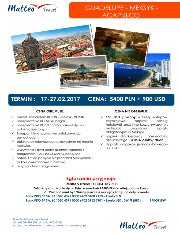 GUADELUPE - MEKSYK ACAPULCO TERMIN : 17-27.02.2017 CENA: 5400 PLN + 900 USD CENA OBEJMUJE: CENA NIE OBEJMUJE: przelot samolotem BERLIN – Meksyk - BERLIN ubezpieczenie KL i NNW, bagaż, ubezpieczenie KL od chorób przewlekłych – pakiet rozszerzony, transport klimatyzowanym autokarem lub samochodem, opieka polskojęzycznego przewodnika na terenie Meksyku, wyżywienie : dwa posiłki dziennie, zgodnie z programem + ALL INCLUSIVE w Acapulco hotele 4 *, na pobycie 5 * (standard Meksykański – pokoje dwuosobowe z łazienką), rejsy, zgodnie z programem. 150 USD / osoby – bilety wstępów, zwyczajowe napiwki obsługi hotelowej, oraz inne koszty związane z realizacją programu, opłata obligatoryjna w Meksyku napiwki dla kierowcy i przewodnika miejscowego – 3 USD/ osoby/ dzień, dopłata do pokoju jednoosobowego – 380 USD. Zgłoszenia przyjmuje: Matteo Travel TEL 504 189 508 Zaliczka po zapisaniu się na listę w wysokości 2400 PLN na niżej podane konto. Paszport musi być Ważny jeszcze 6 miesięcy licząc od daty powrotu Bank PKO BP SA: 87 1020 4391 0000 6402 0108 7113 – konto PLN Bank PKO BP SA: 60 1020 4391 0000 6702 0112 7901 – konto USD , SWIFT (BIC): Biuro Podróży Matteo Travel, tel. +48 504 189 508 , pn.-sob. 9:00–17:00 e-mail: [email protected], www.matteotravel.pl BPKOPLPW GUADELUPE - MEKSYK ACAPULCO 1. DZIEŃ 17 luty 2017 Wylot z Berlina. Przylot do Meksyku. Transfer do hotelu. Zakwaterowanie. Kolacja. Nocleg w Mieście Meksyk. 2. DZIEŃ 18.02: ZOCALO – PAŁAC NARODOWY - XOCHILMILCO Po śniadaniu zwiedzanie rozpoczniemy od placu. Zocalo centrum miasta. Przejdziemy do Pałacu Narodowego, który jest siedzibą obecnie urzędującego prezydenta Meksyku. Pałac ozdobiony jest ogromnymi freskami Diego Riwera - pałac zamknięty podczas uroczystości państwowych lub innych niezależnych od nas decyzji tym dniu zobaczymy również Katedrę Metropolitańską jedną z pierwszych świątyń, których budowę rozpoczęto zaraz po konkwiście Meksyku. Największa w Meksyku. Charakteryzuje się mieszanką stylów architektonicznych. Najpiękniejsze przykłady stylu barokowego. Słynna Kaplica przebaczenia z uwielbianą przez Meksykanów figurą Jezusa Chrystusa od Trucizny, oraz Ołtarz Króli, dzieło mistrzowskie baroku meksykańskiego. Po południu udamy się do Xochilmilco – „Miejsce Kwiatów” ostatniego miejsca, które zachowało swój aztecki wygląd. Miejsce znajduje się pod Patronatem Unesco. Tu zaprosimy Państwa na obiadokolację. Powrót do hotelu 3. DZIEŃ 19.02: PLAC TRZECH KULTUR - BAZYLIKA – TEOTIHUACAN Po śniadaniu przejazd na Plac Trzech Kultur gdzie dawniej znajdowało się miasto i targ Azteków Tlatelolco. Tutaj Hiszpanie wybudowali jeden z pierwszych kościołów św. Jakuba, do którego co sobotę udawał się Jan Diego na lekcje katechezy. Tutaj również, Jan Diego zdawał relację Biskupowi Zumarraga z Objawień Najświętszej Marii Panny z Gwadelupe i 12 grudnia 1531 roku Panienka ukazała swoje oblicze odbite na Tilmie Indianina. Przejazd do Bazyliki Najświętszej Marii Panny z Guadalupe – zwiedzanie kompleksów Bazyliki Najświętszej Marii Panny. Dawna Bazylika – dzisiejsza Świątynia Przebaczenia Jezusa Chrystusa. Bazylika współczesna, w której znajduje się Tilma Jana Diego z odbitym wizerunkiem Matki Bożej z Guadalupe. Parafia Indian – wybudowana na miejscu dwóch pierwszych kapliczek, wzniesionych na miejscu, które wskazała Panienka z Tepeyac. Miejsce pochówku Jana Diego. Ogrody Tepeyac z przepiękna fontanną „Ofiarowanie”. Kaplica del cerrito, miejsce na które Matka Boża wysłała Jana Diego po kwiaty. Dawny Klasztor Kapucynek. Kaplica Studzienki. Przejazd do Teotihuacan najważniejsze miasto prekolumbijskie Mezoameryki, rozwijało sie od pierwszego wieku przed naszą erą do VIII wieku naszej ery. W latach apogeum osiągnęło liczbę około 200.000 mieszkańców. Do niedawna nieznane były przyczyny upadku miasta. Cytadela Pierzastego Węża Quetzacoatla – jedyna budowla, która zachowała oryginalną dekorację z czasów prekolumbijskich. Pałac Pierzastych Muszli – najstarsza budowla kompleksu z przepięknie zachowanym freskiem procesji papug. Pałac Pierzastych Motyli, Plac Księżycowy ze słynną Piramidą Księżyca. Piramida Słońca, która jest najwyższą 64 metry, możliwość wejścia na szczyt Piramidy Obiadokolacja przy Piramidach. Powrót do hotelu na nocleg. 4. DZIEŃ 20.02: MEKSYK – CHOLULA – TONATZINTLA – PUEBLA Po Śniadaniu opuszczamy stolicę Meksyku i udajemy się w kierunku Puebli. Po drodze krótki postój w Tonatzintla i Cholula - miejsce gdzie znajduje się największa piramida Mezoameryki, która została pokryta ziemią, aby obronić ją przed Hiszpanami. Dzisiaj na samym szczycie znajduje się Kościół, wybudowany przez konkwistadorów. Jedyna piramida, którą możemy Biuro Podróży Matteo Travel, tel. +48 504 189 508 , pn.-sob. 9:00–17:00 e-mail: [email protected], www.matteotravel.pl GUADELUPE - MEKSYK ACAPULCO zwiedzić w środku, pokonując tunele i poznając wszystkie etapy konstrukcji piramid. Dojazd do Puebla. Zakwaterowanie w hotelu. Spacer po centrum miasta – Katedra, Kościół Santo Domingo z Kaplicą Najświętszej Marii Różańcowej. Kolacja i nocleg w hotelu w Puebli . 5. DZIEŃ 21.02: PUEBLA – CUERNAVACA – CACAHUAMILPA - TAXCO Śniadanie. Przejazd w kierunku Taxco. Po drodze zatrzymamy sie w Cuernavaca - nazywane “miastem wiecznej wiosny”, ze względu na stałą temperaturę utrzymująca się przez cały rok, około 24 stopnie. Miasta z przepiękną Katedrą - zobaczymy jej wnętrze. następnie zwiedzanie jaskiń Cacahuamilpa -w czasie około dwugodzinnego spaceru podziwianie przepięknych stalagmitów i stalaktytów, ogromne sale utworzone przez dawniej przepływającą rzekę. Nacieki skalne wzbudzające wyobraźnię. Dojazd do Taxco - stolicy srebra Meksyku. Miasto pięknie położone na wzgórzu. Wizyta w warsztacie , gdzie poznamy