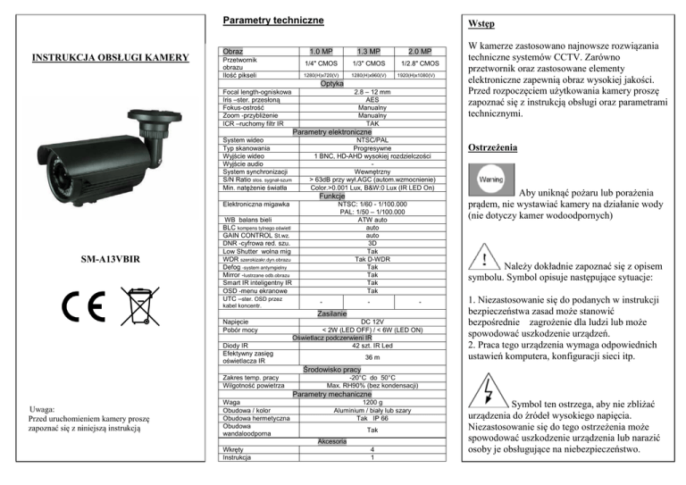 Parametry techniczne INSTRUKCJA OBSŁUGI KAMERY SM