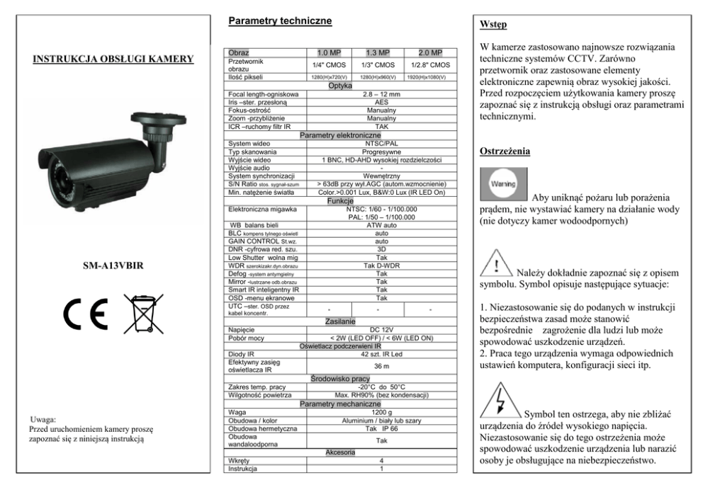 Parametry techniczne INSTRUKCJA OBSŁUGI KAMERY Obraz Przetwornik obrazu Ilość pikseli Wstęp 1.0 MP 1.3 MP 1/4" CMOS 1/3" CMOS 1280(H)x720(V) 1280(H)x960(V) 2.0 MP 1/2.8" CMOS 1920(H)x1080(V) Optyka 2.8 – 12 mm AES Manualny Manualny TAK Focal length-ogniskowa Iris –ster. przesłoną Fokus-ostrość Zoom -przybliżenie ICR –ruchomy filtr IR W kamerze zastosowano najnowsze rozwiązania techniczne systemów CCTV. Zarówno przetwornik oraz zastosowane elementy elektroniczne zapewnią obraz wysokiej jakości. Przed rozpoczęciem użytkowania kamery proszę zapoznać się z instrukcją obsługi oraz parametrami technicznymi. Parametry elektroniczne System wideo Typ skanowania Wyjście wideo Wyjście audio System synchronizacji S/N Ratio stos. sygnał-szum Min. natężenie światła NTSC/PAL Progresywne 1 BNC, HD-AHD wysokiej rozdzielczości Wewnętrzny > 63dB przy wył.AGC (autom.wzmocnienie) Color.>0.001 Lux, B&W:0 Lux (IR LED On) Funkcje Elektroniczna migawka SM-A13VBIR WB balans bieli BLC kompens tylnego oświetl GAIN CONTROL St.wz. DNR -cyfrowa red. szu. Low Shutter wolna mig WDR szerokizakr.dyn.obrazu Defog -system antymgielny Mirror -lustrzane odb.obrazu Smart IR inteligentny IR OSD -menu ekranowe UTC –ster. OSD przez kabel koncentr. NTSC: 1/60 - 1/100.000 PAL: 1/50 – 1/100.000 ATW auto auto auto 3D Tak Tak D-WDR Tak Tak Tak Tak - - Diody IR Efektywny zasięg oświetlacza IR - DC 12V < 2W (LED OFF) / < 6W (LED ON) Oświetlacz podczerwieni IR 42 szt. IR Led 36 m Aby uniknąć pożaru lub porażenia prądem, nie wystawiać kamery na działanie wody (nie dotyczy kamer wodoodpornych) Należy dokładnie zapoznać się z opisem symbolu. Symbol opisuje następujące sytuacje: Zasilanie Napięcie Pobór mocy Ostrzeżenia 1. Niezastosowanie się do podanych w instrukcji bezpieczeństwa zasad może stanowić bezpośrednie zagrożenie dla ludzi lub może spowodować uszkodzenie urządzeń. 2. Praca tego urządzenia wymaga odpowiednich ustawień komputera, konfiguracji sieci itp. Środowisko pracy Zakres temp. pracy Wilgotność powietrza -20°C do 50°C Max. RH90% (bez kondensacji) Parametry mechaniczne Uwaga: Przed uruchomieniem kamery proszę zapoznać się z niniejszą instrukcją Waga Obudowa / kolor Obudowa hermetyczna Obudowa wandaloodporna 1200 g Aluminium / biały lub szary Tak IP 66 Tak Akcesoria Wkręty Instrukcja 4 1 Symbol ten ostrzega, aby nie zbliżać urządzenia do źródeł wysokiego napięcia. Niezastosowanie się do tego ostrzeżenia może spowodować uszkodzenie urządzenia lub narazić osoby je obsługujące na niebezpieczeństwo. UWAGA Rozwiązywanie problemów: Nie należy samodzielnie próbować naprawiać kamery. Otwarcie obudowy urządzenia może doprowadzić do porażenia prądem lub stworzyć inne zagrożenia. Wszelkie naprawy należy powierzyć wykwalifikowanym pracownikom odpowiedniego serwisu. Sposób podłączenia 1. Po podłączeniu zasilania brak obrazu. Sprawdź zasilacz oraz przewód zasilający. Sprawdź okablowanie oraz czy monitor jest podłączony prawidłowo. Zastosowanie zasilacza o innym napięciu niż wymagane do zasilania tego urządzenia, może doprowadzić do uszkodzenia tego urządzenia lub spowodować porażenie prądem osoby je obsługujące. Gwarancja nie obejmuje m.in. uszkodzeń będących wynikiem niezastosowania się do powyższych zaleceń. 2. Na obrazie pojawiają się „płynące” poziome paski interferencyjne. Użyj zasilacza z filtrem przeciwzakłóceniowym, lub zastosuj na przewodzie wideo filtr wideo albo separator optyczny. Sprawdź monitor. wideo 3. Obraz ciągle zmienia kolory. Może to być spowodowane polem elektromagnetycznym będącej w pobliżu lampy wyładowczej. Przenieś kamerę w inne miejsce. 4. Obraz jest nieprawidłowy. Sprawdź napięcie zasilania przy kamerze. Sprawdź, czy przewody połączeniowe są poprawnie podłączone. zasilanie Zasilacz DC 12V Przewód wideo Przewód zasilania OSTRZEŻENIE: - proszę zwrócić uwagę na zakres temperatur pracy kamery, który wynosi od -10°C do 50°C - nigdy nie wystawiać kamery na bezpośrednie działanie promieni słonecznych - nie montować kamery w pobliżu źródeł ciepła (grzejniki, kaloryfery itp) - napięcie zasilania, polaryzacja, prąd oraz zakres temp. pracy zasilacza muszą odpowiadać wymaganiom kamery - budynek w którym są zamontowane kamery powinien posiadać instalację odgromową, jeśli takiej nie posiada, w czasie burzy należy odłączyć kamery od zasilania - długość przewodu wideo oraz zasilania ma wpływ na jakość obrazu