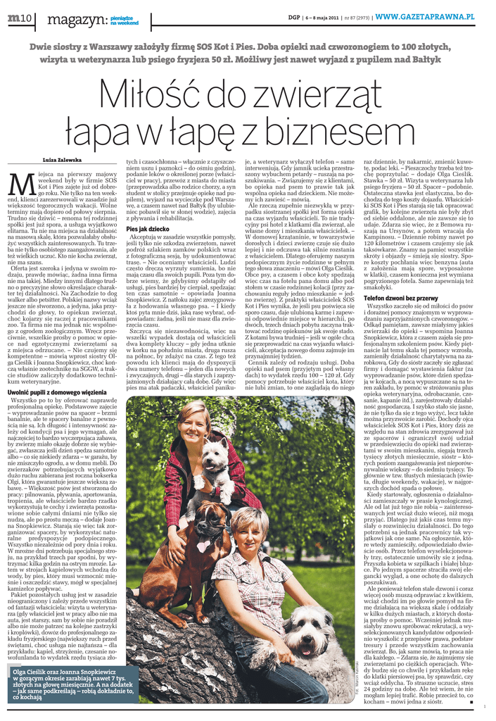 m10 magazyn: pieniądze na weekend DGP | 6 – 8 maja 2011 | nr 87 (2973) | WWW.GAZETAPRAWNA.PL Dwie siostry z Warszawy założyły firmę SOS Kot i Pies. Doba opieki nad czworonogiem to 100 złotych, wizyta u weterynarza lub psiego fryzjera 50 zł. Możliwy jest nawet wyjazd z pupilem nad Bałtyk Miłość do zwierząt łapa w łapę z biznesem Luiza Zalewska iejsca na pierwszy majowy weekend były w firmie SOS Kot i Pies zajęte już od dobrego roku. Nie tylko na ten weekend, klienci zarezerwowali w zasadzie już większość tegorocznych wakacji. Wolne terminy mają dopiero od połowy sierpnia. Trudno się dziwić – renoma tej rodzinnej spółki jest już spora, a usługa wyjątkowo elitarna. Tu nie ma miejsca na działalność na masową skalę, która pozwalałaby obsłużyć wszystkich zainteresowanych. Tu trzeba nie tylko osobistego zaangażowania, ale też wielkich uczuć. Kto nie kocha zwierząt, nie ma szans. Oferta jest szeroka i jedyna w swoim rodzaju, prawdę mówiąc, żadna inna firma nie ma takiej. Miedzy innymi dlatego trudno o precyzyjne słowo określające charakter tej działalności. Na Zachodzie to dog walker albo petsitter. Polskiej nazwy wciąż jeszcze nie stworzono, a jedyna, jaka przychodzi do głowy, to opiekun zwierząt, choć kojarzy się raczej z pracownikami zoo. Ta firma nie ma jednak nic wspólnego z ogrodem zoologicznym. Wręcz przeciwnie, wszelkie prośby o pomoc w opiece nad egzotycznymi zwierzętami są z miejsca odrzucane. – Nie czujemy się kompetentne – mówią wprost siostry Olga Cieślik i Joanna Snopkiewicz, choć kończą właśnie zootechnikę na SGGW, a trakcie studiów zaliczyły dodatkowo technikum weterynaryjne. M Uwolnić pupili z domowego więzienia tych i czasochłonna – włącznie z czyszczeniem uszu i paznokci – do ośmiu godzin), podanie leków o określonej porze (właściciel w pracy), przewóz z miasta do miasta (przeprowadzka albo rodzice chorzy, a syn student w stolicy przejmuje opiekę nad pupilem), wyjazd na wycieczkę pod Warszawę, a czasem nawet nad Bałtyk (by ulubieniec pobawił się w słonej wodzie), zajęcia z pływania i rehabilitacja. Pies jak dziecko Akceptują w zasadzie wszystkie pomysły, jeśli tylko nie szkodzą zwierzętom, nawet podróż szlakiem zamków polskich wraz z fotograficzną sesją, by udokumentować trasę. – Nie oceniamy właścicieli. Ludzi często dręczą wyrzuty sumienia, bo nie mają czasu dla swoich pupili. Poza tym dobrze wiemy, że gdybyśmy odstąpiły od usługi, pies bardziej by cierpiał, spędzając ten czas samotnie – opowiada Joanna Snopkiewicz. Z natłoku zajęć zrezygnowała z hodowania własnego psa. – I kiedy ktoś pyta mnie dziś, jaką rasę wybrać, odpowiadam: żadną, jeśli nie masz dla zwierzęcia czasu. Szczycą się niezawodnością, więc na wszelki wypadek dostają od właścicieli dwa komplety kluczy – gdy jedna utknie w korku na południu miasta, druga rusza na północ, by zdążyć na czas. Z tego też powodu ich klienci mają do dyspozycji dwa numery telefonu – jeden dla nowych i zwyczajnych, drugi – dla starych i zaprzyjaźnionych działający całą dobę. Gdy więc pies ma atak padaczki, właściciel paniku- je, a weterynarz wyłączył telefon – same interweniują. Gdy jamnik ucieka przestraszony wybuchem petardy – ruszają na poszukiwania. – Związujemy się z klientami, bo opieka nad psem to prawie tak jak wspólna opieka nad dzieckiem. Nie możemy ich zawieść – mówią. Ale rzeczą zupełnie niezwykłą w przypadku siostrzanej spółki jest forma opieki na czas wyjazdu właścicieli. To nie tradycyjny psi hotel z klatkami dla zwierząt, ale własne domy i mieszkania właścicielek. – W domowej krzątaninie, w towarzystwie dorosłych i dzieci zwierzę czuje się dużo lepiej i nie odczuwa tak silnie rozstania z właścicielem. Dlatego oferujemy naszym podopiecznym życie rodzinne w pełnym tego słowa znaczeniu – mówi Olga Cieślik. Obce psy, a czasem i obce koty spędzają więc czas na fotelu pana domu albo pod stołem w czasie rodzinnej kolacji (przy zachowaniu reguły jedno mieszkanie = jedno zwierzę). Z praktyki właścicielek SOS Kot i Pies wynika, że jeśli psu poświęca się sporo czasu, daje ulubioną karmę i zapewni odpowiednie miejsce w hierarchii, po dwóch, trzech dniach pobytu zaczyna traktować rodzinę opiekunów jak swoje stado. Z kotami bywa trudniej – jeśli w ogóle chcą się przeprowadzić na czas wyjazdu właścicieli, akceptacja nowego domu zajmuje im przynajmniej tydzień. Cennik zależy od rodzaju usługi. Doba opieki nad psem (przyjętym pod własny dach) to wydatek rzędu 100 – 120 zł. Gdy pomocy potrzebuje właściciel kota, który nie lubi zmian, to one zaglądają do niego raz dziennie, by nakarmić, zmienić kuwetę, podać leki. – Pieszczochy trzeba też trochę poprzytulać – dodaje Olga Cieślik. Stawka – 50 zł. Wizyta u weterynarza lub psiego fryzjera – 50 zł. Spacer – podobnie. Ostateczna stawka jest elastyczna, bo dochodzą do tego koszty dojazdu. Właścicielki SOS Kot i Pies starają się tak opracować grafik, by kolejne zwierzęta nie były zbyt od siebie oddalone, ale nie zawsze się to udaje. Zdarza się więc, że z Bemowa ruszają na Ursynów, a potem wracają do Kampinosu. – Dziennie robimy nawet po 120 kilometrów i czasem czujemy się jak taksówkarze. Znamy na pamięć wszystkie skróty i objazdy – śmieją się siostry. Spore koszty pochłania więc benzyna (auta z założenia mają spore, wyposażone w klatki), czasem konieczna jest wymiana pogryzionego fotela. Same zapewniają też smakołyki. Telefon dzwoni bez przerwy Olga Cieślik oraz Joanna Snopkiewicz w gorącym okresie zarabiają nawet 7 tys. złotych na głowę miesięcznie. A na dodatek – jak same podkreślają – robią dokładnie to, co kochają Fot. Marcin Kaliński Wszystko po to by oferować naprawdę profesjonalną opiekę. Podstawowe zajęcie – wyprowadzanie psów na spa