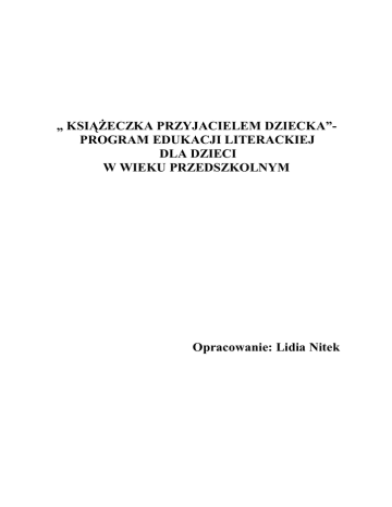 „ KSIĄŻECZKA PRZYJACIELEM DZIECKA”PROGRAM EDUKACJI LITERACKIEJ DLA DZIECI W WIEKU PRZEDSZKOLNYM Opracowanie: Lidia Nitek Książka nas uczy, książka cieszy, czasem zadziwi nas niemało albo po prostu tak rozśmieszy, jakby się dobry żart słyszało. Książka też mądrze nam doradza różne wskazówki, wzory daje. Książka w szeroki świat wprowadza, dalekie z nami zwiedza kraje. Lubimy książkę - przyjaciółkę. Wiesz co ci powiem? Nie odwlekaj. Masz trochę czasu? Spójrz na półkę, sięgnij po książkę! Książka czeka! „ Książka czeka” Hanna Łochocka WSTĘP Wiek przedszkolny to bardzo ważny okres w życiu dzieci. W okresie tym intensywnie kształtują się procesy uczuciowe i umysłowe oraz tworzą się stałe nawyki. Jest to doskonały czas na to, by rozbudzać w dzieciach potrzebę obcowania z książką. Książka jest źródłem nowych wiadomości, utrwala i porządkuje pewne pojęcia o świecie, wzbogaca zasób pojęciowy dzieci. Książka zachęca do działania i jednocześnie budzi ich aktywność umysłową. Bogaci zasób słownikowy dzieci, uczy, jak wyrażać swoje myśli w sposób poprawny, prawidłowy i ładny. Książka nie tylko uczy myśleć i mówić – często bardzo silnie wpływa na sferę emocjonalną dziecka, ukazuje przykłady społecznego współżycia. Literatura dziecięca w pracy wychowawczej przedszkola ma zatem bardzo istotne znaczenie – dotyczy jednocześnie dziedziny wychowania umysłowego, estetycznego i społeczno – moralnego. Umiejętne stopniowanie lektury, podsuwanie książek interesujących, to nie tylko jeden z najskuteczniejszych środków wychowawczych, ale i sposób na przyzwyczajanie do książki, mogący stać się potem na całe życie narzędziem poznania, rozkoszy estetycznej, rozrywki, nawet pomocą i podtrzymaniem w trudnych chwilach życia. To szerokie oddziaływanie książki jest możliwe przy udziale świadomej swoich celów nauczycielki przedszkola. W kontaktach małego dziecka z książką rola nauczycielki jest szczególnie ważna i jest również po prostu niezbędna. CELE PROGRAMU: Według obowiązującej „Podstawy Programowej…” z dnia 23 grudnia 2008r. celem wychowania przedszkolnego jest między innymi: - wspomaganie dzieci w rozwijaniu uzdolnień oraz kształtowanie czynności intelektualnych potrzebnych im w codziennych sytuacjach i w dalszej edukacji; - budowanie systemu wartości, w tym wychowywanie dzieci tak, żeby lepiej orientowały się w tym, co jest dobre, a co złe; - kształtowanie u dzieci odporności emocjonalnej koniecznej do racjonalnego radzenia sobie w nowych i trudnych sytuacjach, w tym także do łagodnego znoszenia stresów i porażek; - rozwijanie umiejętności społecznych dzieci, które są niezbędne w poprawnych relacjach z dziećmi i dorosłymi; - stwarzanie warunków sprzyjających wspólnej i zgodnej zabawie oraz nauce; - budowanie dziecięcej wiedzy o świecie społecznym, przyrodniczym i technicznym oraz rozwijanie umiejętności prezentowania swoich przemyśleń w sposób zrozumiały dla innych; - wprowadzenie dzieci w świat wartości estetycznych i rozwijanie umiejętności wypowiadania się poprzez muzykę, małe formy teatralne oraz sztuki plastyczne; - kształtowanie u dzieci poczucia przynależności społecznej (do rodziny, grupy rówieśniczej i wspólnoty narodowej) oraz postawy patriotycznej; - zapewnienie dzieciom lepszych szans edukacyjnych poprzez wspieranie ich ciekawości, aktywności i samodzielności, a także kształtowanie tych wiadomości i umiejętności, które są ważne w edukacji szkolnej. Aby osiągnąć cele wychowania przedszkolnego, należy wspierać rozwój, wychowywać i kształcić dzieci w następujących obszarach dotyczących między innymi: - Kształtowania umiejętności społecznych dzieci w tym porozumiewania się z dorosłymi i dziećmi, zgodnego funkcjonowania w zabawie i sytuacjach zadaniowych. - Wspomagania rozwoju mowy dzieci. - Wspierania dzieci w rozwoju czynności intelektualnych, które stosują w poznawaniu i rozumieniu siebie i swojego otoczenia. - Wychowania przez sztukę. - Kształtowania gotowości do nauki czytania i pisania. Podstawa programowa ma charakter otwarty , stwarza możliwość konstruowania różnych programów wychowania przedszkolnego. Cele i zadania niniejszego programu zostały wyłonione i są zgodne z obowiązującą podstawą programową jak również ściśle dotyczą w/w obszarów. GŁÓWNYM CELEM NINIEJSZEGO PROGRAMU JEST: - rozwijanie zainteresowań książką wśród dzieci w wieku przedszkolnym będącej źródłem rozwoju, zdobywania wiedzy o sobie samym i o otaczającym świecie. - zdobywanie doświadczeń w słuchaniu, mówieniu i byciu słuchanym - nabywanie przez dzieci właściwych postaw prospołecznych Cele ogólne wyprowadzone z „Podstawy programowej ...” ukierunkowane na dziecko wyznaczają następujące cele szczegółowe: CELE SZCZEGÓŁOWE: Dziecko: - z uwagą słucha tekstu; - interesuje się ilustracjami; - korzysta i zdobywa wiedzę z książek; - szanuje książki, zna zasady właściwego korzystania z książek; - zna różne rodzaje książek; - rozumie znaczenie pojęć: pisarz, poeta, ilustrator, autor; - zna imiona i nazwiska wybranych poetów i pisarzy polskich i zagranicznych; - zna przeznaczenie i role takich instytucji jak: biblioteka, księgarnia; - wykazuje zrozumienie treści zawartych w tekstach oraz ilustracjach tzn. * dostrzega związki przyczynowo- skutkowe; * opowiada treść wysłuchanego testu; * podejmuje swobodne rozmowy i dyskusje na temat książek, ilustracji; * odpowiada na pytania związane z treścią utworu; * ocenia postępowanie bohaterów, odróżnia dobro od zła; - wymienia informacje, dochodzi do kompromisu z innymi osobami; - jest wrażliwe na potrzeby i przeżycia innych; - tworzy własne opowiadania; - ogląda przedstawienia teatralne; - występuje jako aktor w przedszkolnym teatrze, wyraża przeżycia i uczucia w różn