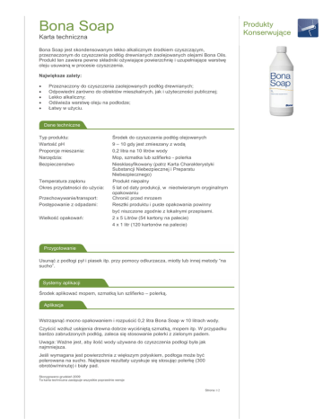 Bona Soap Produkty Konserwujące Karta techniczna Bona Soap jest skondensowanym lekko alkalicznym środkiem czyszczącym, przeznaczonym do czyszczenia podłóg drewnianych zaolejowanych olejami Bona Oils. Produkt ten zawiera pewne składniki ożywiające powierzchnię i uzupełniające warstwę oleju usuwaną w procesie czyszczenia. Największe zalety: • • • • • Przeznaczony do czyszczenia zaolejowanych podłóg drewnianych; Odpowiedni zarówno do obiektów mieszkalnych, jak i użyteczności publicznej; Lekko alkaliczny; Odświeża warstwę oleju na podłodze; Łatwy w użyciu. Dane techniczne Typ produktu: Wartość pH Proporcje mieszania: Narzędzia: Bezpieczenstwo Temperatura zapłonu Okres przydatności do użycia: Przechowywanie/transport: Postępowanie z odpadami: Wielkość opakowań: Środek do czyszczenia podłóg olejowanych 9 – 10 gdy jest zmieszany z wodą 0,2 litra na 10 litrów wody Mop, szmatka lub szlifierko - polerka Niesklasyfikowany (patrz Karta Charakterystyki Substancji Niebezpiecznej i Preparatu Niebezpiecznego) Produkt niepalny 5 lat od daty produkcji, w nieotwieranym oryginalnym opakowaniu Chronić przed mrozem Resztki produktu i puste opakowania powinny być niszczone zgodnie z lokalnymi przepisami. 2 x 5 Litrów (54 kartony na palecie) 4 x 1 litr (120 kartonów na palecie) Przygotowanie Usunąć z podłogi pył i piasek itp. przy pomocy odkurzacza, miotły lub innej metody “na sucho”. Systemy aplikacji Środek aplikować mopem, szmatką lun szlifierko – polerką. Aplikacja Wstrząsnąć mocno opakowaniem i rozpuścić 0,2 litra Bona Soap w 10 litrach wody. Czyścić wzdłuż usłojenia drewna dobrze wyciśniętą szmatką, mopem itp. W przypadku bardzo zabrudzonych podłóg, zaleca się stosowanie polerki z zielonym padem. Uwaga: Ważne jest, aby ilość wody używana do czyszczenia podłogi była jak najmniejsza. Jeśli wymagana jest powierzchnia z większym połyskiem, podłoga może być polerowana na sucho. Najlepsze rezultaty uzyskuje się stosując polerkę (300 obrotów/minutę) i biały pad. Skorygowano grudzień 2009 Ta karta techniczna zastępuje wszystkie poprzednie wersje Strona 1/2 Bona Soap Produkty Konserwujące Karta techniczna Pielęgnacja Do pielęgnacji podłogi stosować produkt Bona Carl’s Oil 25. Dalsze szczegółowe informacje o produkcie wraz z Kartą Charakterystyki Substancji Niebezpiecznej i Preparatu Niebezpiecznego można znaleźć na stronie internetowej www.bona.com. Skorygowano grudzień 2009 Ta karta techniczna zastępuje wszystkie poprzednie wersje Strona 2/2