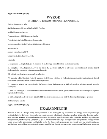 Sygn. akt VIII C 301/14 WYROK W IMIENIU RZECZYPOSPOLITEJ POLSKIEJ Dnia 17 lutego 2015 roku Sąd Rejonowy w Kielcach Wydział VIII Cywilny w składzie następującym: Przewodniczący SSR Katarzyna Latała Protokolant stażysta Mirosława Koprowska po rozpoznaniu w dniu 5 lutego 2015 roku w Kielcach na rozprawie sprawy z powództwa K. U. przeciwko (...)Szpitalowi (...)w K. o zapłatę I. zasądza od (...)Szpitala (...)w K. na rzecz K. U. kwotę 5 000 zł tytułem zadośćuczynienia; II. zasądza od (...)Szpitala (...)w K. na rzecz K. U. kwotę 278,70 zł (dwieście siedemdziesiąt osiem złotych siedemdziesiąt groszy) zł tytułem odszkodowania; III. oddala powództwo w pozostałym zakresie; IV. zasądza od (...)Szpitala (...)w K. na rzecz K. U. kwotę 1 636,14 zł (jeden tysiąc sześćset trzydzieści sześć złotych czternaście groszy) tytułem zwrotu kosztów procesu; V. nakazuje pobrać na rzecz Skarbu Państwa – Sądu Rejonowego w Kielcach tytułem nieuiszczonych kosztów sądowych: 1. od K. U. kwotę 72,41 zł (siedemdziesiąt dwa złote czterdzieści jeden groszy) z roszczenia zasądzonego na jej rzecz w punkcie I wyroku, 2. od (...)Szpitala (...)w K. kwotę 221,95 zł (dwieście dwadzieścia jeden złotych dziewięćdziesiąt pięć groszy). SSR Katarzyna Latała Sygn. akt VIII C 301/14 UZASADNIENIE Pozwem z dnia 24 lutego 2014 roku powódka K. U. domagała się zasądzenia na swoją rzecz od pozwanego (...)Szpitala (...)w K. kwoty 7.000 zł wraz z ustawowymi odsetkami od dnia 4 grudnia 2012 roku do dnia zapłaty oraz kosztów procesu. W uzasadnieniu wskazano, że w dniu 4 grudnia 2012 roku powódka poddała się zabiegowi medycznemu jonoforezy w (...)Szpitalu (...)w K.. W trakcie trwania tego zabiegu doszło do oparzenia skóry powódki przez pracownika pozwanego (...)Szpitala (...)w K.. Pracownik pozwanego ze swojej winy na skutek rażącego niedbalstwa oparzył bowiem podudzie prawe powódki na skutek zastosowania gorącego podkładu oraz włączenia zbyt wysokiej dawki prądu galwanicznego. W następstwie wyżej wskazanego wypadku powódka doznała obrażenia ciała w postaci głębokiego oparzenia podudzia prawego. Rana spowodowana oparzeniem miała charakter rozległy, albowiem martwica objęła skórę właściwą wraz z naczyniami i nerwami skórnymi oraz podskórną tkankę tłuszczową. Powyższa rana goiła się bardzo długo, przysporzyła powódce cierpienia i pozostawiła ciemną bliznę na skórze podudzia prawego. Powyższy uraz ciała w postaci głębokiego oparzenia niósł za sobą dla powódki ból i cierpienie, a leczenie rany oparzeniowej trwało przez wiele miesięcy i było bardzo bolesne dla powódki. Ze względu na umiejscowienie rany powódka zmuszona była ograniczyć chodzenie, ze względu na urażający ranę mięsień podudzia. Powódka nie mogła normalnie funkcjonować przez okres kilku miesięcy po zaistnieniu przedmiotowego nieszczęśliwego wypadku z dnia 4 grudnia 2012 roku, nie mogła założyć samodzielnie buta na prawą stopę i zmuszona była korzystać z pomocy swojego męża przy zakupie leków i opatrunków. Obecnie blizna na prawym podudziu powódki pokryta jest cienkim naskórkiem, który łuszczy się, piecze i uraża powódkę zwłaszcza latem. W związku z wyrządzoną jej szkodą powódka poniosła wydatki na łączną kwotę 2000 zł, w tym koszty udokumentowane w wysokości 300 zł i koszty nieudokumentowane w wysokości 1700 zł na które składają się: 2 razy na dobę zmiany opatrunków, mycie rany, zakładanie opatrunków, które wymagały sterylnych warunków oraz pomocy osób innych ze względu na umiejscowienie rany, koszty dojazdów na wizyty lekarskie (8 wizyt razy 25 zł za dojazd = 200 zł), koszty opieki osób trzecich nad powódką i udzielanej powódce pomocy w sprawach życia codziennego przy dokonywaniu zakupów, sprzątaniu domu i przygotowywaniu posiłków w kwocie 500 zł. Powódka wskazała, że leczenie rany skóry podudzia prawego nie zostało u niej do chwili wniesienia pozwu zakończone, ponieważ rana po zamknięciu trzykrotnie się odnawiała, nawet w okresie letnim, powodowała urażanie i wymagała dodatkowej ochrony w postaci stosowania balsamów i delikatnych opatrunków zabezpieczających przed promieniami słonecznymi. Powódka wskazała że domaga się ponadto zapłaty na jej rzecz przez pozwanego kwoty 5.000 zł tytułem zadośćuczynienia za doznaną krzywdę w postaci cierpień fizycznych i psychicznych doznanych na skutek zaistnienia nieszczęśliwego wypadku z dnia 4 grudnia 2012 roku oraz cierpień fizycznych doznawanych w trakcie procesu leczenia obrażeń ciała doznanych na skutek zaistnienia powyższego zdarzenia. Jako podstawę odpowiedzialności pozwanego w niniejszej sprawie za skutki nieszczęśliwego wypadku z dnia 4 grudnia 2012 roku powódka wskazała przepisy art. 430 k.c. w zw. art. 416, 415 k.c. oraz art. 444 k.c.. Powódka wezwała pozwanego do zapłaty wskazanych w pozwie należności tytułem odszkodowania z tytułu kosztów leczenia obrażeń ciała doznanych na skutek nieszczęśliwego wypadku z dnia 4 grudnia 2012 roku oraz tytułem zadośćuczynienia za doznaną krzywdę w postaci cierpień fizycznych i psychicznych doznanych na skutek zaistnienia przedmiotowego zdarzenia. Do dnia wniesienia pozwu pozwany nie uiścił natomiast na rzecz powódki żadnej należności z powyższych tytułów.(k.3-5) W odpowiedzi na pozew pozwany (...)Szpital (...)w K. wniósł o oddalenie powództwa w całości i zasądzenie od powódki na rzecz pozwanego zwrotu kosztów procesu. Pozwany wniósł ponadto o zawiadomienie (...) S.A. w W. o niniejszej sprawie i wezwanie go jako przypozwanego do udziału w sprawie. W uzasadnieniu pozwany zarzucił, że ponosi on winy za zaistnienie przedmiotowego zdarzenia z dnia 4 grudnia 2012 roku w postaci poparzenia skóry prawego podudzia powódki w trakcie trwania zabiegu jonoforezy w (...)Szpitalu (...)w K.. Zarzucił ponadto, że powódka nie wy