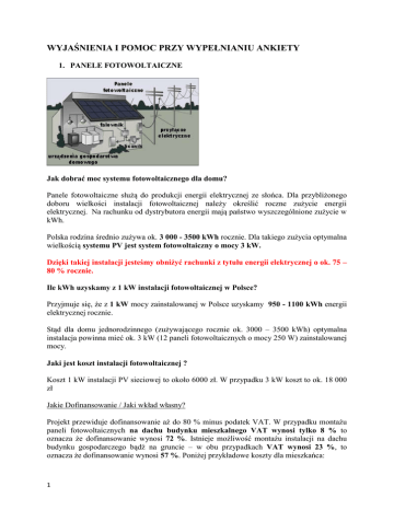 WYJAŚNIENIA I POMOC PRZY WYPEŁNIANIU ANKIETY 1. PANELE FOTOWOLTAICZNE Jak dobrać moc systemu fotowoltaicznego dla domu? Panele fotowoltaiczne służą do produkcji energii elektrycznej ze słońca. Dla przybliżonego doboru wielkości instalacji fotowoltaicznej należy określić roczne zużycie energii elektrycznej. Na rachunku od dystrybutora energii mają państwo wyszczególnione zużycie w kWh. Polska rodzina średnio zużywa ok. 3 000 - 3500 kWh rocznie. Dla takiego zużycia optymalna wielkością systemu PV jest system fotowoltaiczny o mocy 3 kW. Dzięki takiej instalacji jesteśmy obniżyć rachunki z tytułu energii elektrycznej o ok. 75 – 80 % rocznie. Ile kWh uzyskamy z 1 kW instalacji fotowoltaicznej w Polsce? Przyjmuje się, że z 1 kW mocy zainstalowanej w Polsce uzyskamy 950 - 1100 kWh energii elektrycznej rocznie. Stąd dla domu jednorodzinnego (zużywającego rocznie ok. 3000 – 3500 kWh) optymalna instalacja powinna mieć ok. 3 kW (12 paneli fotowoltaicznych o mocy 250 W) zainstalowanej mocy. Jaki jest koszt instalacji fotowoltaicznej ? Koszt 1 kW instalacji PV sieciowej to około 6000 zł. W przypadku 3 kW koszt to ok. 18 000 zł Jakie Dofinansowanie / Jaki wkład własny? Projekt przewiduje dofinansowanie aż do 80 % minus podatek VAT. W przypadku montażu paneli fotowoltaicznych na dachu budynku mieszkalnego VAT wynosi tylko 8 % to oznacza że dofinansowanie wynosi 72 %. Istnieje możliwość montażu instalacji na dachu budynku gospodarczego bądź na gruncie – w obu przypadkach VAT wynosi 23 %, to oznacza że dofinansowanie wynosi 57 %. Poniżej przykładowe koszty dla mieszkańca: 1 - Instalacja fotowoltaiczna o mocy 3 kW zlokalizowana na dachu budynku mieszkalnego. Koszt: ok. 18 000 zł, Dofinansowanie: 72%, Wkład własny: ok. 5 000 zł - Instalacja fotowoltaiczna o mocy 3 kW zlokalizowana na dachu budynku gospodarczego lub gruncie. Koszt: ok. 18 000 zł, Dofinansowanie: 57 %, Wkład własny: ok. 7 500 zł Ile powierzchni zajmują panele fotowoltaiczne? Dla 3 kW systemu na dachu potrzebujemy powierzchnie ok. 20 m². 1 kW = 6 - 7 m² Jakie dane potrzebuję do wypełnienia Ankiety uczestnictwa w Projekcie? 1)Prosimy o podanie rocznego bądź miesięcznego zużycia energii w kWh (dane na rachunku z energetyki). 2)Wymiary połaci dachowej na stronę najbardziej wysunięta na południe, południowy zachód (długość x szerokość). 3)Typ dachu (dach płaski, skośny) oraz pokrycie (blachodachówka, dachówka itp.) 2. KOLETORY SŁONECZNE 2 Ilu użytkowników tyle kolektorów Aby prawidłowo dobrać liczbę kolektorów i wielkość zasobnika c.w.u. należy przyjąć, że jedna osoba zużywa ok. 50 l wody dziennie, a jeden kolektor może podgrzać ok. 125 l wody. liczba osób liczba kolektorów wielkość zbiornika 2-3 1 125 l 3-4 2 250 l 4-5 3 300 l 6-7 4 400 l Dla 4-5-osobowej rodziny zużywającej ok. 250 l ciepłej wody dziennie potrzebne są 2-3 kolektory płaskie o pow. ok. 4,5 m², albo jeden większy lub dwa mniejsze kolektory próżniowe o pow. całkowitej ok. 3,5 m² oraz zasobnik c.w.u. o pojemności ok. 300 l. Przyjmuje się, że kolektory próżniowe są bardziej wydajne niż kolektory płaskie. Liczba kolektorów zależy również od kąta nachylenia dachu i ustawienia połaci względem stron świata. Do montażu kolektorów najlepsze są dachy o kącie nachylenia ok. 45° zwrócone połacią na stronę południową. Ile kosztują kolektory słoneczne? Poprosiliśmy firmy zajmujące się sprzedażą kolektorów o zaproponowanie zestawu służącego do przygotowywania ciepłej wody użytkowej dla 4–5 osobowej rodziny. By zapewnić porównywalność, zaproponowana instalacja musi spełnić następujące warunki: 1. Dzienne zużycie c.w.u. 240 litrów; 2. Temperatura wody podgrzanej 45°C; 3. Temperatura zimnej wody wodociągowej 10°C; 3 4. Roczne pokrycie zapotrzebowania na c.w.u. nie mniej niż 55%; 5. Kolektor skierowany na południe; 6. Cena samych kolektorów; 7. Wielkość zasobnika c.w.u. 8. Cena całej instalacji – wraz z kosztem pozostałych elementów oraz robocizną; 9. Długość gwarancji (co obejmuje?); 10. Koszt przeglądów okresowych. Precyzyjne podanie warunków, które musi spełniać instalacja jest bardzo ważne, gdy prosimy o wycenę, bo umiejętnie manipulując parametrami można uzyskać bardzo różne wyniki dla tych samych kolektorów. Robert Bosch. Junkers – 2 kolektory płaskie Compact FCC- 1S Comfort o powierzchni brutto/netto 2,09/1,92 m2; – AGS 5 podwójna stacja pompowa; – AAS 1 zestaw podłączeniowy naczynia wzbiorczego; – SAG 18 naczynie wzbiorcze do instalacji solarnej 18 l; – WFS 20 zestaw przyłączeniowy dla jednego pola kolektorów, zawierającego do 10 kolektorów, montaż na dachu; – WMT1 i WMT2 – stelaże mocujące (dach skośny); – SK 300-1 solar Zasobnik solarny dwuwężownicowy o pojemności 300 l; – WTF 25 czynnik grzewczy (glikol) o stężeniu 45%; 25 litrów; Gwarancja: 5 lat – kolektory; 3 lata – osprzęt. Cena zestawu brutto bez montażu: 11 805 zł (z VAT 23%). Koszt przeglądów okresowych 100–300 zł/rok. Fakro – 2 kolektory płaskie SKW o wymiarach o powierzchni brutto 2,35 m2; – kołnierze uszczelniające (zespolenie B2/1); – przewód łączący kolektory; – przewód do połączenia kolektorów ze zbiornikiem 10 m (2 szt.); – zbiornik 300 l zintegrowany z grupą pompową i naczyniem przeponowym; – glikol 10 litrów. Gwarancja: 5 lat (od daty zakupu) – kolektory słoneczne, zbiorniki SBW; 2 lata (od daty zakupu) – grupy pompowosterownicze SCB, przewody elastyczne, pozostałe akcesoria; 2 lata (od daty produkcji) – naczynia przeponowe SBV. Kolektor SKW jest szczelny wyłącznie w połączeniu z kołnierzem do integracji z połacią dachu i nie może być montowany bez niego. Montaż kolektora bez kołnierza uszczelniającego wiąże się z utratą gwarancji na kolektor. Cena zestawu bez montażu: 16 994 zł (brutto). Zestaw z kolektorami próżniowym