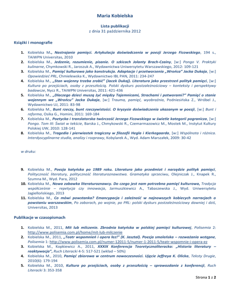 Maria Kobielska Lista publikacji z dnia 31 października 2012 Książki i monografie 1. Kobielska M., Nastrajanie pamięci. Artykulacja doświadczenia w poezji Jerzego Ficowskiego, 194 s., TAiWPN Universitas, 2010 2. Kobielska M., Jedzenie, rozumienie, pisanie. O szkicach Jolanty Brach-Czainy, [w:] Pongo V. Praktyki kulinarne, Chymkowski R., Jaroszuk A., Wydawnictwa Uniwersytetu Warszawskiego, 2012: 109-121 3. Kobielska M., Pamięć kulturowa jako konstrukcja. Adaptacje i przetworzenia „Wrońca” Jacka Dukaja, [w:] Opowiedzieć PRL, Chmielewska K., Wydawnictwo IBL PAN, 2011: 234-247 4. Kobielska M., „Stan wojenny trzeba zrobić” (Jacek Dukaj). Literatura jako przestrzeń polityk pamięci, [w:] Kultura po przejściach, osoby z przeszłością. Polski dyskurs postzależnościowy – konteksty i perspektywy badawcze, Nycz R., TAiWPN Universitas, 2011: 421-436 5. Kobielska M., „Dlaczego dzieci muszą żyć między Tajemnicami, Strachami i potworami?” Pamięć o stanie wojennym we „Wrońcu” Jacka Dukaja, [w:] Trauma, pamięć, wyobraźnia, Podniesińska Z., Wróbel J., Wydawnictwo UJ, 2011: 83-98 6. Kobielska M., Bunt rzeczy, bunt rzeczywistości. O kryzysie doświadczenia ukazanym w poezji, [w:] Bunt i reforma, Osika G., Homini, 2011: 169-184 7. Kobielska M., Poetycka i translatorska twórczość Jerzego Ficowskiego w świetle kategorii pogranicza, [w:] Pongo. Tom III: Świat w tekście, Barska J., Chmykowski R., Czemarmazowicz M., Mostek M., Instytut Kultury Polskiej UW, 2010: 128-141 8. Kobielska M., Tragedia i pierwiastek tragiczny w filozofii Hegla i Kierkegaarda, [w:] Wspólnota i różnica. Interdyscyplinarne studia, analizy i rozprawy, Kobylarek A., Wyd. Adam Marszałek, 2009: 30-42 w druku: 9. Kobielska M., Poezja katyńska po 1989 roku. Literatura jako przedmiot i narzędzie polityk pamięci, Polityczność literatury, polityczność literaturoznawstwa. Gramatyka sprzeciwu, Olejniczak J., Knapek R., Szumna M., Wyd. Para, 2012 10. Kobielska M., Nowa zabawka literaturoznawcy. Do czego jest nam potrzebna pamięć kulturowa, Tradycja współcześnie – repetycja czy innowacja, Jarmuszkiewicz A., Tabaszewska J., Wyd. Uniwersytetu Jagiellońskiego, 2013 11. Kobielska M., Co mówi powstanka? Emancypacja i zależność w najnowszych kobiecych narracjach o powstaniu warszawskim, Po zaborach, po wojnie, po PRL: polski dyskurs postzależnościowy dawniej i dziś, Universitas, 2013 Publikacje w czasopismach 1. Kobielska M., 2011, Mit lub milczenie. Zbrodnia katyńska w polskiej pamięci kulturowej, Polisemia 2: http://www.polisemia.com.pl/home/mit-lub-milczenie 2. Kobielska M., 2011, „Teatr wspomnień i opera łez!” (K. Jasztal). Poezja smoleńska – rozważania wstępne, Polisemia 1: http://www.polisemia.com.pl/numer-12011-5/numer-1-2011-5/teatr-wspomnie-i-opera-ez 3. Kobielska M., Kopkiewicz A., 2011, XXXIX Konferencja Teoretycznoliteracka: „Historia literatury – reaktywacja”, Ruch Literacki 4-5: 517-521 (wkład – 50%) 4. Kobielska M., 2010, Pamięć zbiorowa w centrum nowoczesności. Ujęcie Jeffreya K. Olicka, Teksty Drugie, 2010(6): 179-194 5. Kobielska M., 2010, Kultura po przejściach, osoby z przeszłością – sprawozdanie z konferencji, Ruch Literacki 3: 353-358 Strona 1 z 2 6. Kobielska M., 2008, „Złamane pióro eksliterata”? O „Szkicach” Juliana Kaliszewskiego, Teksty Drugie 6: 170-185 7. Kobielska M., 2008, „Stroiciel pamięci prosi o ciszę”. O kategorii pamięci w poezji Jerzego Ficowskiego, Maska. Magazyn antropologiczno-społeczno-kulturowy 3: 59-75 8. Kobielska M., 2007, Narracja i nowe media, SPLOT. Nowe media 2: 97-103 9. Kobielska M., 2006, W poszukiwaniu zrozumienia, czyli „Czytanie Bursy”, Teksty Drugie 1/2: 145-150 10. Kobielska M., 2006, Schulz w listach. Próba portretu twórcy, Bez porównania 3: 10-44 Prace popularnonaukowe, teksty krytyczne: Liczne omówienia i recenzje zamieszczone w portalu E-SPLOT (www.e-splot.pl, ISSN 2082-1085), w tym zwłaszcza: 1. Kobielska M., Do niczego nie doszło (Widma), 30.07.2012.: http://esplot.pl/index.php?pid=articles&id=2181 2. Kobielska M., Warszawa, Festung Wembley, 30.04.2012.: http://e-splot.pl/index.php?pid=articles&id=2046 3. Kobielska M., Kornhauser J., 2011: osobliwe terytorium, 31.12.2011.: http://esplot.pl/index.php?pid=articles&id=1754 (wkład – 50%) 4. Kobielska M., Dziewczyny, babcie, konspiratorki, 07.12.2012.: http://esplot.pl/index.php?pid=articles&id=1701 5. Kobielska M., Misterność i bezczelność (Marian Pankowski 1919-2011), 04.04.2011.: http://www.esplot.pl/index.php?pid=articles&id=1199 6. Kobielska M., Linie największego oporu (Król Bólu), 02.02.2011.: http://www.esplot.pl/index.php?pid=articles&id=1044 7. Kobielska M., Łatanie pamięci (Widzialny świat), 28.07.2010.: http://www.esplot.pl/index.php?pid=articles&id=706 8. Kobielska M., Kołysanka z kruchty – zanucona czy zanalizowana?, 25.02.2010.: http://www.esplot.pl/index.php?pid=articles&id=469 9. Kobielska M., Meteoryt pamięci uderza w historię (Wroniec), 29.01.2010.: http://www.esplot.pl/index.php?pid=articles&id=436 10. Kobielska M., Zjazd na Brooklyn, czyli ryzyko lektury, 02.12.2009.: http://www.esplot.pl/index.php?pid=articles&id=340 Strona 2 z 2