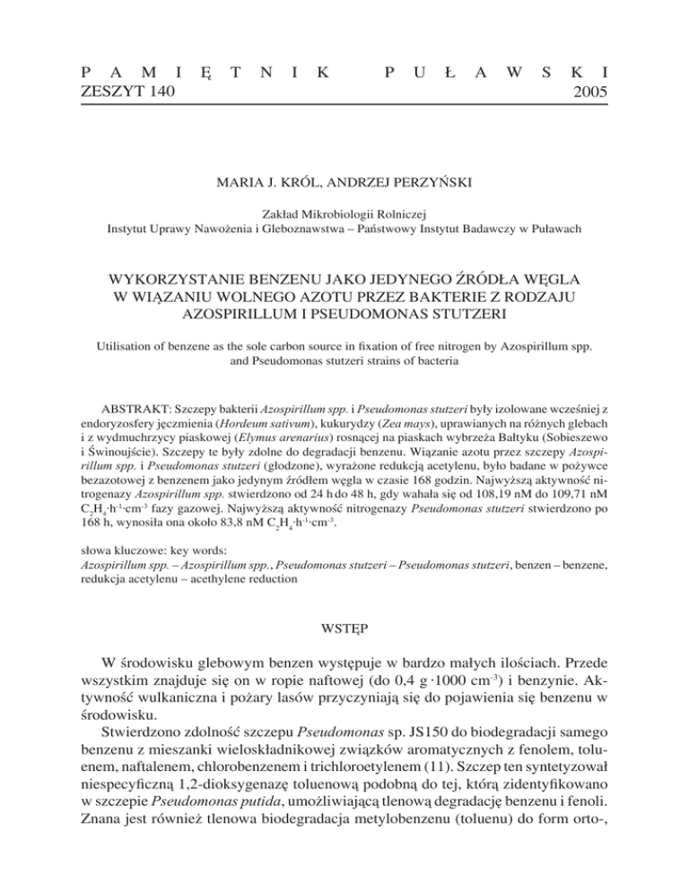 P A M I ZESZYT 140 Ę T N I K P U Ł A W S K I 2005 MARIA J. KRÓL, ANDRZEJ PERZYŃSKI Zakład Mikrobiologii Rolniczej Instytut Uprawy Nawożenia i Gleboznawstwa – Państwowy Instytut Badawczy w Puławach WYKORZYSTANIE BENZENU JAKO JEDYNEGO ŹRÓDŁA WĘGLA W WIĄZANIU WOLNEGO AZOTU PRZEZ BAKTERIE Z RODZAJU AZOSPIRILLUM I PSEUDOMONAS STUTZERI Utilisation of benzene as the sole carbon source in fixation of free nitrogen by Azospirillum spp. and Pseudomonas stutzeri strains of bacteria ABSTRAKT: Szczepy bakterii Azospirillum spp. i Pseudomonas stutzeri były izolowane wcześniej z endoryzosfery jęczmienia (Hordeum sativum), kukurydzy (Zea mays), uprawianych na różnych glebach i z wydmuchrzycy piaskowej (Elymus arenarius) rosnącej na piaskach wybrzeża Bałtyku (Sobieszewo i Świnoujście). Szczepy te były zdolne do degradacji benzenu. Wiązanie azotu przez szczepy Azospirillum spp. i Pseudomonas stutzeri (głodzone), wyrażone redukcją acetylenu, było badane w pożywce bezazotowej z benzenem jako jedynym źródłem węgla w czasie 168 godzin. Najwyższą aktywność nitrogenazy Azospirillum spp. stwierdzono od 24 h do 48 h, gdy wahała się od 108,19 nM do 109,71 nM C2H4·h-1·cm-3 fazy gazowej. Najwyższą aktywność nitrogenazy Pseudomonas stutzeri stwierdzono po 168 h, wynosiła ona około 83,8 nM C2H4·h-1·cm-3. słowa kluczowe: key words: Azospirillum spp. – Azospirillum spp., Pseudomonas stutzeri – Pseudomonas stutzeri, benzen – benzene, redukcja acetylenu – acethylene reduction WSTĘP W środowisku glebowym benzen występuje w bardzo małych ilościach. Przede wszystkim znajduje się on w ropie naftowej (do 0,4 g ·1000 cm-3) i benzynie. Aktywność wulkaniczna i pożary lasów przyczyniają się do pojawienia się benzenu w środowisku. Stwierdzono zdolność szczepu Pseudomonas sp. JS150 do biodegradacji samego benzenu z mieszanki wieloskładnikowej związków aromatycznych z fenolem, toluenem, naftalenem, chlorobenzenem i trichloroetylenem (11). Szczep ten syntetyzował niespecyficzną 1,2-dioksygenazę toluenową podobną do tej, którą zidentyfikowano w szczepie Pseudomonas putida, umożliwiającą tlenową degradację benzenu i fenoli. Znana jest również tlenowa biodegradacja metylobenzenu (toluenu) do form orto-, 104 Zakład Mikrobiologii Rolniczej IUNG-PIB – Puławy meta- i para-ksylenu przez monooksygenazy szczepów OX1, M1 i R1 Pseudomonas stutzeri (4). Umowny schemat cyklu utleniania benzoesanów według G e s c h e r a i in. (9) można przedstawić dla bakterii via ortho-katechol i dla grzybów via β-ketoadypinian. Natomiast u proteobakterii Azoarcus evansii nie stwierdzono cyklu utleniania benzoesanów ani via ortho-katechol, ani via protokatecholany (44). Azoarcus toluvorans i Azoarcus toluclasticus, a z bakterii brodawkowych Burkholderia kururiensis oraz rodzaje Bradyrhizobium i Mezorhizobium mogą rozkładać różne związki benzenowe tylko w warunkach denitryfikacji (1, 35, 41, 42, 44). Znacznie większe znaczenie niż benzen mają jego homologi oraz ich pochodne, np. nitrobenzen i wiele innych, służące do produkcji farb, lakierów, rozpuszczalników, lekarstw, tworzyw sztucznych itp. Nitrobenzen jest jedną z toksycznych pochodnych benzenu, jego emisja do środowiska może być wysoka, szczególnie w fabrycznych osadach ściekowych, ponieważ jest on używany przy produkcji poliuretanów, jako rozpuszczalnik w przemyśle rafineryjnym i przy produkcji celulozy, przy wytwarzaniu różnych związków organicznych i innych. F l e t c h e r i M c F a r l a n e (8, 31-33) stwierdzili, że w glebie skażonej nitrobenzenem system korzeniowy soi (Glycine max) pobiera go w ilości 0,02–100 µg ·cm-3 i akumuluje aż do 80% tego związku. W strefie korzeniowej roślin obserwuje się zwiększone tempo bioremediacji organicznych zanieczyszczeń w porównaniu z glebą nieryzosferową. Wiąże się to przede wszystkim z aktywnością metaboliczną mikroflory licznie zasiedlającej ryzosferę. Okazuje się, że istotne znaczenie mają też mikroorganizmy bezpośrednio związane z rośliną, żyjące wewnątrz tkanek korzenia, łodygi i liści (5). Do takich bakterii między innymi należą ryzobakterie z rodzaju Azospirillum i endofit Pseudomonas stutzeri, wiążące wolny azot. B a l d a n i i in. (2) zaliczają Azospirillum sp. do fakultatywnych endofitów zdolnych do kolonizacji zarówno zewnętrznej powierzchni korzenia, jak i wewnętrznych przestrzeni międzykomórkowych, korzystnie oddziałujących na wzrost i rozwój roślin. We wcześniejszych badaniach stwierdziliśmy, że szczepy bakterii Azospirillum spp. i Pseudomonas stutzeri, wyizolowane z endoryzosfery jęczmienia jarego, kukurydzy i wydmuchrzycy piaskowej, wiązały wolny azot przy wykorzystaniu naftalenu, antracenu, fenantrenu, pirenu i chryzenu jako jedynego źródła węgla (19-23, 28, 45). Celem niniejszej pracy były dalsze badania nad aktywnością nitrogenazy szczepów bakterii Azospirillum spp. i Pseudomonas stutzeri hodowanych w pożywkach bezazotowych z benzenem jako jedynym źródłem węgla. MATERIAŁ I METODY W badaniach wykorzystano 7 szczepów bakterii Azospirillum spp. i 7 szczepów Pseudomonas stutzeri wyizolowanych wcześniej, a pochodzących z endoryzosfery jęczmienia jarego (Hordeum sativum), kukurydzy (Zea mays) i wydmuchrzycy piaskowej (Elymus arenarius) zasiedlającej wydmy nadbałtyckie (14-17, 25). Wykorzystanie benzenu jako jedynego źródła węgla... – M.J. Król i in. 105 Szczepy bakterii Azospirillum spp. i Pseudomonas stutzeri badano określając wykorzystywanie przez nie benzenu jako jedynego źródła węgla i energii podczas wzrostu i wiązania azotu w ciągu 168 godzin w bezazotowej pożywce mineralnej (6, 7). Bakterie po zmyciu solą fizjologiczną ze skosów z podłoża ziemniaczanego były głodzone przez 15 godzin inkubacji na pożywce bez źródła węgla (w celu wykorzystania endogennych zapasów). Następnie przenoszono je na półpłynne p