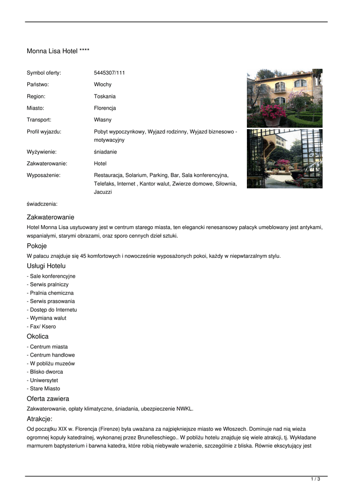 Monna Lisa Hotel **** Symbol oferty: 5445307/111 Państwo: Włochy Region: Toskania Miasto: Florencja Transport: Własny Profil wyjazdu: Pobyt wypoczynkowy, Wyjazd rodzinny, Wyjazd biznesowo - Wyżywienie: śniadanie Zakwaterowanie: Hotel Wyposażenie: Restauracja, Solarium, Parking, Bar, Sala konferencyjna, motywacyjny Telefaks, Internet , Kantor walut, Zwierze domowe, Siłownia, Jacuzzi świadczenia: Zakwaterowanie Hotel Monna Lisa usytuowany jest w centrum starego miasta, ten elegancki renesansowy pałacyk umeblowany jest antykami, wspaniałymi, starymi obrazami, oraz sporo cennych dzieł sztuki. Pokoje W pałacu znajduje się 45 komfortowych i nowocześnie wyposażonych pokoi, każdy w niepwtarzalnym stylu. Usługi Hotelu - Sale konferencyjne - Serwis pralniczy - Pralnia chemiczna - Serwis prasowania - Dostęp do Internetu - Wymiana walut - Fax/ Ksero Okolica - Centrum miasta - Centrum handlowe - W pobliżu muzeów - Blisko dworca - Uniwersytet - Stare Miasto Oferta zawiera Zakwaterowanie, opłaty klimatyczne, śniadania, ubezpieczenie NWKL. Atrakcje: Od początku XIX w. Florencja (Firenze) była uważana za najpiękniejsze miasto we Włoszech. Dominuje nad nią wieża ogromnej kopuły katedralnej, wykonanej przez Brunelleschiego.. W pobliżu hotelu znajduje się wiele atrakcji, tj. Wykładane marmurem baptysterium i barwna katedra, które robią niebywałe wrażenie, szczególnie z bliska. Równie ekscytujący jest 1/3 spacer w kierunku rzeki Arno, za rozległą Piazza della Signoria, z jej niebotycznym Palazzo Vecchio. Brzegi rzeki spina średniowieczny Ponte Vecchio, z wieloma sklepami i przyciągającym wzrok okazałym kościołem San Miniato al Monte. Ponadto: Katedra Santa Maria del Fiore (Duomo; Santa Maria del Fiore - Matki Boskiej Kwietnej z charakterystyczną kopułą) Baptysterium Drzwi Raju Dzwonnica Giotta Kościół Santa Croce Piazza della Signoria Piazza della Repubblica Pałac Vecchio (Stary Pałac) Loggia dei Lanzi (Loggia della Signoria) Most Złotników (Ponte Vecchio) Kaplica Medyceuszów Biblioteka Laurenziana (La Biblioteca Laurenziana) Galeria Uffizi Kościół Santa Maria Novella Kościół Santa Maria del Carmine we Florencji Kaplica Brancacci Orsanmichele Pałac Medyceuszy (Palazzo Medici-Riccardi) Palazzo Strozzi Palazzo Rucellai Pałac Pitti (Palazzo Pitti) Palazzo del Bargello Loggia del Mercato Nuovo (Mercato del Porcellino) Ogród botaniczny założony w roku 1545 mosty: alla Carraia, S. Trinita; TERMINY: od: 2017-11-04 do: 2017-11-11 (8 dni), miejsca: zamów cena od: 3142 PLN = 721 EUR od: 2017-11-04 do: 2017-11-18 (15 dni), miejsca: zamów cena od: 6285 PLN = 1442 EUR od: 2017-11-11 do: 2017-11-18 (8 dni), miejsca: zamów cena od: 3142 PLN = 721 EUR od: 2017-11-11 do: 2017-11-25 (15 dni), miejsca: zamów cena od: 6285 PLN = 1442 EUR od: 2017-11-18 do: 2017-11-25 (8 dni), miejsca: zamów cena od: 3142 PLN = 721 EUR od: 2017-11-18 do: 2017-12-02 (15 dni), miejsca: zamów cena od: 6285 PLN = 1442 EUR od: 2017-11-25 do: 2017-12-02 (8 dni), miejsca: zamów cena od: 3142 PLN = 721 EUR od: 2017-11-25 do: 2017-12-09 (15 dni), miejsca: zamów cena od: 6285 PLN = 1442 EUR od: 2017-12-02 do: 2017-12-09 (8 dni), miejsca: zamów cena od: 3142 PLN = 721 EUR od: 2017-12-02 do: 2017-12-16 (15 dni), miejsca: zamów cena od: 7052 PLN = 1618 EUR od: 2017-12-09 do: 2017-12-16 (8 dni), miejsca: zamów cena od: 3909 PLN = 897 EUR CENNIK: Długość pobytu: 15 dni 8 dni 8 dni Grupa cenowa: A A 4A3B 14 7 7 (-) (-) (-) Ubezpieczenie (obligatoryjne) (*) ubezpieczenie NWKL Pobyt w obiekcie (do wyboru) pokój 2os. dla 1os. 2/3 pokój 1-osobowy (-) (-) (*) pokój 2-osobowy COMFORT+dostawka+dziecko 0-6 lat standardowo dla osób: 2 (-) (-) pokój 3-osobowy z trzema łóżkami standardowo dla osób: 3 (-) (-) Rodzaj osoby (do wyboru) dorosły w pokoju 3 osobowym (-) (-) (-) 1244 622 823 2218 osoba dorosła w pokoju jednoosobowym 1748 (*) Dorosły w pokoju 2-osobowym 1428 1109 1404 874 996 714 890 2.4 % 2.4 % 1 osoba w pokoju 2 osobowym Ubezpieczenie (opcjonalne) Ubezpieczenie od kosztów rezygnacji 2.4 % Waluta: EUR Aktualne ceny z systemu S.A.R.T. (-) - cena usługi, podatku kalkulowana przy osobie lub gratis (*) - kwota wliczona w cenę standardową 3/3