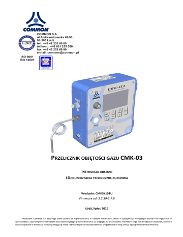 PRZELICZNIK OBJĘTOŚCI GAZU CMK-03 INSTRUKCJA OBSŁUGI I DOKUMENTACJA TECHNICZNO-RUCHOWA Wydanie: CMK3/103U Firmware od: 2.2.39-2.7.8 Łódź, lipiec 2016 Producent Common SA zastrzega sobie prawo do wprowadzania w każdym momencie zmian w specyfikacji niniejszego wyrobu nie będąc ych w sprzeczności z uzyskanymi certyfikatami bez wcześniejszego poinformowania. Ze względu na oczekiwania klientów i chęć wprowadzania ulepszeń, niektóre funkcje opisane w niniejszej instrukcji mogą się nieco różnić od tych w rzeczywistości w urządzeniach z inną wersją oprogramowania (firmware). COMMON S.A. Instrukcja obsługi i DTR CMK-03 1. WPROWADZENIE .......................................................................................................................................................... 5 2. BEZPIECZEŃSTWO I EKSPLOATACJA .............................................................................................................................. 5 3. 2.1. TRANSPORT ..................................................................................................................................................... 5 2.2. PRZECHOWYWANIE ............................................................................................................................................ 5 2.3. INSTALACJA I EKSPLOATACJA ................................................................................................................................. 5 2.4. PRZEGLĄDY OKRESOWE ....................................................................................................................................... 6 2.5. NAPRAWY SERWISOWE ....................................................................................................................................... 6 2.6. LISTA KOMPLETNOŚCI, AKCESORIA DODATKOWE ........................................................................................................ 6 OPIS I BUDOWA PRZELICZNIKA ................................................................................................................................... 10 4. DANE TECHNICZNE I WARUNKI STOSOWANIA, WEJŚCIA POMIAROWE ...................................................................... 11 5. 4.1. KOD WYROBU I WERSJI WYKONANIA ..................................................................................................................... 11 4.2. DANE TECHNICZNE ........................................................................................................................................... 13 4.3. PARAMETRY ISKROBEZPIECZEŃSTWA..................................................................................................................... 18 INSTALACJA I MONTAŻ ............................................................................................................................................... 20 6. 5.1. ZACISKI I WYPROWADZENIA ................................................................................................................................ 21 5.1.1. Złącze TUCHEL na obudowie ............................................................................................................... 21 5.1.2. Zaciski wewnętrzne ............................................................................................................................ 21 5.2. KABLE OBWODÓW ISKROBEZPIECZNYCH ................................................................................................................ 23 5.2.1. Wymagania dotyczące przewodów ..................................................................................................... 23 5.2.2. Parametry, rodzaje przewodów połączeniowych ................................................................................. 23 5.3. UZIEMIENIE URZĄDZENIA ................................................................................................................................... 27 5.4. PODŁĄCZANIE CZUJNIKA TEMPERATURY ................................................................................................................. 27 5.4.1. Podłączanie termometru do zacisków przelicznika .............................................................................. 28 5.4.2. Podłączanie termometru do instalacji ................................................................................................. 29 5.5. PODŁĄCZANIE CZUJNIKA CIŚNIENIA P1, P2 ............................................................................................................. 30 5.6. PODŁĄCZANIE ZEWNĘTRZNEGO PRZETWORNIKA CIŚNIENIA CPC-03.............................................................................. 31 5.6.1. Montaż mechaniczny CPC-03 .............................................................................................................. 31 5.6.2. Podłączenie elektryczne CPC-03 .......................................................................................................... 32 5.7. PODŁĄCZANIE WEJŚCIA LF DO GAZOMIERZA ........................................................................................................... 32 5.8. MONTAŻ MECHANICZNY PRZELICZNIKA CMK-03 ..................................................................................................... 33 5.8.1. Montaż przez otwory w obudowie ...................................................................................................... 33 5.8.2. Montaż za pomocą uchwytów płaskich ............................................................................................... 34 5.8.3. Montaż zamienny za CMK-02 ............................................................................................................. 35 5.8.4. Montaż przelicznika na wieszaku uniwersalnym .................................................................................. 36 5.8.5. Montaż przelicznika na rurociągu ................................................................