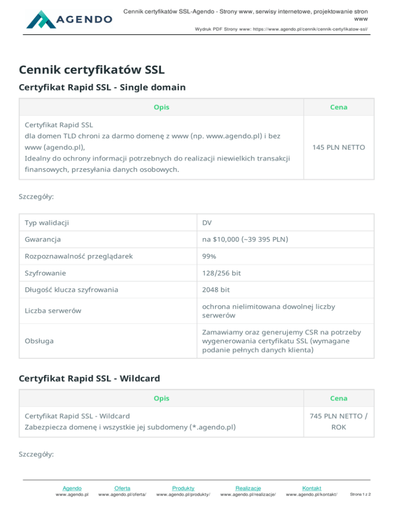 Cennik certyfikatów SSL-Agendo - Strony www, serwisy internetowe, projektowanie stron www Wydruk PDF Strony www: https://www.agendo.pl/cennik/cennik-certyfikatow-ssl/ Cennik certyfikatów SSL Certyfikat Rapid SSL - Single domain Opis Cena Certyfikat Rapid SSL dla domen TLD chroni za darmo domenę z www (np. www.agendo.pl) i bez www (agendo.pl), 145 PLN NETTO Idealny do ochrony informacji potrzebnych do realizacji niewielkich transakcji finansowych, przesyłania danych osobowych. Szczegóły: Typ walidacji DV Gwarancja na $10,000 (~39 395 PLN) Rozpoznawalność przeglądarek 99% Szyfrowanie 128/256 bit Długość klucza szyfrowania 2048 bit Liczba serwerów ochrona nielimitowana dowolnej liczby serwerów Obsługa Zamawiamy oraz generujemy CSR na potrzeby wygenerowania certyfikatu SSL (wymagane podanie pełnych danych klienta) Certyfikat Rapid SSL - Wildcard Opis Cena Certyfikat Rapid SSL - Wildcard 745 PLN NETTO / Zabezpiecza domenę i wszystkie jej subdomeny (*.agendo.pl) ROK Szczegóły: Agendo Oferta Produkty Realizacje Kontakt www.agendo.pl www.agendo.pl/oferta/ www.agendo.pl/produkty/ www.agendo.pl/realizacje/ www.agendo.pl/kontakt/ Strona 1 z 2 Cennik certyfikatów SSL-Agendo - Strony www, serwisy internetowe, projektowanie stron www Wydruk PDF Strony www: https://www.agendo.pl/cennik/cennik-certyfikatow-ssl/ Typ walidacji DV Gwarancja na $10,000 (~39 395 PLN) Rozpoznawalność przeglądarek 99% Szyfrowanie 128/256 bit Długość klucza szyfrowania 2048 bit Liczba serwerów ochrona nielimitowana ochrona Obsługa Zamawiamy oraz generujemy CSR na potrzeby wygenerowania certyfikatu SSL (wymagane podanie pełnych danych klienta) Domeny wyższego rzędu Informujemy że w przypadku domen wyższego rzędu np. subdomena.agendo.pl certyfikat chroni tylko domenę która zostanie wybrana, nie będzie on chronił także domeny www.subdomena.agendo.pl Zobacz również W ramach serwisu stosujemy pliki cookies by umożliwić Ci wygodne korzystanie z Dedykowany hosting dla ustawień Ciebie serwisu. Jeśli nie zmienisz dotyczących cookies w Twojej przeglądarce, Akceptuję wymagane dona wygenerowania certyfikatu SSL chwili możesz zmienić swoje będąDane one umieszczane Twoim komputerze. W każdej ustawienia. Dowiedz się więcej w naszej Polityce Prywatności Agendo Oferta Produkty Realizacje Kontakt www.agendo.pl www.agendo.pl/oferta/ www.agendo.pl/produkty/ www.agendo.pl/realizacje/ www.agendo.pl/kontakt/ Strona 2 z 2