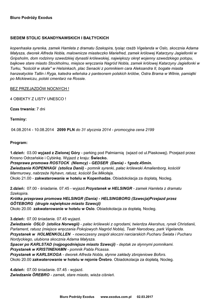 Biuro Podróży Exodus SIEDEM STOLIC SKANDYNAWSKICH I BAŁTYCKICH kopenhaska syrenka, zamek Hamleta z dramatu Szekspira, tysiąc rzeźb Vigelanda w Oslo, skocznia Adama Małysza, dworek Alfreda Nobla, malownicze miasteczko Mariefred, zamek królowej Katarzyny Jagiellonki w Gripsholm, dom rodzinny szwedzkiej dynastii królewskiej, największy okręt wojenny szwedzkiego potopu, bajkowe stare miasto Stockholmu, miejsce wręczania Nagród Nobla, zamek królowej Katarzyny Jagiellonki w Turku, "kościół w skale" w Helsinkach, plac Senacki z pomnikiem cara Aleksandra II, bogate miasta hanzeatyckie Tallin i Ryga, katedra wileńska z panteonem polskich królów, Ostra Brama w Wilnie, pamiątki po Mickiewiczu, polski cmentarz na Rossie. BEZ PRZEJAZDÓW NOCNYCH ! 4 OBIEKTY Z LISTY UNESCO ! Czas trwania: 7 dni Terminy: 04.08.2014 - 10.08.2014 2099 PLN do 31 stycznia 2014 - promocyjna cena 2199 Program: 1.dzień: 03.00 wyjazd z Zielonej Góry - parking pod Palmiarnią (wjazd od ul.Piaskowej). Przejazd przez Krosno Odrzańskie i Cybinkę. Wyjazd z kraju: Świecko. Przeprawa promowa ROSTOCK (Niemcy) - GEDSER (Dania) - 1godz.45min. Zwiedzanie KOPENHAGI (stolica Danii) - pomnik syrenki, pałac królewski Amalienborg, kościół Marmurowy, nabrzeże Nyhavn, ratusz, kościół Św.Mikołaja. Około 21.00 - zakwaterowanie w hotelu w Kopenhadze. Obiadokolacja za dopłatą. Nocleg. 2.dzień: 07.00 - śniadanie. 07.45 - wyjazd.Przystanek w HELSINGR - zamek Hamleta z dramatu Szekspira. Krótka przeprawa promowa HELSINGR (Dania) - HELSINGBORG (Szwecja)Przejazd przez GÖTEBORG (drugie największe miasto Szwecji) Około 20.00 zakwaterowanie w hotelu w Oslo. Obiadokolacja za dopłatą. Nocleg. 3.dzień: 07.00 śniadanie. 07.45 wyjazd. Zwiedzanie OSLO (stolica Norwegii) - pałac królewski z ogrodami, twierdza Akershus, rynek Christianii, Parlament, ratusz (miejsce wręczania Pokojowych Nagród Nobla), Teatr Narodowy, park Vigelanda. Przystanek w HOLMENKOLLEN - nowoczesny zespół skoczni narciarskich Pucharu Świata i Pucharu Nordyckiego, ulubiona skocznia Adama Małysza. Spacer po KARLSTAD (najpogodniejsze miasto Szwecji) - deptak ze słynnymi pomnikami. Przystanek w KRISTINEHAMN - pomnik Pabla Picassa. Przystanek w KARLSKOGA - dworek Alfreda Nobla, słynne zakłady zbrojeniowe Bofors. Około 20.00 zakwaterowanie w hotelu w rejonie Örebro. Obiadokolacja za dopłatą. Nocleg. 4.dzień: 07.00 śniadanie. 07.45 - wyjazd. Zwiedzanie ÖREBRO - zamek, stare miasto, wieża ciśnień. Biuro Podróży Exodus www.exodus.com.pl 02.03.2017 Spacer po MARIEFRED - malownicze miasteczko nad jeziorem Melar. Zwiedzanie GRIPSHOLM - renesansowa twierdza królowej Katarzyny Jagiellonki, miejsce urodzenia króla polskiego Zygmunta III Wazy, miejsce internowania polskich marynarzy w II wojnie światowej. Zwiedzanie DROTTINGHOLM (lista UNESCO) - siedziba szwedzkiej rodziny królewskiej. Zwiedzanie STOCKHOLMU (stolica Szwecji) pałac królewski, ratusz, stare miasto, królewski kościół, wyspa Rycerska, parlament. 19.30 - 07.00 - nocna przeprawa promowa ze STOCKHOLM (Szwecja) - TURKU (Finlandia) Nocleg na promie. 5.dzień: śniadanie na promie. Wyokrętowanie w Turku. Przystanek w TURKU - zamek królewski Zwiedzanie HELSINEK (stolica Finlandii) - plac Senacki, katedra luterańska, Kościół w Skale, pomnik Sibeliusa, dworzec secesyjny, stadion olimpijski, gmach Finlandia, nabrzeża, stocznia, dzielnica ambasad. 16.30 18.30 przeprawa promowa HELSINKI (Finlandia) - TALLIN (Estonia) Zwiedzanie TALLINA (stolica Estonii, lista UNESCO) rynek z ratuszem, mury obronne i bramy, gildie, pomnik promu Estonia, tablica ORPOrzeł. Około 21.00 zakwaterowanie w hotelu w Tallinie. Obiadokolacja za dopłatą. Nocleg. 6.dzień: 07.00 śniadanie. 07.45 - wyjazd. Zwiedzanie TALLINA sobór św.Aleksander Newski, katedra, zamek Kawalerów Mieczowych. Wjazd na Łotwę. Zwiedzanie RYGI (stolica Łotwy, lista UNESCO) zamek Kawalerów Mieczowych, największa katedra krajów bałtyckich, kościoły, kamieniczki, Wielka i Mała Gildia, socrealistyczny gmach Akademii Nauk. Wjazd na Litwę. Około 21.00 - zakwaterowanie w hotelu w Wilnie. Obiadokolacja za dopłatą. Nocleg. 7.dzień: 07.00 - śniadanie. 07.45 - wyjazd. Zwiedzanie WILNA (stolica Litwy, lista UNESCO)- katedra, baszta Giedymina, pomnik Adama Mickiewicza, dom Adama Mickiewicza, Uniwersytet Stefana Batorego, pałac Reprezentacyjny, ratusz, Filharmonia Narodowa, Ostra Brama z cudownym obrazem NMP, kościół ŚŚ.Piotra i Pawła na Antokolu, góra Trzykrzyska znakomity punkt widokowy, cmentarz na Rossie.Wjazd do kraju: Ogrodniki. Około 02.00 rozwiązanie imprezy w Zielonej Górze parking pod Palmiarnią. W cenie: autokar: wysokopokładowy, klimatyzacja, WC, video, napoje zimne i gorące (płatne) - około 3350 km. promy: Niemcy Dania, Dania - Szwecja, Szwecja - Finlandia, Finlandia - Estonia noclegi: 5 x hotele**/*** - pokoje 2,3-osobowe z łazienką/WC + 1 x prom - kabiny 4-osobowe wewn. wyżywienie: 5 x śniadanie w hotelach + 1 x śniadanie na promie (w większości bufet) pilot BP EXODUS. ubezpieczenie NW, KL, bagaż. podatek VAT Dodatkowe opłaty: zestawy słuchawkowe (tylko w autokarach firmowych, obligatoryjnie) - 7 5 obiadokolacji (na życzenie) - 70 (płatne w biurze przed imprezą) wejściówki do obiektów turystycznych i przewodnicy lokalni około 30 Uwaga: Przy długich przejazdach autokar zatrzymuje się na 15-minutowe postoje każdorazowo po około 4-godzinnej jeździe. Nie bierzemy odpowiedzialności za punkty programu niezrealizowane z przyczyn od nas niezależnych. Biuro Podróży Exodus www.exodus.com.pl 02.03.2017