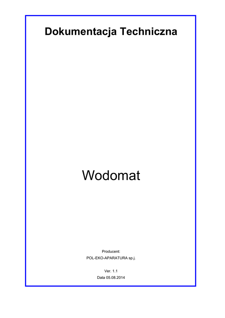 Dokumentacja Techniczna Wodomat Producent: POL-EKO-APARATURA sp.j. Ver. 1.1 Data 05.08.2014 Dokumentacja techniczna Wodomat Zawartość 1. Symbole użyte w dokumentacji ................................................................................... 3 2. Wstęp ............................................................................................................................. 3 3. Opis Wodomatu ............................................................................................................ 4 3.1. Parametry techniczne ............................................................................................................................. 4 3.2. Spis elementów wchodzących w skład urządzenia ................................................................................. 4 3.2.1. Dystrybutor duży ................................................................................................................................ 4 3.2.2. Dystrybutor mały ................................................................................................................................ 5 3.2.3. Pozostałe podzespoły ........................................................................................................................ 5 3.3. Komunikacja ........................................................................................................................................... 6 3.3.1. Montaż karty SIM ............................................................................................................................... 6 3.3.2. Opis działania ..................................................................................................................................... 7 3.3.3. Komunikaty SMS ................................................................................................................................ 8 3.4. 4. Zasada działania..................................................................................................................................... 8 Instrukcje ....................................................................................................................... 9 4.1. Instrukcja montażu.................................................................................................................................. 9 4.1.1. Instalacja kontenera ........................................................................................................................... 9 4.1.2. Instalacja oprogramowania................................................................................................................. 9 4.2. Instrukcja konserwacji ........................................................................................................................... 10 4.2.1. Menu serwisowe ............................................................................................................................... 10 4.3. Praca urządzenia w niskich temperaturach .......................................................................................... 12 4.4. Instrukcja remontowa ............................................................................................................................ 13 4.5. Instrukcja obsługi dla osoby obsługującej karty zbliżeniowe ................................................................. 15 4.6. Instrukcja obsługi dla Klientów Wodomatu ........................................................................................... 15 5. Elementy i materiały eksploatacyjne ......................................................................... 15 6. Rysunki techniczne .................................................................................................... 16 7. Załączniki .................................................................................................................... 17 POL-EKO-APARATURA sp.j. • ul. Kokoszycka 172 C • 44-300 Wodzisław Śl. • tel./fax +48/ 32 453 91 70 • e-mail [email protected] 2 Dokumentacja techniczna Wodomat Dziękujemy za zainteresowanie naszym produktem. Mamy nadzieję, że spełni on Państwa oczekiwania. W przypadku jakichkolwiek problemów prosimy kontaktować się z naszą firmą. Zapraszamy również do zgłaszania uwag i ewentualnych propozycji rozszerzenia programu o dodatkowe opcje. Zapraszamy na naszą stronę internetową www.pol-eko.com.pl. 1. Symbole użyte w dokumentacji Wskazówek zawartych w niniejszej dokumentacji, a zwłaszcza tych opatrzonych odpowiednim symbolem ostrzegawczym należy bezwzględnie przestrzegać, zarówno ze względu na bezpieczeństwo Użytkownika, jak i poprawną pracę urządzenia. Producent nie ponosi odpowiedzialności za szkody powstałe w wyniku nie stosowania się do zamieszczonych w instrukcji wskazówek. 2. Wstęp Wodomat jest urządzeniem do automatycznego wydawania wody. Woda może być pobierana z dystrybutora dużego (dla dużych zbiorników, beczkowozów) za pomocą złącza strażackiego DN80, lub za pomocą małego dystrybutora (kranu). Urządzenie wyposażone jest m.in. w: podświetlany i czytelny wyświetlacz LCD, (na nim wyświetlane są komunikaty pomocne przy użytkowaniu urządzenia przez Klienta) 5 przycisków sterujących, (dzięki nim Klient wprowadza wszystkie dane potrzebne do pobrania wody, np. żądana ilość, wybór dystrybutora) czytnik kart zbliżeniowych RFID (umożliwia obsługę kart zbliżeniowych potrzebnych do identyfikacji Klienta) Klient chcący pobrać wodę identyfikowany jest za pomocą karty zbliżeniowej, na której zapisane są informacje pozwalające na identyfikację Klienta. Podczas pobierania wody Klient może zatrzymać wydawanie wody naciskając przycisk STOP. Niewykorzystane środki zostaną zwrócone na kartę. Zwrot środków nastąpi również w przypadku przerwy w dostawie wody lub prądu. Środki na karcie Klienta można doładować za pomocą aplikacji Wodomat na wydzielonych stanowis