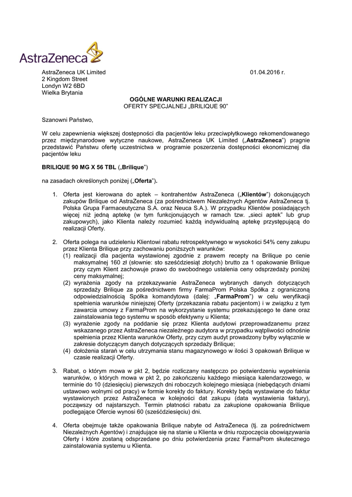 AstraZeneca UK Limited 2 Kingdom Street Londyn W2 6BD Wielka Brytania 01.04.2016 r. OGÓLNE WARUNKI REALIZACJI OFERTY SPECJALNEJ „BRILIQUE 90” Szanowni Państwo, W celu zapewnienia większej dostępności dla pacjentów leku przeciwpłytkowego rekomendowanego przez międzynarodowe wytyczne naukowe, AstraZeneca UK Limited („AstraZeneca”) pragnie przedstawić Państwu ofertę uczestnictwa w programie poszerzenia dostępności ekonomicznej dla pacjentów leku BRILIQUE 90 MG X 56 TBL („Brilique”) na zasadach określonych poniżej („Oferta”). 1. Oferta jest kierowana do aptek – kontrahentów AstraZeneca („Klientów”) dokonujących zakupów Brilique od AstraZeneca (za pośrednictwem Niezależnych Agentów AstraZeneca tj. Polska Grupa Farmaceutyczna S.A. oraz Neuca S.A.). W przypadku Klientów posiadających więcej niż jedną aptekę (w tym funkcjonujących w ramach tzw. „sieci aptek” lub grup zakupowych), jako Klienta należy rozumieć każdą indywidualną aptekę przystępującą do realizacji Oferty. 2. Oferta polega na udzieleniu Klientowi rabatu retrospektywnego w wysokości 54% ceny zakupu przez Klienta Brilique przy zachowaniu poniższych warunków: (1) realizacji dla pacjenta wystawionej zgodnie z prawem recepty na Brilique po cenie maksymalnej 160 zł (słownie: sto sześćdziesiąt złotych) brutto za 1 opakowanie Brilique przy czym Klient zachowuje prawo do swobodnego ustalenia ceny odsprzedaży poniżej ceny maksymalnej; (2) wyrażenia zgody na przekazywanie AstraZeneca wybranych danych dotyczących sprzedaży Brilique za pośrednictwem firmy FarmaProm Polska Spółka z ograniczoną odpowiedzialnością Spółka komandytowa (dalej: „FarmaProm”) w celu weryfikacji spełnienia warunków niniejszej Oferty (przekazania rabatu pacjentom) i w związku z tym zawarcia umowy z FarmaProm na wykorzystanie systemu przekazującego te dane oraz zainstalowania tego systemu w sposób efektywny u Klienta; (3) wyrażenie zgody na poddanie się przez Klienta audytowi przeprowadzanemu przez wskazanego przez AstraZeneca niezależnego audytora w przypadku wątpliwości odnośnie spełnienia przez Klienta warunków Oferty, przy czym audyt prowadzony byłby wyłącznie w zakresie dotyczącym danych dotyczących sprzedaży Brilique; (4) dołożenia starań w celu utrzymania stanu magazynowego w ilości 3 opakowań Brilique w czasie realizacji Oferty. 3. Rabat, o którym mowa w pkt 2, będzie rozliczany następczo po potwierdzeniu wypełnienia warunków, o których mowa w pkt 2, po zakończeniu każdego miesiąca kalendarzowego, w terminie do 10 (dziesięciu) pierwszych dni roboczych kolejnego miesiąca (niebędących dniami ustawowo wolnymi od pracy) w formie korekty do faktury. Korekty będą wystawiane do faktur wystawionych przez AstraZeneca w kolejności dat zakupu (data wystawienia faktury), począwszy od najstarszych. Termin płatności rabatu za zakupione opakowania Brilique podlegające Ofercie wynosi 60 (sześćdziesięciu) dni. 4. Oferta obejmuje także opakowania Brilique nabyte od AstraZeneca (tj. za pośrednictwem Niezależnych Agentów) i znajdujące się na stanie u Klienta w dniu rozpoczęcia obowiązywania Oferty i które zostaną odsprzedane po dniu potwierdzenia przez FarmaProm skutecznego zainstalowania systemu u Klienta. 5. Oferta jest ważna od 1 kwietnia 2016 r. roku do odwołania. 6. Opakowania Brilique zakupione przed datą zakończenia Oferty (odstąpienia od Oferty, wyłączenia z Oferty) będą rozliczone zgodnie z jej warunkami. 7. Oferta będzie realizowana przez Niezależnych Agentów AstraZeneca na identycznych zasadach dla wszystkich Klientów, którzy zaakceptowali warunki Oferty i przystąpili do realizacji Oferty. 8. Klient przyjmuje do wiadomości, że skuteczne zainstalowanie systemu, o którym mowa w pkt 2(2) Oferty (potwierdzenie przez FarmaProm skutecznego zainstalowania systemu) jest jednoznaczne z akceptacją przez Klienta wszystkich warunków Oferty i przystąpieniem przez Klienta do realizacji Oferty. 9. Zlecenia instalacji systemu będą przekazywane zgodnie z kolejnością ich wpływu w poniedziałek każdego tygodnia następującego po tygodniu, w którego dniach niebędących ustawowo dniami wolnymi od pracy Klient przekazał informację o chęci uczestnictwa w Ofercie na adres podany w pkt 12. AstraZeneca nie odpowiada za terminowość realizacji zleceń instalacji systemu przez FarmaProm. 10. AstraZeneca zastrzega sobie prawo wykluczenia Klienta z uczestnictwa w Ofercie w przypadku braku realizacji sprzedaży co najmniej jednego opakowania Brilique przez Klienta zgodnie z warunkami Oferty w okresie każdych 6 (sześciu) miesięcy trwania Oferty począwszy od dnia przystąpienia do Oferty. 11. AstraZeneca zastrzega sobie prawo do odstąpienia od Oferty wobec Klienta ze skutkiem natychmiastowym w przypadku, gdy audyt, o którym mowa w pkt 2(3) wykaże nieprawidłowości w realizacji Oferty lub w zakresie przestrzegania przepisów prawa. 12. W przypadku chęci skorzystania z Oferty Klient, który nie posiada zainstalowanego systemu, o którym mowa w pkt 2(2) Oferty, powinien przesłać wiadomość o treści: „Wyrażam chęć skorzystania z Oferty Specjalnej „Brilique 90 i w związku z tym proszę o zlecenie instalacji systemu FarmaProm w aptece: - Nazwa Apteki, - ulica, - kod pocztowy, miejscowość, - NIP - Osoba uprawniona do zawierania umów w imieniu apteki: (imię i nazwisko) - telefon kontaktowy do osoby upoważnionej na adres: [email protected] 13. W razie pytań prosimy o kontakt z jedną z poniżej wskazanych osób: Elżbietą Krupińską-Ptaszek (email: [email protected]) Moniką Wieczorek (email: [email protected]) Dominikiem Michalskim (email: [email protected]) 14. Niniejsza Oferta jest dostępna na stronie http://www.astrazenecauk.pl/oferty_handlowe.html 15. Wszelkie dane osobowe przekazane przez Klienta w związku z wolą skorzystania z Oferty, będą przetwarzane przez AstraZeneca w celu realizacji Oferty, a