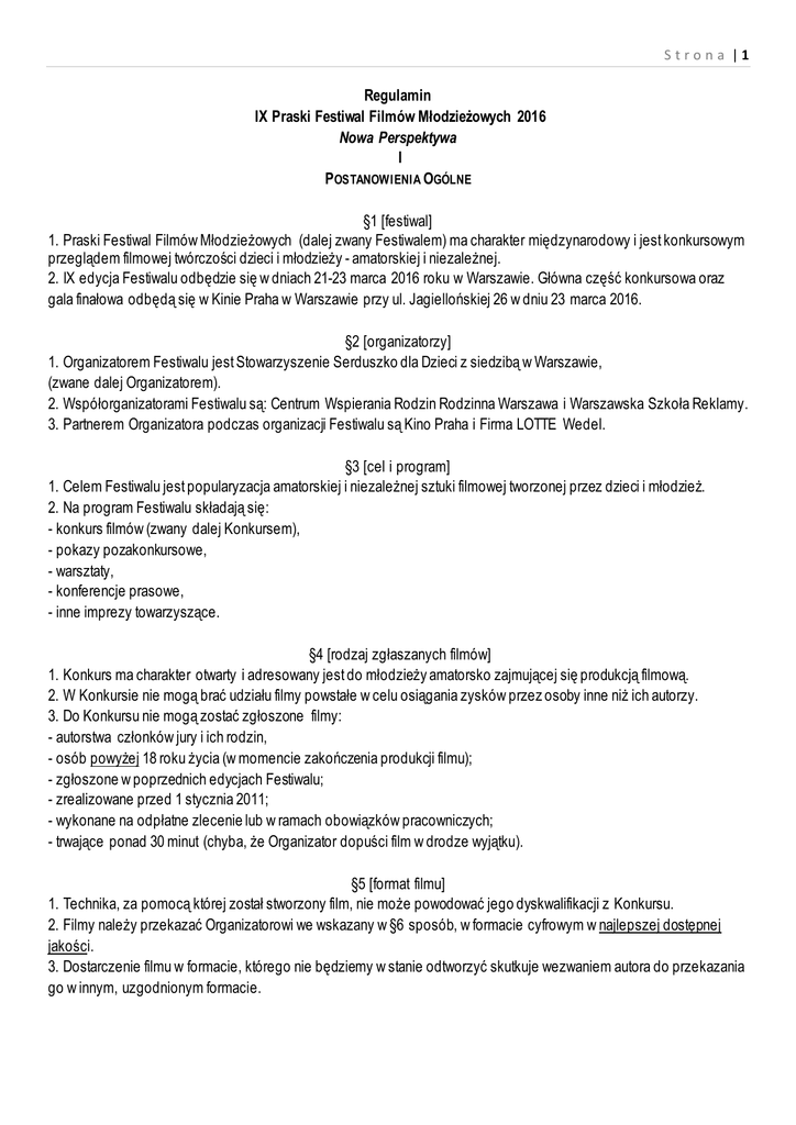 S tro n a |1 Regulamin IX Praski Festiwal Filmów Młodzieżowych 2016 Nowa Perspektywa I POSTANOWIENIA OGÓLNE §1 [festiwal] 1. Praski Festiwal Filmów Młodzieżowych (dalej zwany Festiwalem) ma charakter międzynarodowy i jest konkursowym przeglądem filmowej twórczości dzieci i młodzieży - amatorskiej i niezależnej. 2. IX edycja Festiwalu odbędzie się w dniach 21-23 marca 2016 roku w Warszawie. Główna część konkursowa oraz gala finałowa odbędą się w Kinie Praha w Warszawie przy ul. Jagiellońskiej 26 w dniu 23 marca 2016. §2 [organizatorzy] 1. Organizatorem Festiwalu jest Stowarzyszenie Serduszko dla Dzieci z siedzibą w Warszawie, (zwane dalej Organizatorem). 2. Współorganizatorami Festiwalu są: Centrum Wspierania Rodzin Rodzinna Warszawa i Warszawska Szkoła Reklamy. 3. Partnerem Organizatora podczas organizacji Festiwalu są Kino Praha i Firma LOTTE Wedel. §3 [cel i program] 1. Celem Festiwalu jest popularyzacja amatorskiej i niezależnej sztuki filmowej tworzonej przez dzieci i młodzież. 2. Na program Festiwalu składają się: - konkurs filmów (zwany dalej Konkursem), - pokazy pozakonkursowe, - warsztaty, - konferencje prasowe, - inne imprezy towarzyszące. §4 [rodzaj zgłaszanych filmów] 1. Konkurs ma charakter otwarty i adresowany jest do młodzieży amatorsko zajmującej się produkcją filmową. 2. W Konkursie nie mogą brać udziału filmy powstałe w celu osiągania zysków przez osoby inne niż ich autorzy. 3. Do Konkursu nie mogą zostać zgłoszone filmy: - autorstwa członków jury i ich rodzin, - osób powyżej 18 roku życia (w momencie zakończenia produkcji filmu); - zgłoszone w poprzednich edycjach Festiwalu; - zrealizowane przed 1 stycznia 2011; - wykonane na odpłatne zlecenie lub w ramach obowiązków pracowniczych; - trwające ponad 30 minut (chyba, że Organizator dopuści film w drodze wyjątku). §5 [format filmu] 1. Technika, za pomocą której został stworzony film, nie może powodować jego dyskwalifikacji z Konkursu. 2. Filmy należy przekazać Organizatorowi we wskazany w §6 sposób, w formacie cyfrowym w najlepszej dostępnej jakości. 3. Dostarczenie filmu w formacie, którego nie będziemy w stanie odtworzyć skutkuje wezwaniem autora do przekazania go w innym, uzgodnionym formacie. S tro n a |2 §6 [zgłaszanie filmu] 1. Zgłoszenie filmu do IX PFFM następuje za pośrednictwem strony internetowej www.ffm.org.pl (zakładka: zgłoś film) na której należy: a. wypełnić formularz zgłoszeniowy (oddzielnie dla każdego filmu) b. zatwierdzić go a wygenerowany plik w formacie .pdf wydrukować i podpisać samodzielnie (w przypadku osób niepełnoletnich - uzyskać także podpis prawnego opiekuna). c. załączyć plik z filmem i wgrać go na serwer Organizatora. d. podpisany formularz zgłoszeniowy wraz z kopią filmu (jeśli nie uda się go wgrać na serwer) wysłać na adres korespondencyjny Organizatora: ul. Jeżynowa 9a, 04-770 Warszawa, POLSKA 2. Filmy należy wysyłać do 1 marca 2016 (decyduje data nadania w placówce pocztowej). Filmy zgłoszone po wyznaczonym terminie nie zostaną dopuszczone do udziału w Konkursie, chyba że Organizator ze względu na szczególne okoliczności postanowi inaczej. 3. Autor filmu oświadcza, że zgłoszenie filmu nie narusza majątkowych i osobistych praw autorskich oraz dóbr osobistych osób trzecich. Organizator nie ponosi odpowiedzialności za ewentualne naruszenia prawa wynikające z nieuprawnionego zgłoszenia filmu do Konkursu. 4. Organizator zastrzega sobie prawo do wyłączenia z udziału w Konkursie filmów o niskiej jakości technicznej, a także naruszających prawo lub dobre obyczaje oraz godność osobistą jednostki. 5. Przekazanie Organizatorowi egzemplarza filmu wraz z kartą zgłoszeniową jest równoznaczne ze zgłoszeniem filmu do Konkursu i akceptacją warunków niniejszego regulaminu. 6. Przekazany Organizatorowi wraz ze zgłoszeniem do Konkursu egzemplarz filmu na nośniku cyfrowym staje się w momencie jego przekazania własnością Organizatora wraz z nośnikiem i nie podlega zwrotowi. Autor filmu nie może rościć sobie żadnego wynagrodzenia z tytułu pozostawienia nośnika cyfrowego w archiwum Organizatora. 7. Jeden twórca może zgłosić dowolną ilość filmów do Konkursu, każdy musi jednak zostać zgłoszony oddzielnie i znajdować się na osobnym nośniku lub jako oddzielne pliki na tym samym nośniku. §7 [filmy obcojęzyczne] Każdy film obcojęzyczny zgłoszony do Konkursu powinien być: a. opatrzony napisami w języku polskim lub gdy autor nie ma możliwości dokonania tłumaczenia: b. mieć dołączoną w formacie tekstowym spisaną oryginalną ścieżkę dialogową z podziałem na sekwencje i podanym czasem ich wyświetlania. Organizator określi szczegółowo sposób zapisu ścieżki dialogowej i sam - w miarę posiadanych możliwości - dokona tłumaczenia na język polski. §8 [zgoda na wykorzystanie] 1. Autor filmu zgadza się na projekcję zgłoszonego filmu podczas trwania Festiwalu oraz innych wydarzeń mieszczących się w programie Festiwalu, a także na projekcje pofestiwalowe, przygotowane przez Organizatora. 2. Autor filmu zgadza się na wykorzystanie swojego filmu w programach telewizyjnych, relacjonujących lub promujących Festiwal, a także w internecie. 3. Jeżeli film nie był jeszcze udostępniony publiczności, jego zgłoszenie na Festiwal jest równoznaczne z wyrażeniem przez autora zgody na jego pierwsze udostępnienie publiczności. 4. Autor oświadcza, że nie będzie podnosił jakichkolwiek roszczeń do wynagrodzenia z tytułu publicznych emisji swojego filmu podczas trwania Festiwalu oraz po jego zakończeniu w pokazach promujących Festiwal, pokazów organizowanych i współorganizowanych przez Organizatora. 5. Zgłaszając film na Festiwal autor wyraża tym samym zgodę na umieszczenie filmu na niekomercyjnych płytach DVD promujących wydarzenie. S tro n a |3 §9 [zakwalifikowanie do konkursu] 1. Kwalifikacji 