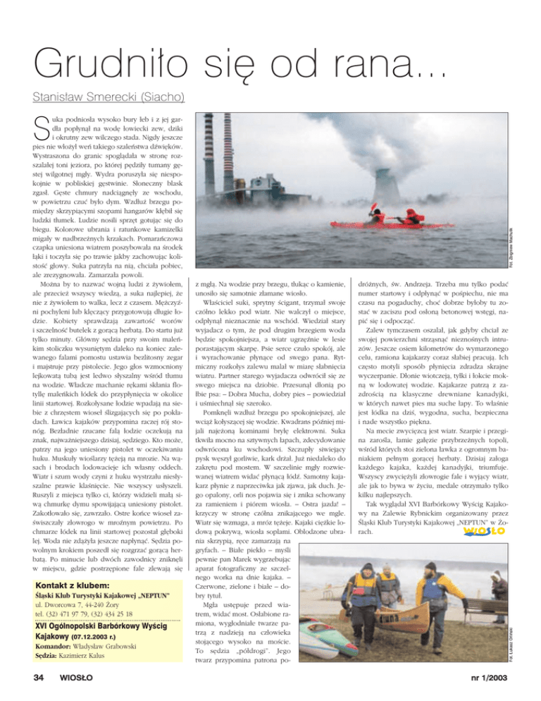 Grudni³o siê od rana... Stanis³aw Smerecki (Siacho) uka podniosła wysoko bury łeb i z jej gar− dła popłynął na wodę łowiecki zew, dziki i okrutny zew wilczego stada. Nigdy jeszcze pies nie włożył weń takiego szaleństwa dźwięków. Wystraszona do granic spoglądała w stronę roz− szalałej toni jeziora, po której pędziły tumany gę− stej wilgotnej mgły. Wydra poruszyła się niespo− kojnie w pobliskiej gęstwinie. Słoneczny blask zgasł. Gęste chmury nadciągnęły ze wschodu, w powietrzu czuć było dym. Wzdłuż brzegu po− między skrzypiącymi szopami hangarów kłębił się ludzki tłumek. Ludzie nosili sprzęt gotując się do biegu. Kolorowe ubrania i ratunkowe kamizelki migały w nadbrzeżnych krzakach. Pomarańczowa czapka uniesiona wiatrem poszybowała na środek łąki i toczyła się po trawie jakby zachowując koli− stość głowy. Suka patrzyła na nią, chciała pobiec, ale zrezygnowała. Zamarzała powoli. Można by to nazwać wojną ludzi z żywiołem, ale przecież wszyscy wiedzą, a suka najlepiej, że nie z żywiołem to walka, lecz z czasem. Mężczyź− ni pochyleni lub klęczący przygotowują długie ło− dzie. Kobiety sprawdzają zawartość worów i szczelność butelek z gorącą herbatą. Do startu już tylko minuty. Główny sędzia przy swoim maleń− kim stoliczku wysuniętym daleko na koniec zale− wanego falami pomostu ustawia bezlitosny zegar i majstruje przy pistolecie. Jego głos wzmocniony lejkowatą tubą jest ledwo słyszalny wśród tłumu na wodzie. Władcze machanie rękami skłania flo− tyllę maleńkich łódek do przypłynięcia w okolice linii startowej. Rozkołysane łodzie wpadają na sie− bie z chrzęstem wioseł ślizgających się po pokła− dach. Ławica kajaków przypomina raczej rój sto− nóg. Bezładnie rzucane falą łodzie oczekują na znak, najważniejszego dzisiaj, sędziego. Kto może, patrzy na jego uniesiony pistolet w oczekiwaniu huku. Muskuły wioślarzy tężeją na mrozie. Na wą− sach i brodach lodowacieje ich własny oddech. Wiatr i szum wody czyni z huku wystrzału niesły− szalne prawie klaśnięcie. Nie wszyscy usłyszeli. Ruszyli z miejsca tylko ci, którzy widzieli małą si− wą chmurkę dymu spowijającą uniesiony pistolet. Zakotłowało się, zawrzało. Ostre końce wioseł za− świszczały złowrogo w mroźnym powietrzu. Po chmarze łódek na linii startowej pozostał głęboki lej. Woda nie zdążyła jeszcze napłynąć. Sędzia po− wolnym krokiem poszedł się rozgrzać gorącą her− batą. Po minucie lub dwóch zawodnicy zniknęli w miejscu, gdzie postrzępione fale zlewają się Śląski Klub Turystyki Kajakowej „NEPTUN” ul. Dworcowa 7, 44−240 Żory tel. (32) 471 97 79, (32) 434 25 18 XVI Ogólnopolski Barbórkowy Wyœcig Kajakowy (07.12.2003 r.) Komandor: Władysław Grabowski Sędzia: Kazimierz Kalus 34 WIOS£O z mgłą. Na wodzie przy brzegu, tłukąc o kamienie, unosiło się samotnie złamane wiosło. Właściciel suki, sprytny ścigant, trzymał swoje czółno lekko pod wiatr. Nie walczył o miejsce, odpłynął nieznacznie na wschód. Wiedział stary wyjadacz o tym, że pod drugim brzegiem woda będzie spokojniejsza, a wiatr ugrzęźnie w lesie porastającym skarpę. Psie serce czuło spokój, ale i wyrachowanie płynące od swego pana. Ryt− miczny rozkołys zalewu malał w miarę słabnięcia wiatru. Partner starego wyjadacza odwrócił się ze swego miejsca na dziobie. Przesunął dłonią po łbie psa: – Dobra Mucha, dobry pies – powiedział i uśmiechnął się szeroko. Pomknęli wzdłuż brzegu po spokojniejszej, ale wciąż kołyszącej się wodzie. Kwadrans później mi− jali najeżoną kominami bryłę elektrowni. Suka tkwiła mocno na sztywnych łapach, zdecydowanie odwrócona ku wschodowi. Szczupły siwiejący pysk węszył gorliwie, kark drżał. Już niedaleko do zakrętu pod mostem. W szczelinie mgły rozwie− wanej wiatrem widać płynącą łódź. Samotny kaja− karz płynie z naprzeciwka jak zjawa, jak duch. Je− go opalony, orli nos pojawia się i znika schowany za ramieniem i piórem wiosła. – Ostra jazda! – krzyczy w stronę czółna znikającego we mgle. Wiatr się wzmaga, a mróz tężeje. Kajaki ciężkie lo− dową pokrywą, wiosła soplami. Oblodzone ubra− nia skrzypią, ręce zamarzają na gryfach. – Białe piekło – myśli pewnie pan Marek wygrzebując aparat fotograficzny ze szczel− nego worka na dnie kajaka. – Czerwone, zielone i białe – do− bry tytuł. Mgła ustępuje przed wia− trem, widać most. Osłabione ra− miona, wygłodniałe twarze pa− trzą z nadzieją na człowieka stojącego wysoko na moście. To sędzia „półdrogi”. Jego twarz przypomina patrona po− dróżnych, św. Andrzeja. Trzeba mu tylko podać numer startowy i odpłynąć w pośpiechu, nie ma czasu na pogaduchy, choć dobrze byłoby tu zo− stać w zaciszu pod osłoną betonowej wstęgi, na− pić się i odpocząć. Zalew tymczasem oszalał, jak gdyby chciał ze swojej powierzchni strząsnąć nieznośnych intru− zów. Jeszcze osiem kilometrów do wymarzonego celu, ramiona kajakarzy coraz słabiej pracują. Ich często motyli sposób płynięcia zdradza skrajne wyczerpanie. Dłonie wiotczeją, tyłki i łokcie mok− ną w lodowatej wodzie. Kajakarze patrzą z za− zdrością na klasyczne drewniane kanadyjki, w których nawet pies ma suche łapy. To właśnie jest łódka na dziś, wygodna, sucha, bezpieczna i nade wszystko piękna. Na mecie zwycięzcą jest wiatr. Szarpie i przegi− na zarośla, łamie gałęzie przybrzeżnych topoli, wśród których stoi zielona ławka z ogromnym ba− niakiem pełnym gorącej herbaty. Dzisiaj załoga każdego kajaka, każdej kanadyjki, triumfuje. Wszyscy zwyciężyli złowrogie fale i wyjący wiatr, ale jak to bywa w życiu, medale otrzymało tylko kilku najlepszych. Tak wyglądał XVI Barbórkowy Wyścig Kajako− wy na Zalewie Rybnickim organizowan