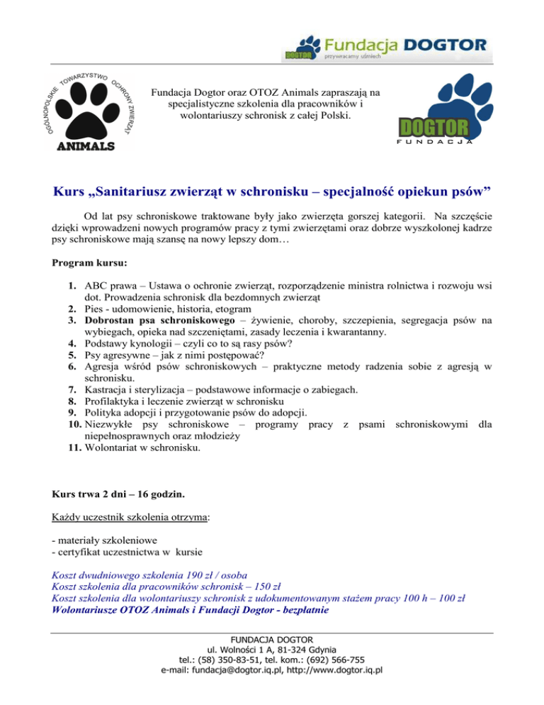 Fundacja Dogtor oraz OTOZ Animals zapraszają na specjalistyczne szkolenia dla pracowników i wolontariuszy schronisk z całej Polski. Kurs „Sanitariusz zwierząt w schronisku – specjalność opiekun psów” Od lat psy schroniskowe traktowane były jako zwierzęta gorszej kategorii. Na szczęście dzięki wprowadzeni nowych programów pracy z tymi zwierzętami oraz dobrze wyszkolonej kadrze psy schroniskowe mają szansę na nowy lepszy dom… Program kursu: 1. ABC prawa – Ustawa o ochronie zwierząt, rozporządzenie ministra rolnictwa i rozwoju wsi dot. Prowadzenia schronisk dla bezdomnych zwierząt 2. Pies - udomowienie, historia, etogram 3. Dobrostan psa schroniskowego – Ŝywienie, choroby, szczepienia, segregacja psów na wybiegach, opieka nad szczeniętami, zasady leczenia i kwarantanny. 4. Podstawy kynologii – czyli co to są rasy psów? 5. Psy agresywne – jak z nimi postępować? 6. Agresja wśród psów schroniskowych – praktyczne metody radzenia sobie z agresją w schronisku. 7. Kastracja i sterylizacja – podstawowe informacje o zabiegach. 8. Profilaktyka i leczenie zwierząt w schronisku 9. Polityka adopcji i przygotowanie psów do adopcji. 10. Niezwykłe psy schroniskowe – programy pracy z psami schroniskowymi dla niepełnosprawnych oraz młodzieŜy 11. Wolontariat w schronisku. Kurs trwa 2 dni – 16 godzin. KaŜdy uczestnik szkolenia otrzyma: - materiały szkoleniowe - certyfikat uczestnictwa w kursie Koszt dwudniowego szkolenia 190 zł / osoba Koszt szkolenia dla pracowników schronisk – 150 zł Koszt szkolenia dla wolontariuszy schronisk z udokumentowanym staŜem pracy 100 h – 100 zł Wolontariusze OTOZ Animals i Fundacji Dogtor - bezpłatnie FUNDACJA DOGTOR ul. Wolności 1 A, 81-324 Gdynia tel.: (58) 350-83-51, tel. kom.: (692) 566-755 e-mail: [email protected], http://www.dogtor.iq.pl Zgłoszenia na szkolenie moŜna przesyłać pocztą elektroniczną na adres [email protected] . Warunkiem uczestnictwa w szkoleniu jest przesłanie zgłoszenia oraz wpłacenie kwoty 250 zł za kurs. Bezpośrednio po otrzymaniu wpłaty kaŜdy uczestnik otrzyma e-mail ze szczegółami dotyczącymi szkolenia. Zainteresowanym wystawiamy rachunki. Szkolenie odbywa się w Gdyni w siedzibie Fundacji Dogtor. Organizator nie zapewnia wyŜywienia i noclegów! Dochód z kursów przeznaczony jest na cele statutowe fundacji Dogtor oraz programy edukacyjne prowadzone razem z OTOZ Animals oraz Schroniskiem w Gdyni. Nasze kursy to wiedza praktyczna wynikająca z wieloletniego doświadczenia w prowadzeniu schronisk i pracy z bezdomnymi zwierzętami! Serdecznie zapraszamy! FUNDACJA DOGTOR ul. Wolności 1 A, 81-324 Gdynia tel.: (58) 350-83-51, tel. kom.: (692) 566-755 e-mail: [email protected], http://www.dogtor.iq.pl