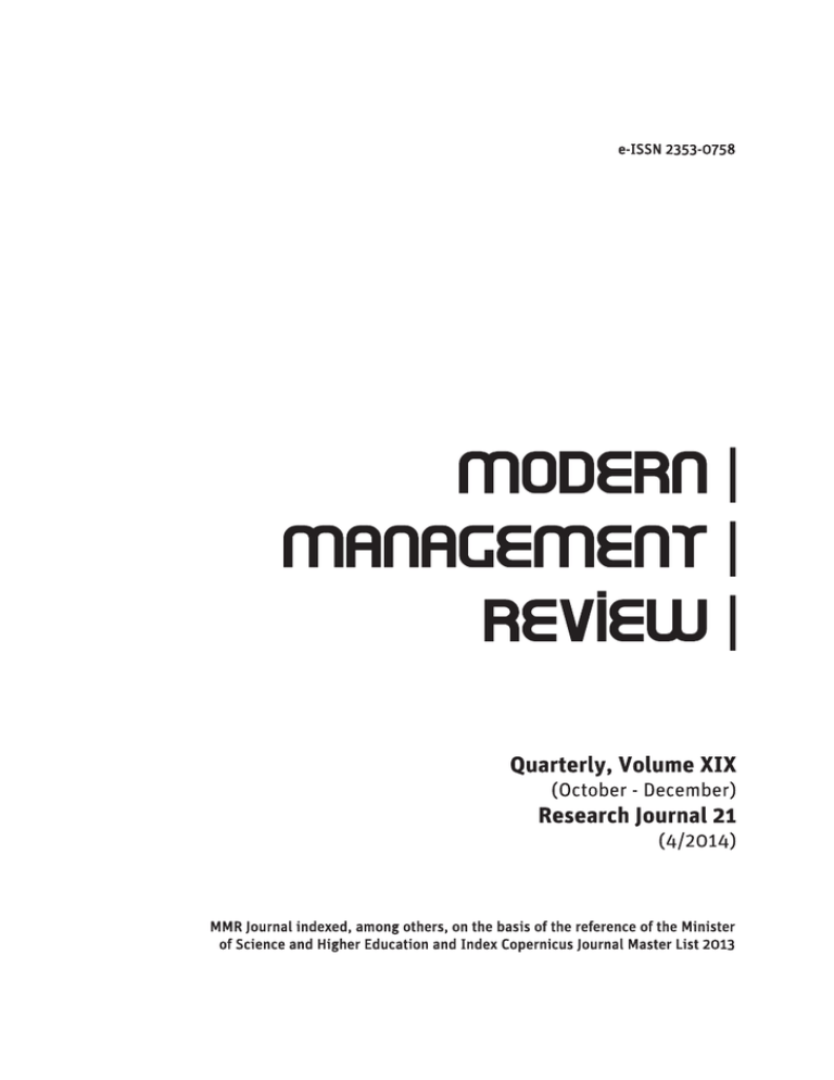 Issued with the consent of the Rector Editor in Chief Publishing House of Rzeszow University of Technology Leonard ZIEMIAŃSKI Composition of the Scientific Papers Council of the Faculty of Management of Rzeszow University of Technology „Modern Management Review” Grzegorz OSTASZ – chairman (Poland) Joanna WIAśEWICZ – editorial assistant (Poland) members: Gerhard BANSE (Germany), Joe BOGUE (Ireland), Gérard Kokou DOKOU (France) Andriy GERASYMCHUK (Ukraine), Aleš GREGAR (the Czech Republic) Danuta HÜBNER (Poland), Andrzej KALETA (Poland), Jerzy KISIELNICKI (Poland) Dušan MALINDŽÁK (Slovakia), Aleksandr RAZIN (Russia), Antonio STASI (Italia) Róbert ŠTEFKO (Slovakia), Josu TAKALA (Finland), Tamara TKACH (Ukraine) Karsten WEBER (Germany), Gabriel WEISS (Slovakia), Leszek WOŹNIAK (Poland) Editor in Chief Grzegorz OSTASZ (Poland) Editorial Committee (Thematic editors) Jan ADAMCZYK (Poland), Władysław FILAR (Poland), Stanisław GĘDEK (Poland) Mirosław ŚMIESZEK (Poland), Leszek WOŹNIAK (Poland) Statistical editor Tomasz PISULA (Poland) Paweł HYDZIK (Poland) Members of editorial staff Agata GIERCZAK (Poland), Grzegorz LEW (Poland) Paweł PERZ (Poland), Justyna STECKO (Poland), Dariusz WYRWA (Poland) Beata ZATWARNICKA-MADURA (Poland) Language editors Glyn David GRIFFITHS (The United Kingdom), Tatiana GUGNINA (Poland) Alewtina ŁAWRINIENKO (Russia), Ruth MALOSZEK (Germany) Magdalena REJMAN-ZIENTEK (Poland), Anna ROMAN (Poland) Project of the cover Damian GĘBAROWSKI The printed version of the Journal is an original version. p-ISSN 2300-6366 e-ISSN 2300-0758 Publisher: Publishing House of Rzeszow University of Technology 12 Powstańców Warszawy Ave., 35-959 Rzeszow (e-mail: [email protected]) http://www.oficyna.portal.prz.edu.pl Editorial Office: Rzeszow University of Technology, The Faculty of Management, 10 Powstańców Warszawy Ave., 35-959 Rzeszów, phone: +48 17 8651383, e-mail: [email protected] http://mmr.prz.edu.pl/ Additional information and an imprint – p. 281 SPIS TREŚCI Od Komitetu Redakcyjnego ............................................................................................... 7 Bogusław Bembenek: The importance of organizational culture in cluster management ........................................................................................................................ 9 Krzysztof Borowski: Analiza uwarunkowań inwestycyjnych na rynku diamentów ........................................................................................................................ 25 Kazimierz Cyran: Cena jako wyznacznik jakości produktów Ŝywnościowych ............. 47 Paulina Filip: Znaczenie kapitału finansowego w procesach rozwojowych przedsiębiorstw ................................................................................................................ 61 Marcin Gębarowski: Ocena zasadności uczestnictwa w wystawach światowych (w kontekście aktywności wystawienniczej Polski podczas Expo 2010 w Szanghaju) .................................................................................................................... 73 Sylwia Grodecka, Agata Gierczak: Empatia w przywództwie: kultura organizacyjna instytucji edukacyjnej oparta na współodczuwaniu ................................... 87 Ryszard Janikowski: Nieprzewidywalność w zarządzaniu przedsiębiorstwem ............. 99 Igor Liberko, Lucia Bednárová, Marianna Dúbravská, Andrzej Pacana: Marketing audit and possibilities of forecasting .............................................................................. 123 Ondřej Novosad: Behind Mali’s conflict - myths, realities & unknowns...................... 131 Antoni Olak: Zjawisko bezrobocia a zagroŜenie społeczne .......................................... 141 Monika Piątkowska: Rozpoznawalność marek oficjalnych sponsorów i ambush marketerów podczas XXII Zimowych Igrzysk Olimpijskich w Soczi ........................... 157 Teresa Piecuch, Małgorzata Piecuch: Analiza sytuacji młodych ludzi na rynku pracy – rozwaŜania teoretyczne i badania empiryczne .................................................. 175 Anna Prusak, Gene Rowe, Jacek Strojny: Is GMO “sustainable”? A review of the environmental risks of GM plants in comparison with conventional and organic crops ............................................................................................................ 187 Sabina Rokita: MoŜliwości wykorzystania klasyfikacji działalności badawczorozwojowej w zarządzaniu przedsiębiorstwem .............................................................. 201 Mirosław Sołtysiak: Ryzyko i zarządzanie ryzykiem w jednostkach samorządu terytorialnego ................................................................................................................. 211 Justyna Stecko, Małgorzata Baran: Building commitment and trust of value in the modern enterprise .................................................................................................. 221 Magdalena Szydełko: Atrybuty i czynniki sukcesu partnerstwa przedsiębiorstw .............................................................................................................. 231 Anna Walczyna, Anna Arent: Stresogenność pracy przedsiębiorcy w ocenie studentów – wyniki badań pilotaŜowych ....................................................................... 243 Anna Wrycol: The impact of green certificates on profitability of Polish wind farms .............................................................................................................................. 257 Grzegorz Zimon, Dominik Zimon: Influence of quality management systems on the financial capital management strategies in trading companies ........................... 265 Lista recenzentów współpracujących z „Modern Management Review” ............... 275 Lista artykułów opublikowanych w „Modern Management Review” w 2014 r. .... 277 CONTENTS Fr