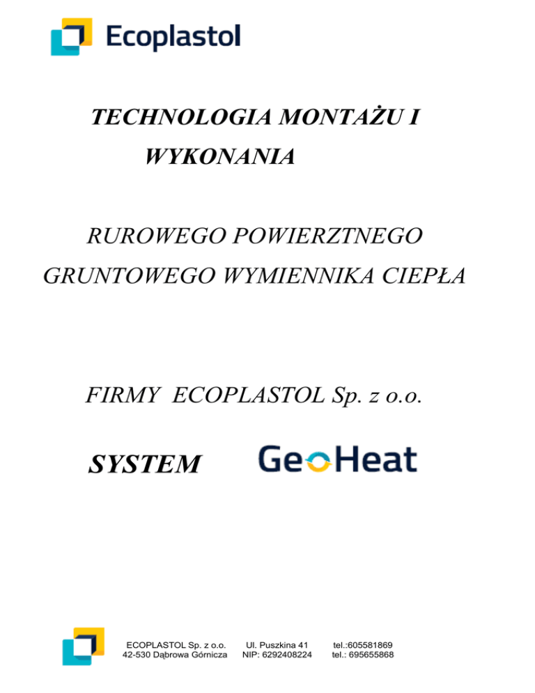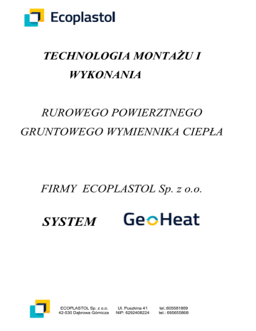 TECHNOLOGIA MONTAŻU I WYKONANIA RUROWEGO POWIERZTNEGO GRUNTOWEGO WYMIENNIKA CIEPŁA FIRMY ECOPLASTOL Sp. z o.o. SYSTEM ECOPLASTOL Sp. z o.o. 42-530 Dąbrowa Górnicza Ul. Puszkina 41 NIP: 6292408224 tel.:605581869 tel.: 695655868 1. WSTĘP Rurowy Gruntowy Wymiennik Ciepła firmy ECOPLASTOL sp. z o.o. służy do wspomagania wentylacji mechanicznej w nowoczesnych budynkach mieszkaniowych, przemysłowych i administracji publicznej. System GEOHEAT składa się z rur i kształtek elektrooporowych i doczołowych wykonanych z najwyższej jakości surowca HDPE100 (polietylenu wysokiej gęstości). Surowiec ten, z powodzeniem stosowany jest od lat 70 XX wieku w budowie gazociągów i wodociągów. Zastosowanie systemu elektrooporowego i doczołowego zapewnia 100% szczelność na połączeniach i długowieczność. Minimalny okres użytkowania takiego systemu to minimum 30-50 lat bezawaryjnej pracy. W celu nie dopuszczenia do rozwoju mikroorganizmów w systemie GWC zastosowano warstwę NANOSREBRA w rurach systemu GEOHEAT. 2. RODZAJE INSTALACJI GWC GEOHEAT Istnieją trzy podstawowe rodzaje możliwości układania GWC na terenie do tego przeznaczonym, i wynikają one z wielkości, kształtu i/lub indywidualnych preferencji inwestora. * Układ Tichelmanna: ECOPLASTOL Sp. z o.o. 42-530 Dąbrowa Górnicza Ul. Puszkina 41 NIP: 6292408224 tel.:605581869 tel.: 695655868 * Układ Pierścieniowy: *Układ Meandrowy: ECOPLASTOL Sp. z o.o. 42-530 Dąbrowa Górnicza Ul. Puszkina 41 NIP: 6292408224 tel.:605581869 tel.: 695655868 3. DZIAŁANIE GRUNTOWEGO WYMIENNIKA CIEPŁA Zasada działania GWC polega na wykorzystaniu dużej bezwładności temperaturowej gruntu . Polega to na tym, że temperatura na pewnej głębokości posiada stałą temperaturę niezależnie od tego jaka aktualnie jest pora roku i jakie temperatury powietrza są na zewnątrz. Zakopując układ GWC poniżej strefy zamarzania (od 1,8 do 2,5 m ppt) jesteśmy w stanie uzyskać, w zimie temperatury powietrza powyżej zera, natomiast latem schłodzić powietrze do temperatury 16-18 stopni w największe nawet upały. Uzyskane zyski ciepła zimą i chłodu latem przekładają się wprost na koszty ogrzewania/chłodzenia budynków i zapewniają dodatkowy komfort świeżego powietrza bez konieczności otwierania okien i wietrzenia(straty energii). Koszt eksploatacji jest ponad 40 razy niższy od klimatyzacji tradycyjnej. Pamiętajmy, ponosimy tylko koszty przesyłu powietrza, a nie jego chłodzenia czy ogrzewania. 4. ELEMENTY GWC GEOHEAT . Czerpnia powietrza z filtrem klasy EU4 i siatką metalową zabezpieczającą przed dostawaniem się do środka gryzoni. Dobór czerpni zależy od wielkości przepływu powietrza przez GWC. Zastosowanie filtra0 utrudnia przedostawanie się do GWC pyłków, mikroorganizmów i innych drobnych frakcji zawartych w powietrzu zewnętrznym. Na życzenie można zastosować filtr z nanosrebrem, który zapewnia brak rozwoju bakterii na filtrze. - Rury i kształtki elektrooporowe i doczołowe. Rury wykonane z polietylenu wysokiej gęstości HDPE100 z wewnętrzną warstwą nanosrebra, kształtki elektrooporowe i doczołowe wykonane z polietylenu HDPE100. Instrukcja zgrzewania elektrooporowego i doczołowego znajduje się w instrukcji „ Instrukcja zgrzewania GEOHEAT” ECOPLASTOL Sp. z o.o. 42-530 Dąbrowa Górnicza Ul. Puszkina 41 NIP: 6292408224 tel.:605581869 tel.: 695655868 - Szczelne przejście przez budynek. Szczelne przejście przez budynek to specjalny element, który pozwala nam w sposób szczelny i bezpieczny wprowadzić rurę z systemu GWC do wewnątrz budynku. - Usuwanie kondensatu. Latem podczas przepływania ciepłego powietrza przez GWC następuje jego ochłodzenie i wykroplenie wilgoci. Wodę powstałą w ten sposób należy odprowadzić za pomocą specjalnego, przeznaczonego do tego elementu, do studzienki lub kanalizacji. - . Rury i kształtki systemu GEOHEAT. Rury i kształtki to elementy niezbędne do wykonania szczelnego i bezawaryjnego systemu rurowego GWC, są to rury HDPE100 z wewnętrzną warstwą nanosrebra w typoszeregu od średnicy fi 110 mm do 450 mm i SDR od 21 do 26. Kształtki to przede wszystkim mufy, kolana, trójniki, odgałęzienia siodłowe elektrooporwe i kształtki doczołowe od średnicy 110 do średnicy 450 m. 5. INSTRUKCJA MONTAŻU GWC GEOHEAT. W przypadku układu Tichelmanna wykonuje się jeden wykop o powierzchni odpowiednio większej( możliwość prac instalacyjnych w wykopie) od powierzchni zajmowanej przez GWC, natomiast w pozostałych przypadkach – układ pierścieniowy i meandrowy- wykonuje się wykop pod daną średnicę zgodnie z normami PN-ENV 1046; PN-B-10736. ECOPLASTOL Sp. z o.o. 42-530 Dąbrowa Górnicza Ul. Puszkina 41 NIP: 6292408224 tel.:605581869 tel.: 695655868 Rys. 1. 1 szerokość wykopu 2 głębokość przykrycia 3 zasypka wstępna od 100 mm do 300 mm 4 powierzchnia terenu 5 grunt rodzimy 6 strefa ułożenia przewodu 7 zasypka główna 8 strefa rury 9 strefa pachwiny rury 10 wyrównanie wykopu 11 dno wykopu 12 podłoże, jeśli jest wymagane 13 podsypka, jeśli jest wymagana 5.1. Szerokość wykopu Szerokość wykopu wyznacza się na podstawie projektu instalacji GWC. Nie ma potrzeby aby szerokość wykopu była większa niż do koniecznego zapewnienia odpowiedniego miejsca do podłączenia rury w wykopie i zagęszczenia zasypki w dolnej strefie rury. Typowe wartości dla bs (rys.1) podano w tabeli 1. ECOPLASTOL Sp. z o.o. 42-530 Dąbrowa Górnicza Ul. Puszkina 41 NIP: 6292408224 tel.:605581869 tel.: 695655868 TABELA 1. 5.2. Głębokość wykopu Głębokość wykopu wyznacza się na podstawie projektu instalacji GWC. W przypadku gruntów trudnych do zagęszczenia lub kamienistych konieczne jest aby głębokość wykopu uwzględniała wysokość podsypki. Podsypkę wykonać z materiału piaszczystego możliwego do zagęszczenia. GWC należy posadowić na głębokości min. 1,8 metra tak aby przykrycie zapewniało dostateczną ochronę przed przypadkowym wypieranie