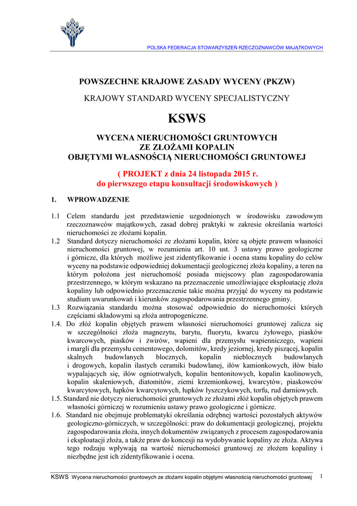 POLSKA FEDERACJA STOWARZYSZEŃ RZECZOZNAWCÓW MAJĄTKOWYCH POWSZECHNE KRAJOWE ZASADY WYCENY (PKZW) KRAJOWY STANDARD WYCENY SPECJALISTYCZNY KSWS WYCENA NIERUCHOMOŚCI GRUNTOWYCH ZE ZŁOŻAMI KOPALIN OBJĘTYMI WŁASNOŚCIĄ NIERUCHOMOŚCI GRUNTOWEJ ( PROJEKT z dnia 24 listopada 2015 r. do pierwszego etapu konsultacji środowiskowych ) 1. WPROWADZENIE 1.1 Celem standardu jest przedstawienie uzgodnionych w środowisku zawodowym rzeczoznawców majątkowych, zasad dobrej praktyki w zakresie określania wartości nieruchomości ze złożami kopalin. 1.2 Standard dotyczy nieruchomości ze złożami kopalin, które są objęte prawem własności nieruchomości gruntowej, w rozumieniu art. 10 ust. 3 ustawy prawo geologiczne i górnicze, dla których możliwe jest zidentyfikowanie i ocena stanu kopaliny do celów wyceny na podstawie odpowiedniej dokumentacji geologicznej złoża kopaliny, a teren na którym położona jest nieruchomość posiada miejscowy plan zagospodarowania przestrzennego, w którym wskazano na przeznaczenie umożliwiające eksploatację złoża kopaliny lub odpowiednio przeznaczenie takie można przyjąć do wyceny na podstawie studium uwarunkowań i kierunków zagospodarowania przestrzennego gminy. 1.3 Rozwiązania standardu można stosować odpowiednio do nieruchomości których częściami składowymi są złoża antropogeniczne. 1.4. Do złóż kopalin objętych prawem własności nieruchomości gruntowej zalicza się w szczególności złoża magnezytu, barytu, fluorytu, kwarcu żyłowego, piasków kwarcowych, piasków i żwirów, wapieni dla przemysłu wapienniczego, wapieni i margli dla przemysłu cementowego, dolomitów, kredy jeziornej, kredy piszącej, kopalin skalnych budowlanych blocznych, kopalin nieblocznych budowlanych i drogowych, kopalin ilastych ceramiki budowlanej, iłów kamionkowych, iłów biało wypalających się, iłów ogniotrwałych, kopalin bentonitowych, kopalin kaolinowych, kopalin skaleniowych, diatomitów, ziemi krzemionkowej, kwarcytów, piaskowców kwarcytowych, łupków kwarcytowych, łupków łyszczykowych, torfu, rud darniowych. 1.5. Standard nie dotyczy nieruchomości gruntowych ze złożami złóż kopalin objętych prawem własności górniczej w rozumieniu ustawy prawo geologiczne i górnicze. 1.6. Standard nie obejmuje problematyki określania odrębnej wartości pozostałych aktywów geologiczno-górniczych, w szczególności: praw do dokumentacji geologicznej, projektu zagospodarowania złoża, innych dokumentów związanych z procesem zagospodarowania i eksploatacji złoża, a także praw do koncesji na wydobywanie kopaliny ze złoża. Aktywa tego rodzaju wpływają na wartość nieruchomości gruntowej ze złożem kopaliny i niezbędne jest ich zidentyfikowanie i ocena. KSWS Wycena nieruchomości gruntowych ze złożami kopalin objętymi własnością nieruchomości gruntowej 1 POLSKA FEDERACJA STOWARZYSZEŃ RZECZOZNAWCÓW MAJĄTKOWYCH 2. PRZEDMIOT I ZAKRES STOSOWANIA STANDARDU 2.1. Przedmiotem standardu są nieruchomości gruntowe ze złożami kopalin, które są objęte prawem własności nieruchomości gruntowej lub ich części składowe oraz nieruchomości po zakończeniu eksploatacji złóż kopalin. 2.2. Zakres stosowania standardu obejmuje w szczególności: a) nieruchomości gruntowe ze złożami kopalin objętymi prawem własności nieruchomości gruntowej, b) nieruchomości gruntowe ze złożami kopalin jako przedmiot użytkowania wieczystego, c) nieruchomości gruntowe ze złożami kopalin jako przedmiot ograniczonych praw rzeczowych lub obciążonych prawami zobowiązaniowymi, d) części nieruchomości gruntowych, które są lub mogą być związane z eksploatacją złoża (działalnością górniczą), np.: obszar górniczy, teren górniczy, części nieruchomości oznaczone w ewidencji gruntów i budynków jako użytki kopalne lub inne części wyodrębniane ze względu na sposób użytkowania, e) złoża kopalin stanowiące część składową nieruchomości gruntowej. 2.3. Jeżeli z przepisów prawa, umowy z zamawiającym lub innego zamówienia wynika, że z zakresu wyceny wyłączana jest określona część składowa nieruchomości (w rozumieniu art. 48 kodeksu cywilnego), przynależność, pożytek lub grunt, to powinno to być wyraźnie zaznaczone i uzasadnione w operacie szacunkowym. 2.4. Wycena może dotyczyć także określenia wartości szkód poczynionych na nieruchomości ze złożem kopaliny lub ograniczenia jej własności w zakresie korzystania, czerpania pożytków i rozporządzania. 2.5. Określenia wartości nieruchomości ze złożem kopaliny składającej się z wyodrębnionych części o różnym zawansowaniu realizacji projektu geologiczno-górniczego oraz o wielu sposobach użytkowania, można dokonać poprzez wydzielenie funkcjonalnych części celem ich odrębnej wyceny w granicach danej nieruchomości. Nieruchomości tego rodzaju często charakteryzują się dużym zróżnicowaniem występujących na nich użytków gruntowych, obiektów budowlanych i ich funkcji oraz ich stanu technicznoużytkowego, jak również stanu zagospodarowania, w tym istnienia części nieruchomości ze złożami kopalin Podział nieruchomości na funkcjonalne części powinien uwzględniać granice geodezyjne, granice planistyczne lub granice wynikające z innych regulacji prawnych albo granice ustalone przez rzeczoznawcę majątkowego dla potrzeb wyceny. 3. OKREŚLANIE WARTOŚCI RYNKOWEJ NIERUCHOMOŚCI ZE ZŁOŻAMI KOPALIN 3.1. Uwagi wstępne 3.1.1. Wartość rynkową nieruchomości ze złożami kopalin określa się w podejściu porównawczym, dochodowym lub mieszanym. 3.1.2 Przy wyborze właściwego podejścia, metody i techniki szacowania nieruchomości ze złożami kopalin rekomenduje się uwzględnienie stanu nieruchomości odnoszonego do etapu realizacji projektu geologiczno-górniczego. Etapami realizacji projektu geologiczno-górniczego są odpowiednio stany nieruchomości: po rozpoznaniu i udokumentowaniu