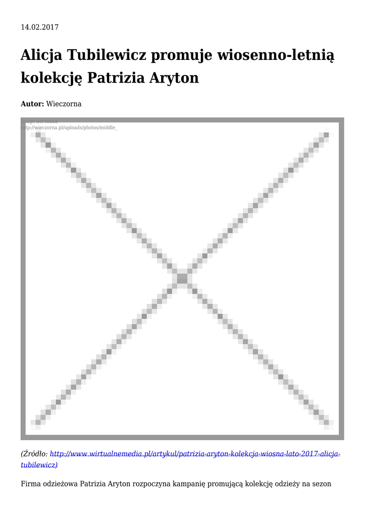 14.02.2017 Alicja Tubilewicz promuje wiosenno-letnią kolekcję Patrizia Aryton Autor: Wieczorna Image not found http://wieczorna.pl/uploads/photos/middle_ (Źródło: http://www.wirtualnemedia.pl/artykul/patrizia-aryton-kolekcja-wiosna-lato-2017-alicjatubilewicz) Firma odzieżowa Patrizia Aryton rozpoczyna kampanię promującą kolekcję odzieży na sezon wiosna-lato 2017. jej twarzą została robiąca międzynarodową karierę topmodelka Alicja Tubilewicz.