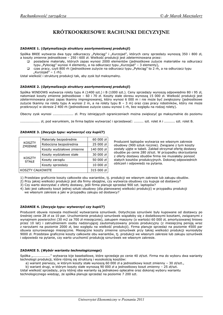 Rachunkowość zarządcza © dr Marek Masztalerz KRÓTKOOKRESOWE RACHUNKI DECYZYJNE ZADANIE 1. (Optymalizacja struktury asortymentowej produkcji) Spółka BREE wytwarza dwa typy odkurzaczy „Pyłociąg” i „Kurzojad”, których ceny sprzedaŜy wynoszą 350 i 800 zł, a koszty zmienne jednostkowe – 250 i 600 zł. Wielkość produkcji jest zdeterminowana przez: posiadane materiały, których zapas wynosi 2000 elementów (jednostkowe zuŜycie materiałów na odkurzacz typu „Pyłociąg” wynosi 4 elementy, a na odkurzacz typu „Kurzojad” – 3 elementy), czas pracy, czyli 800 rh (jednostkowe zuŜycie na odkurzacz typu „Pyłociąg” to 2 rh, a na odkurzacz typu „Kurzojad” – 1 rh). Ustal wielkość i strukturę produkcji tak, aby zysk był maksymalny. ZADANIE 2. (Optymalizacja struktury asortymentowej produkcji) Spółka WINDOWS wytwarza rolety typu A (1400 szt.) i B (1000 szt.). Ceny sprzedaŜy wynoszą odpowiednio 80 i 95 zł, natomiast koszty zmienne jednostkowe – 60 i 70 zł. Koszty stałe okresu wynoszą 15 000 zł. Wielkość produkcji jest zdeterminowana przez zapas tkaniny impregnowanej, który wynosi 6 000 m i nie moŜe być zwiększony (jednostkowe zuŜycie tkaniny na rolety typu A wynosi 2 m, a na rolety typu B – 3 m) oraz czas pracy robotników, który nie moŜe przekroczyć w okresie 2 400 rh (jednostkowe zuŜycie czasu wynosi 1 rh, bez względu na rodzaj rolety). Obecny zysk wynosi ................... zł. Przy istniejących ograniczeniach moŜna zwiększyć go maksymalnie do poziomu .................. zł, pod warunkiem, Ŝe firma będzie wytwarzać i sprzedawać: ......... szt. rolet A i .......... szt. rolet B. ZADANIE 3. (Decyzja typu: wytworzyć czy kupić?) KOSZTY ZMIENNE Materiały bezpośrednie 60 000 zł Robocizna bezpośrednia 25 000 zł Koszty wydziałowe zmienne KOSZTY STAŁE Koszty wydziałowe stałe 30 000 zł Koszty zarządu 50 000 zł Koszty sprzedaŜy KOSZTY CAŁKOWITE 1) 2) 3) 4) 140 000 zł 10 000 zł Producent laptopów wytwarza we własnym zakresie obudowy (900 sztuk rocznie). Związane z tym koszty zostały ujęte w tabeli. Zakład otrzymał ofertę dostawy obudów po cenie 280 zł/szt. W przypadku skorzystania z oferty dostawy obudów firma nie musiałaby ponosić stałych kosztów produkcyjnych. Dokonaj odpowiednich obliczeń i odpowiedz na pytania. 315 000 zł Przedstaw graficznie koszty całkowite obu wariantów, tj. produkcji we własnym zakresie lub zakupu obudów. Przy jakiej wielkości produkcji jest dla firmy obojętne, czy wytwarza obudowy czy kupuje od dostawcy? Czy warto skorzystać z oferty dostawy, jeśli firma planuje sprzedaŜ 900 szt. laptopów? Jaki jest całkowity koszt jednej sztuki obudowy (dla planowanej wielkości produkcji) w przypadku produkcji we własnym zakresie a jaki w przypadku zakupu od dostawcy? ZADANIE 4. (Decyzja typu: wytworzyć czy kupić?) Producent obuwia rozwaŜa moŜliwość wytwarzania sznurówek. Dotychczas sznurówki były kupowane od dostawcy po średniej cenie 28 zł za 10 par. Uruchomienie produkcji sznurówek wiązałoby się z dodatkowymi kosztami, związanymi z wynajmem powierzchni (30 m2 za 700 zł miesięcznie), zakupem maszyny (o wartości 60 000 zł, amortyzowanej liniowo przez 10 lat) i zatrudnieniem osoby nadzorującej zautomatyzowany proces produkcyjny (z miesięczną pensją wraz z narzutami na poziomie 2000 zł, bez względu na wielkość produkcji). Firma planuje sprzedaŜ na poziomie 4500 par obuwia sznurowanego miesięcznie. Miesięczne koszty zmienne sznurówek przy takiej wielkości produkcji wyniosłyby 9000 zł. Przedstaw graficznie koszty całkowite obu wariantów, tj. produkcji we własnym zakresie lub zakupu sznurówek i odpowiedz na pytanie, czy warto uruchomić produkcję sznurówek we własnym zakresie. ZADANIE 5. (Wybór wariantu technologicznego) Spółka „................” wytwarza kije baseballowe, które sprzedaje po cenie 40 zł/szt. Firma ma do wyboru dwa warianty technologii produkcji, które róŜnią się strukturą i wysokością kosztów: a) wariant pierwszy, w którym koszty stałe wynoszą 60 000 zł a jednostkowy koszt zmienny – 30 zł/szt., b) wariant drugi, w którym koszty stałe wynoszą 90 000 zł a jednostkowy koszt zmienny – 25 zł/szt. Ustal wielkość sprzedaŜy, przy której oba warianty są jednakowo opłacalne oraz dokonaj wyboru wariantu technologicznego wiedząc, Ŝe spółka planuje sprzedaŜ na poziomie 7 200 szt. Uniwersytet Ekonomiczny w Poznaniu 2011
