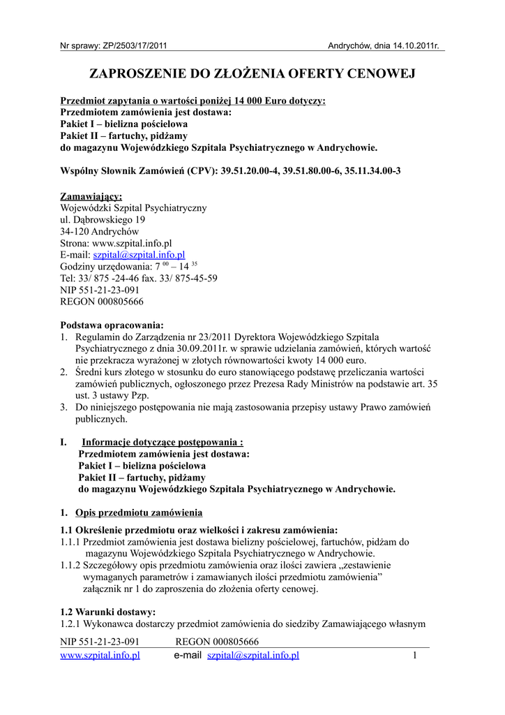 Nr sprawy: ZP/2503/17/2011 Andrychów, dnia 14.10.2011r. ZAPROSZENIE DO ZŁOŻENIA OFERTY CENOWEJ Przedmiot zapytania o wartości poniżej 14 000 Euro dotyczy: Przedmiotem zamówienia jest dostawa: Pakiet I – bielizna pościelowa Pakiet II – fartuchy, pidżamy do magazynu Wojewódzkiego Szpitala Psychiatrycznego w Andrychowie. Wspólny Słownik Zamówień (CPV): 39.51.20.00-4, 39.51.80.00-6, 35.11.34.00-3 Zamawiający: Wojewódzki Szpital Psychiatryczny ul. Dąbrowskiego 19 34-120 Andrychów Strona: www.szpital.info.pl E-mail: [email protected] Godziny urzędowania: 7 00 – 14 35 Tel: 33/ 875 -24-46 fax. 33/ 875-45-59 NIP 551-21-23-091 REGON 000805666 Podstawa opracowania: 1. Regulamin do Zarządzenia nr 23/2011 Dyrektora Wojewódzkiego Szpitala Psychiatrycznego z dnia 30.09.2011r. w sprawie udzielania zamówień, których wartość nie przekracza wyrażonej w złotych równowartości kwoty 14 000 euro. 2. Średni kurs złotego w stosunku do euro stanowiącego podstawę przeliczania wartości zamówień publicznych, ogłoszonego przez Prezesa Rady Ministrów na podstawie art. 35 ust. 3 ustawy Pzp. 3. Do niniejszego postępowania nie mają zastosowania przepisy ustawy Prawo zamówień publicznych. I. Informacje dotyczące postępowania : Przedmiotem zamówienia jest dostawa: Pakiet I – bielizna pościelowa Pakiet II – fartuchy, pidżamy do magazynu Wojewódzkiego Szpitala Psychiatrycznego w Andrychowie. 1. Opis przedmiotu zamówienia 1.1 Określenie przedmiotu oraz wielkości i zakresu zamówienia: 1.1.1 Przedmiot zamówienia jest dostawa bielizny pościelowej, fartuchów, pidżam do magazynu Wojewódzkiego Szpitala Psychiatrycznego w Andrychowie. 1.1.2 Szczegółowy opis przedmiotu zamówienia oraz ilości zawiera „zestawienie wymaganych parametrów i zamawianych ilości przedmiotu zamówienia” załącznik nr 1 do zaproszenia do złożenia oferty cenowej. 1.2 Warunki dostawy: 1.2.1 Wykonawca dostarczy przedmiot zamówienia do siedziby Zamawiającego własnym NIP 551-21-23-091 www.szpital.info.pl REGON 000805666 e-mail [email protected] 1 Nr sprawy: ZP/2503/17/2011 Andrychów, dnia 14.10.2011r. transportem na swój koszt w dniu roboczym (od poniedziałku do piątku) w godzinach od 700 - 1200 w terminie do 21 dni licząc od daty podpisania umowy. 1.2.2 Ilość i rodzaj dostarczonego asortymentu musi być zgodna z przedmiotem zamówienia. 1.3.3 Wykonawca udzieli okresu gwarancji na dostarczony przedmiot zamówienia przez okres nie krótszy niż 24 miesiące licząc od dnia dostawy. 1.3 Cena oferty: 1.3.1 Cena oferty ma zawierać koszt: dostawy przedmiotu zamówienia, oznakowania przedmiotu zamówienia, pozostałe koszty związane z realizacją zamówienia, podatek VAT. 2. Termin wykonania zamówienia 1. Wymagany termin realizacji zamówienia – do 21 dni licząc od dnia podpisania umowy. 2. Miejsce realizacji zamówienia: magazyn Wojewódzkiego Szpitala Psychiatrycznego w Andrychowie ul. Dąbrowskiego 19, pok. – A-114. 3. Oferty częściowe. Zamawiający nie dopuszcza składania oferty częściowej w obrębie danego pakietu. II. 1. 2. 3. 4. 5. Informacje o oświadczeniach i dokumentach, jakie mają dostarczyć wykonawcy: Zestawienie wymaganych parametrów i zamawianych ilości przedmiotu zamówienia załącznik nr 1 Prawidłowo wypełniony i podpisany Formularz oferty – załącznik nr 2 Formularz cenowy /Pakiet I, Pakiet II/ - załącznik nr 2a Oświadczenie - załącznik nr 3 Zaakceptowany projekt umowy - załącznik nr 4 III. Pracownicy Zamawiającego uprawnieni do bezpośredniego kontaktowania się z wykonawcami : w sprawach przedmiotu zamówienia: Rys Beata tel. 33/875-24-46 wew. 207 Olszowska Krzysztofa tel. 33/875-24-46 wew. 235 w sprawach postępowania: Bury Marzena tel. 33/875 75 42 Mamica Zbigniew tel. 33/875 75 42 IV. Sposób przygotowania oferty oraz informacje dotyczące warunków składania ofert: 1. Oferta powinna być sporządzona w języku polskim; wskazane jest by była sporządzona na maszynie, komputerze lub nieścieralnym atramentem (Zamawiający nie wyraża zgody na złożenie oferty w postaci elektronicznej). Oferta musi być podpisana przez osobę upoważnioną do reprezentowania firmy w zakresie jej praw majątkowych zgodnie z wpisem do właściwego rejestru lub zaświadczenia o wpisie do ewidencji lub podpisana NIP 551-21-23-091 www.szpital.info.pl REGON 000805666 e-mail [email protected] 2 Nr sprawy: ZP/2503/17/2011 Andrychów, dnia 14.10.2011r. przez osobę umocowaną lub osobę uprawnioną, przy czym aktualne pełnomocnictwo musi być załączone do oferty. W przypadku spółki cywilnej konieczne jest dołączenie umowy spółki. 2. Każdy Wykonawca może złożyć tylko jedną ofertę, 3. Ofertę należy złożyć osobiście lub pocztą (decyduje data otrzymania oferty przez Zamawiającego) w zaklejonych kopertach w Wojewódzkim Szpitalu Psychiatrycznym, ul. Dąbrowskiego 19, 34-120 Andrychów II piętro Administracja pok. A-306 Sekretariat w terminie do dnia 24.10.2011r. do godz. 800. Koperta winna być zaadresowana na adres Zamawiającego i posiadać oznaczenie: „Oferta dla Wojewódzkiego Szpitala Psychiatrycznego w Andrychowie na dostawę: Pakiet I – bielizna pościelowa Pakiet II – fartuchy, pidżamy Postępowanie znak: ZP/2503/17/2011 Nie otwierać przed 24.10.2011r. godz. 830. 4. By umożliwić zwrot nie otwartej koperty w przypadku dostarczenia oferty po terminie wskazane jest, aby na kopercie podać nazwę i adres Wykonawcy. V. Sposób obliczenia ceny Ceną oferty jest wartość brutto (z podatkiem VAT) tzn. suma wartości wynikających z pomnożenia cen jednostkowych przez ilości oraz powiększonych o wielkość podatku VAT. Sposób obliczenia wartości oferty przedstawia się następująco: ilość x cena netto = wartość netto wartość netto + stawka podatku VAT = wartość brutto. Cena podana w ofercie musi zawierać ostateczną, sumaryczną cenę obejmującą wszystkie pozycje zamówienia /formularz cenowy Pakiet I, Pakiet