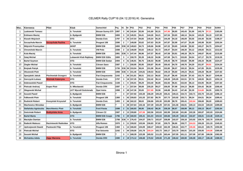 CELMER Rally CUP'16 (04.12.2016) Kl. Generalna Msc. Kierowca Pilot Klub Samochód Poj. Kl. Nr PS1 PS2 PS3 PS4 PS5 PS6 PS7 PS8 PS9 PS10 SUMA 1 Laskowski Tomasz A. Toruński Nissan Sunny GTI 1997 3 45 142,64 92,06 141,80 92,31 147,96 90,85 143,43 91,06 143,74 97,21 1183,06 2 Erdmann Maciej A. Bydgoski BMW E36 1800 3 15 145,91 94,41 144,26 94,21 147,54 93,65 146,14 94,34 143,20 94,19 1197,85 3 Klusek Wojciech ATG Honda Civic 1797 3 43 147,54 94,66 145,54 95,35 144,49 94,18 146,09 93,56 144,40 92,56 1198,37 4 Szczęchuła Marcin A. Toruński Peugeot 106 1590 2 7 149,08 93,62 147,63 93,30 147,87 92,98 147,07 91,68 145,98 92,83 1202,04 5 Wójcicki Przemysław AKKP BMW E36 1800 E36 10 149,63 94,73 145,66 94,98 147,22 93,65 145,96 92,82 145,27 94,75 1204,67 6 Chromiński Marcin A. Toruński VW Polo 1598 12 149,09 93,02 149,12 92,72 149,47 93,04 148,30 93,12 149,83 94,31 1212,02 7 Kula Maciej A. Toruński BMW E36 1991 E36 5 147,44 96,96 147,57 96,42 147,58 93,91 148,18 95,74 146,67 95,42 1215,89 8 Zataj Michał Lubawski Klub Rajdowy BMW E30 318is 1800 3 4 150,79 95,39 146,32 94,96 147,69 94,71 153,00 94,54 147,17 93,78 1218,35 9 Bartel Szymon ATG BMW E36 Sedan 2494 4 41 146,91 96,76 146,53 96,98 149,45 98,79 150,66 95,99 146,34 96,06 1224,47 10 Ziegler Michał A. Toruński Citroen Saxo 1587 2 1 150,95 95,95 150,87 95,40 150,42 94,78 149,76 94,29 151,97 99,91 1234,30 11 Brejnak Patryk A. Toruński BMW E36 1736 E36 50 153,04 96,04 151,98 96,44 152,80 96,07 150,32 95,54 147,85 95,91 1235,99 12 Olszewski Piotr A. Toruński BMW E36 1998 E36 6 151,46 104,81 149,53 96,62 149,19 95,60 149,23 95,61 149,28 96,49 1237,82 13 Specjalski Jakub Piechowiak Grzegorz A. Toruński Fiat Cinquecento 1242 1 40 151,81 98,51 152,13 96,02 151,87 96,49 152,08 97,43 152,75 96,57 1245,66 14 Gorczycki Łukasz Woźniak Katarzyna ATG Honda Civic 1797 3 18 157,35 95,51 152,42 96,14 149,28 105,05 152,51 97,76 149,93 96,23 1252,18 15 Dobrowolski Paweł ATG Fiat Cinquecento 1108 1 8 155,91 99,29 153,40 96,85 152,92 96,81 152,94 96,14 154,95 98,39 1257,60 16 Pietrzak Andrzej A. Włocławski Honda CRX 1597 2 2 157,04 99,08 155,25 99,27 156,05 97,98 154,13 96,85 154,42 98,38 1268,45 17 Głogowski Michał LKT Wyczół Gościeradz Opel Astra 1998 3 49 147,36 93,65 157,88 93,56 146,88 94,43 147,46 92,39 214,80 94,35 1282,76 18 Suszek Paweł A. Bydgoski BMW E36 ? 3 47 157,92 103,30 156,29 100,20 155,41 100,21 154,72 102,71 153,70 101,64 1286,10 19 Fałkowski Piotr A. Toruński Peugeot 106 1360 1 42 159,83 101,53 157,82 99,78 157,73 103,92 155,71 99,24 154,51 99,34 1289,41 20 Rudnicki Robert A. Toruński Honda Civic 1493 2 46 162,22 98,63 156,86 105,30 153,99 98,78 155,41 102,64 156,60 99,20 1289,63 21 Wachowicz Mirosław A. Bydgoski BMW E36 ? 3 48 157,64 102,16 157,39 102,29 157,01 101,56 156,91 100,14 154,54 100,04 1289,68 22 Stefańska Agnieszka Marchlewicz Piotr A. Toruński Ford Fiesta 1598 2 31 160,93 99,95 158,42 98,26 159,39 98,97 158,99 99,13 159,13 99,47 1292,64 23 Gościniak Robert Budzyńska Anna A. Bydgoski Citroen C2 1587 2 13 159,80 107,06 162,56 102,63 162,99 102,60 161,86 102,26 160,87 102,03 1324,66 24 Bartel Marta ATG BMW E36 Coupe 1796 3 20 160,93 105,41 161,03 103,54 160,66 105,29 160,16 102,87 158,81 110,46 1329,16 25 Maciejko Damian A. Toruński BMW E36 1798 E36 9 176,43 104,57 159,71 102,87 158,89 102,57 159,18 103,92 159,78 102,70 1330,62 26 Radecki Mateusz Raciniewski Radosław ATG Alfa Romeo 1970 3 11 159,02 103,94 156,83 97,82 159,75 96,66 159,77 104,53 156,28 151,33 1345,93 27 Jędrzejewski Dawid Pastewski Filip A. Toruński Peugeot 106 1360 1 14 166,60 104,09 168,47 108,02 162,39 106,01 163,77 106,66 164,22 100,75 1350,98 28 Pietrzak Michał ATG Fiat Seicento 1242 1 44 159,06 101,79 169,24 102,73 160,17 103,70 166,91 101,05 159,95 144,86 1369,46 29 Suszek Michał A. Bydgoski BMW E36 ? 3 3 168,39 123,38 165,52 111,25 163,44 107,55 161,11 107,08 167,80 106,56 1382,08 30 Michalska Adela A. Toruński Honda CRX 1590 2 19 173,12 106,68 170,52 109,08 171,28 106,62 169,90 106,08 169,17 106,48 1388,93 Szczęchuła Paulina Koper Piotr Koszyński Krzysztof Zając Marzena 2 Strona 1