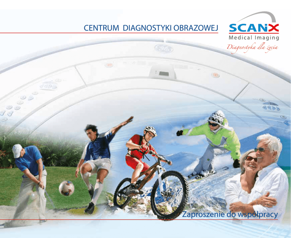 CENTRUM DIAGNOSTYKI OBRAZOWEJ Diagnostyka dla życia Zaproszenie do współpracy CENTRUM DIAGNOSTYKI OBRAZOWEJ Szanowni Państwo SCANX Centrum Diagnostyki Obrazowej w Katowicach pod kierownictwem dr n. med. Marka Konopki zaprasza do współpracy w segmencie Partnera Komercyjnego. Nasza firma powstała w dniu 28 czerwca 2010 r. SCANX Centrum Diagnostyki Obrazowej świadczy usługi medyczne w następujących obszarach: • Tomografia Komputerowa • Rezonans Magnetyczny • USG • RTG • Mammografia Naszą Misją jest: „Diagnostyka dla życia”. Wypływa z niej wielkie zobowiązanie względem każdego pacjenta: chcemy, aby wykonywane przez nas badania diagnostyczne przełożyły się na właściwe rozpoznanie i wybór optymalnego procesu leczniczego. Dążymy do ciągłego podnoszenia jakości wykonywanych świadczeń. Wysoko wykwalifikowany personel oraz posiadana najnowocześniejsza aparatura diagnostyczna pozwalają na wykonywanie usług najwyższej jakości. Wychodząc naprzeciw oczekiwaniom Pacjentów, SCANX Centrum Diagnostyki Obrazowej dokłada wszelkich starań, by oprócz wysokiej jakości usług zagwarantować ich szybką realizację. Terminy badań do 3 dni, analiza i opis badania, w przeważającej części są gotowe do odbioru w ciągu od kilku do 24 godzin po wykonaniu badania. Pacjent otrzymuje wynik w formie pisemnego opisu badania oraz dodatkowo w postaci obrazów nagranych na płycie CD. SCANX Centrum Diagnostyki Obrazowej zapewnia również swoim Pacjentom wsparcie merytoryczne, polegające na konsultacjach medycznych wykonywanych badań. Serdecznie zapraszamy do współpracy Oddajemy w ręce Waszych Pacjentów Centra Diagnostyczne w następujących lokalizacjach: Pracownie: Tomograf ii Komputerowej, Rezonansu Magnetycznego, USG, RTG, Mammograf ii w Sosnowcu Pl. Medyków 1, 41-200 Sosnowiec (w Wojewódzkim Szpitalu Specjalistycznym nr. 5 im. Św. Barbary), wyposażone w sprzęt: Rezonans Magnetyczny SIGNA HDxT 1.5 T Tomograf Komputerowy GE Optima CT660 (128 warst) Tomograf Komputerowy Siemens SOMATOM EMOTION 16 Aparaty Ultrasonograficzne: ALOKA ProSound Alpha 6, GE Logiqu S8 Aparaty Rentgenowskie: AJAT ART Plus, Siemens Axiom Iconos R100, Fuji PEDS 600, Siemens MULITX Compact, Siemens Siremobil Compakt L Aparat Mammograficzny Senogrphe Essential GE. Pracownia Tomograf ii Komputerowej w Mysłowicach ul. Bytomska 41, 41-400 Mysłowice (w Szpitalu nr. 2 im. Tadeusza Boczonia), wyposażona w sprzęt: Tomograf Komputerowy – GE BRIGHTSPEED 16; Pracownia Tomograf ii Komputerowej w Bielsku-Białej ul. Wyspiańskiego 21, 43-300 Bielsko-Biała (w Beskidzkim Centrum Onkologii Szpitalu Miejskim im. Jana Pawła II), wyposażona w sprzęt: Tomograf Komputerowy – GE BRIGHTSPEED 16 Pracownia Rezonansu Magnetycznego w Cieszynie ul. Bielska 4, 43-400 Cieszyn (w Szpitalu Śląskim), wyposażona w sprzęt: Rezonans Magnetyczny – 1,5 T HDxt Optima; INFORMACJA TELEFONICZNA 801 88 88 11 32 661 00 90 Pracownia Rezonansu Magnetycznego w Częstochowie ul. Wały Gen. Józefa Dwernickiego 43/45, 42-202 Częstochowa (w Centrum Medycznym Klara), wyposażona w sprzęt: Rezonans Magnetyczny – Signa HDxt 1.5 T; Pracownia Rezonansu Magnetycznego w Katowicach ul. Medyków 16, 40-752 Katowice (w SPSK nr 6 Górnośląkie Centrum Zdrowia Dziecka im. Jana Pawła II), wyposażona w sprzęt: Rezonans Magnetyczny – Optima 450W- GEM 1.5 T; Diagnostyka obrazowa staje się podstawowym narzędziem zarówno w profilaktyce, jak i w leczeniu wielu chorób i dolegliwości. Podstawowymi badaniami z zakresu diagnostyki obrazowej są dzisiaj badania tomografii komputerowej (TK) i rezonansu magnetycznego (MR). Metody te pozwalają na wczesne zdiagnozowanie, zaplanowanie i skuteczne leczenie wielu schorzeń. Obrazy uzyskane w trakcie tych badań dostarczają niezwykle precyzyjnych informacji o najmniejszych zmianach chorobowych zachodzących w organizmie człowieka. PRACOWNIA TK PRACOWNIA MR PRACOWNIA USG PRACOWNIA RTG Wykonywane badania TK: Wykonywane badania MR: Wykonywane badania USG: Wykonywane badania RTG: 1. Tomograf ia głowy: TK mózgowia TK oczodołów TK zatok obocznych nosa TK twarzoczaszki TK piramid kości skroniowych 2. Tomograf ia innej okolicy anatomicznej: TK szyi (nosogardziel, krtań, gardło) TK klatki piersiowej i śródpiersia TK jamy brzusznej TK miednicy małej TK kończyn (kości i stawy) TK kręgosłupa (odcinek C, Th, L-S) 3. Angiograf ia TK 4. Kolonograf ia TK 5. Dental TK 6.TK badanie kardiologiczne 7. Densytometria TK 8. Enterokliza (enterografia) TK 9. Toposkan TK 1. Rezonans głowy: MR mózgowia MR przysadki MR oczodołów MR zatok obocznych nosa MR twarzoczaszki MR piramid kości skroniowych 2. Rezonans innej okolicy anatomicznej: MR szyi (nosogardziel, krtań, gardło) MR serca MR jamy brzusznej MR miednicy małej MR kończyn (kości i stawy) MR kręgosłupa (odcinek C, Th, L-S) MR tkanek miękkich 3. Cholangiograf ia MR 4. Angiograf ia MR 5. Artrograf ia MR 6. MR gruczołu krokowego 7. MR serca 8. Spektroskopia MR 9. Enterokliza (enterografia) MR 10. Mammografia MR 11. Przepływy MR – badanie czynnościowe 12. Perfuzja MR – badanie dynamiczne głowy 13. Wielofazowe badanie MR 14. Badania nietypowe MR 1. Jamy brzusznej i miednicy mniejszej 2.Układu moczowego z oceną zalegania po mikcji 3.Moszny (jąder i najądrzy) 4.Jam opłucnowych 5.Szyi 6.Tarczycy 7.Piersi wraz z dołami pachowymi 8.Dołów pachowych 9.Dołów podkolanowych 10.Tkanek miękkich wskazanej okolicy 11.Doppler aorty brzusznej 12.Doppler tętnic szyjnych i kręgowych 13.Doppler układu tętniczego kończyn górnych 14.Doppler układu tętniczego kończyn dolnych 15.Doppler żył kończyn dolnych 1. Rutynowe zdjęcie rtg klatki piersiowej 2. Zdjęcie rtg kręgosłupa szyjnego 3. Zdjęcie rtg kręgosłupa piersiowego 4. Zdjęcie rtg kręgosłupa lędźwiowego 5. Zdjęcie rtg żeber (mostka) obojczyka 6. Zdjęcie rtg kości barku i ramienia 7. Zdjęcie rtg kości łokcia / przedramienia 8. Zdjęcie rtg nadga