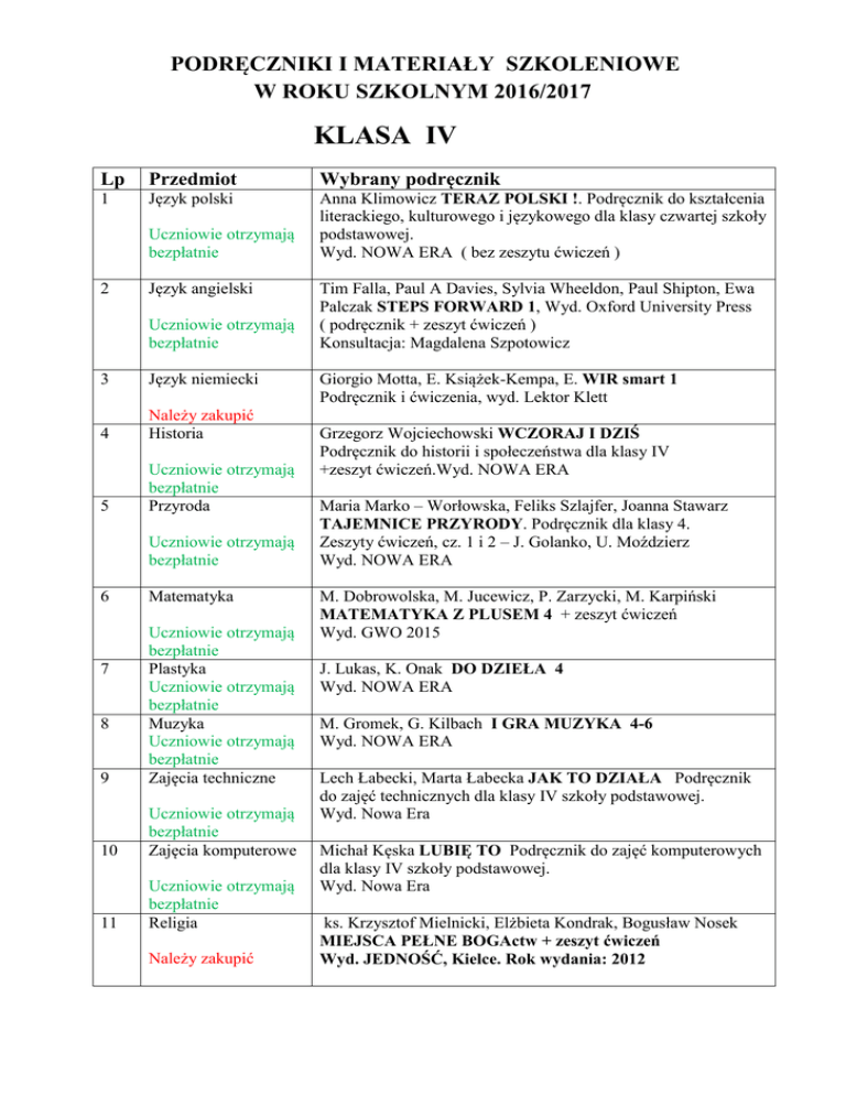 PODRĘCZNIKI I MATERIAŁY SZKOLENIOWE W ROKU SZKOLNYM 2016/2017 KLASA IV Lp Przedmiot Wybrany podręcznik 1 Język polski Anna Klimowicz TERAZ POLSKI !. Podręcznik do kształcenia literackiego, kulturowego i językowego dla klasy czwartej szkoły podstawowej. Wyd. NOWA ERA ( bez zeszytu ćwiczeń ) Uczniowie otrzymają bezpłatnie 2 Język angielski Uczniowie otrzymają bezpłatnie 3 Język niemiecki 4 Należy zakupić Historia 5 Uczniowie otrzymają bezpłatnie Przyroda Uczniowie otrzymają bezpłatnie 6 Matematyka 9 Uczniowie otrzymają bezpłatnie Plastyka Uczniowie otrzymają bezpłatnie Muzyka Uczniowie otrzymają bezpłatnie Zajęcia techniczne 10 Uczniowie otrzymają bezpłatnie Zajęcia komputerowe 11 Uczniowie otrzymają bezpłatnie Religia 7 8 Należy zakupić Tim Falla, Paul A Davies, Sylvia Wheeldon, Paul Shipton, Ewa Palczak STEPS FORWARD 1, Wyd. Oxford University Press ( podręcznik + zeszyt ćwiczeń ) Konsultacja: Magdalena Szpotowicz Giorgio Motta, E. Książek-Kempa, E. WIR smart 1 Podręcznik i ćwiczenia, wyd. Lektor Klett Grzegorz Wojciechowski WCZORAJ I DZIŚ Podręcznik do historii i społeczeństwa dla klasy IV +zeszyt ćwiczeń.Wyd. NOWA ERA Maria Marko – Worłowska, Feliks Szlajfer, Joanna Stawarz TAJEMNICE PRZYRODY. Podręcznik dla klasy 4. Zeszyty ćwiczeń, cz. 1 i 2 – J. Golanko, U. Moździerz Wyd. NOWA ERA M. Dobrowolska, M. Jucewicz, P. Zarzycki, M. Karpiński MATEMATYKA Z PLUSEM 4 + zeszyt ćwiczeń Wyd. GWO 2015 J. Lukas, K. Onak DO DZIEŁA 4 Wyd. NOWA ERA M. Gromek, G. Kilbach I GRA MUZYKA 4-6 Wyd. NOWA ERA Lech Łabecki, Marta Łabecka JAK TO DZIAŁA Podręcznik do zajęć technicznych dla klasy IV szkoły podstawowej. Wyd. Nowa Era Michał Kęska LUBIĘ TO Podręcznik do zajęć komputerowych dla klasy IV szkoły podstawowej. Wyd. Nowa Era ks. Krzysztof Mielnicki, Elżbieta Kondrak, Bogusław Nosek MIEJSCA PEŁNE BOGActw + zeszyt ćwiczeń Wyd. JEDNOŚĆ, Kielce. Rok wydania: 2012 KLASA V Lp Przedmiot Wybrany podręcznik 1 Język polski Anna Klimowicz TERAZ POLSKI !. Podręcznik do kształcenia literackiego, kulturowego i językowego dla klasy piątej szkoły podstawowej. Wyd. NOWA ERA ( bez zeszytu ćwiczeń ) Uczniowie otrzymają bezpłatnie 2 Język angielski Uczniowie otrzymają bezpłatnie 3 Język niemiecki 4 Należy zakupić Historia 5 Uczniowie otrzymają bezpłatnie Przyroda Uczniowie otrzymają bezpłatnie 6 Matematyka 9 Uczniowie otrzymają bezpłatnie Plastyka Uczniowie otrzymają bezpłatnie Muzyka Uczniowie otrzymają bezpłatnie Zajęcia techniczne 10 Uczniowie otrzymają bezpłatnie Zajęcia komputerowe 11 Uczniowie otrzymają bezpłatnie Religia 7 8 Należy zakupić Tim Falla, Paul A Davies, Sylvia Wheeldon, Paul Shipton, Ewa Palczak STEPS FORWARD 2, Wyd. Oxford University Press ( podręcznik + zeszyt ćwiczeń ) Konsultacja: Magdalena Szpotowicz Giorgio Motta, E. Książek-Kempa, E. WIR smart 2 Podręcznik i ćwiczenia, wyd. Lektor Klett Grzegorz Wojciechowski WCZORAJ I DZIŚ Podręcznik do historii i społeczeństwa dla klasy V +zeszyt ćwiczeń.Wyd. NOWA ERA Maria Marko – Worłowska, Feliks Szlajfer, Joanna Stawarz TAJEMNICE PRZYRODY. Podręcznik dla klasy 5. Zeszyty ćwiczeń, cz. 1 i 2 – J. Golanko, U. Moździerz Wyd. NOWA ERA M. Dobrowolska, M. Jucewicz, P. Zarzycki, M. Karpiński MATEMATYKA Z PLUSEM 5 + zeszyt ćwiczeń Wyd. GWO 2015 J. Lukas, K. Onak DO DZIEŁA 5 Wyd. NOWA ERA M. Gromek, G. Kilbach I GRA MUZYKA 4-6 Wyd. NOWA ERA Lech Łabecki, Marta Łabecka JAK TO DZIAŁA Podręcznik do zajęć technicznych dla klasy V szkoły podstawowej. Wyd. Nowa Era Michał Kęska LUBIĘ TO Podręcznik do zajęć komputerowych dla klasy V szkoły podstawowej. Wyd. Nowa Era Ks. Krzysztof Mielnicki, Elżbieta Kondrak, Ewelina Parszewska SPOTKANIA uBOGAcające + zeszyt ćwiczeń Wyd. Jedność Kielce. Rok wydania: 2013 KLASA VI Lp Przedmiot Wybrany podręcznik 1 Język polski 2 Język angielski 3 Język niemiecki 4 Historia 5 Przyroda 6 Matematyka 7 Plastyka 8 Muzyka 9 Zajęcia techniczne 10 Zajęcia komputerowe 11 Religia 12 Wychowanie do życia w rodzinie Anna Klimowicz TERAZ POLSKI !. Podręcznik do kształcenia literackiego, kulturowego i językowego dla klasy szóstej szkoły podstawowej. Wyd. NOWA ERA Erika Stiles, Sandy Zervas TODAY 3, Wyd. Pearson ( podręcznik + zeszyt ćwiczeń ) Giorgio Motta,WIRneu3 Podręcznik i ćwiczenia, wyd. Lektor Klett Grzegorz Wojciechowski WCZORAJ I DZIŚ Podręcznik do historii i społeczeństwa dla klasy VI +zeszyt ćwiczeń. Wyd. NOWA ERA Joanna Stawarz, Hanna Kowalczyk, F. Szlajfer TAJEMNICE PRZYRODY 6 Wyd. NOWA ERA 2014 Zeszyty ćwiczeń, cz. I i II – D.Marszał, M. Mochnacz, J.Stawarz, M. Marko-Worłowska, M. Mańska Nowy Atlas. Przyroda „Świat wokół nas” M. Braun, A. Mańkowska, M. Paszyńska MATEMATYKA Z KLUCZEM 6 – jedna część podręcznika. MATEMATYKA Z KLUCZEM – zeszyt ćwiczeń, klasa 6, część 1 i 2 – z napisem: wydania zmienione zgodne z nowym sprawdzianem. W-wa 2013 Wyd. NOWA ERA J. Lukas, K. Onak DO DZIEŁA 4-6 Wyd. NOWA ERA M. Gromek, G. Kilbach I GRA MUZYKA 4-6 Wyd. NOWA ERA Urszula Białka, Jerzy Chrabąszcz ZAJĘCIA TECHNICZNE. CZĘŚĆ KOMUNIKACYJNA. Podręcznik do szkoły podstawowej. Urszula Białka CZĘŚĆ TECHNICZNA. Podręcznik dla klas 4-6 szkoły podstawowej. Wyd. OPERON Sp. Z o. o. Grażyna Hermanowska, Wojciech Hermanowski ZAJĘCIA KOMPUTEROWE. Podręcznik dla klas 4-6 szkoły podstawowej. Wyd. OPERON Sp. z o. o. Krzysztof Mielnicki, Elżbieta Kondrak, Ewelina Parszewska „Tajemnice BOGAtego życia” + zeszyt ćwiczeń Wyd. Jedność, Kielce Rok wydania 2014 Podręcznik i zeszyt ćwiczeń nie jest wymagany. WYKAZ PODRĘCZNIKÓW OBOWIĄZUJĄCYCH W ROKU SZKOLNYM 2016/2017 KLASA I - III Lp Przedmiot Klasa Wybrany podręcznik KLASA I 1 2 3 Edukacja wczesnoszkolna Uczniowie otrzymają bezpłatnie Język angielski Uczniowie otrzymają bezpłatnie I Religia Należy zakupić I I Maria Lorek, Lidia Wollman NASZ ELEMENTARZ. Wyd. MEN Rok dopuszczenia 2014
