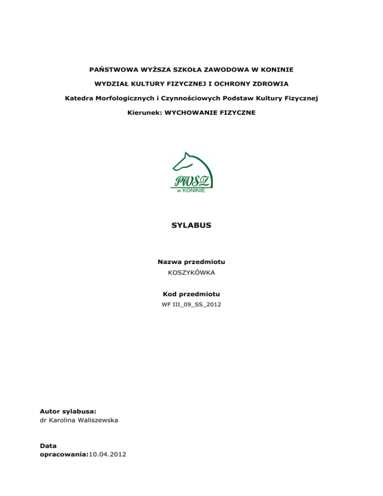 PAŃSTWOWA WYŻSZA SZKOŁA ZAWODOWA W KONINIE WYDZIAŁ KULTURY FIZYCZNEJ I OCHRONY ZDROWIA Katedra Morfologicznych i Czynnościowych Podstaw Kultury Fizycznej Kierunek: WYCHOWANIE FIZYCZNE SYLABUS Nazwa przedmiotu KOSZYKÓWKA Kod przedmiotu WF III_09_SS_2012 Autor sylabusa: dr Karolina Waliszewska Data opracowania:10.04.2012 1. Podstawowe informacje Poziom kształcenia studia pierwszego stopnia Profil kształcenia praktyczny Forma studiów Stacjonarne (SS) Rok studiów II Semestr IV Moduł kształcenia Przygotowanie w zakresie dydaktycznym, Forma zajęć Wykłady i ćwiczenia Wymiar godzinowy Wykłady – 8 godzin, ćwiczenia - 30godzin Liczba punktów ECTS 3 Język wykładowy polski Forma zaliczenia Zaliczenie z oceną, egzamin Rok akademicki 2013/2014 2. Cele kształcenia C01 Opanowanie określonego w programie zakresu wiedzy z koszykówki. C02 Opanowanie podstawowych umiejętności z zakresu metodyki nauczania techniki i taktyki, planowania oraz sędziowania z zakresu koszykówki w szkole podstawowej. C03 Kształtowanie pozytywnej postawy studentów promujących zdrowie i aktywność fizyczną w szkole i środowisku lokalnym. 3. Wymagania wstępne Student, który rozpoczyna zajęcia z przedmiotu: • • • Wiedza – posiada podstawowe wiadomości dotyczące koszykówki, Umiejętności – posiada podstawowe umiejętności, Kompetencje społeczne – wykazuje się odpowiedzialnością wynikającą z realizacji zadań. 4. Efekty kształcenia Tabela odniesień przedmiotowych efektów kształcenia do efektów kierunkowych i obszarowych Symbol Efekty kształcenia dla przedmiotu Koszykówka Student, który zaliczył przedmiot: Odniesienie do efektów kształcenia dla kierunku studiów Wychowanie fizyczne Odniesienie do efektów kształcenia w obszarze kształcenia w zakresie nauk medycznych, nauk o zdrowiu oraz nauk o kulturze fizycznej P_W01 Zna systematykę ćwiczeń oraz metodykę nauczania podstawowych umiejętności technicznych i taktycznych w koszykówce, K_W03 K_W17 M_W10 P_U01 Opanował umiejętności techniczne, taktyczne oraz metodyczne związane z nauczaniem i doskonaleniem koszykówki K_U02 K_U18 K_U19 M1_U01 M1_U02 M1_U07 M1_U11 P_U02 Potrafi samodzielnie zaplanować i zorganizować zajęcia rekreacyjne, sportowe oraz je sędziować. K_U03 M1_U01 M1_U02 M1_U09 P_K01 Samodzielnie wykonuje powierzone mu zadania oraz właściwie organizuje pracę własną, jednocześnie K_K01 K_K03 M1_K04 M1_K05 2 potrafi pracować w zespole. P_K02 Potrafi propagować zdrowy styl życia i promocję zdrowia K-K03 K_K11 M1_K02 M1_K07 5. Treści kształcenia WYKŁADY liczba godzin WYK01 Rys historyczny koszykówki na świecie i w Polsce. Charakterystyka gry. 1 WYK02 Przepisy gry. 1 WYK03 Obserwacja meczu koszykówki – przepisy, gestykulacja sędziowska 1 WYK04 Analiza teoretyczna oraz opis techniki wykonania umiejętności technicznych w ataku. 1 WYK05 Analiza teoretyczna oraz opis techniki wykonania umiejętności technicznych w obronie. 1 WYK06 Analiza teoretyczna oraz opis taktyki gry w ataku. 1 WYK07 Analiza teoretyczna oraz opis taktyki gry w obronie. 1 WYK08 Organizacja rozgrywek w koszykówce – systemy rozgrywek i regulaminy, dokumentacja oraz wzory protokołów. 1 Ogółem 8 ĆWICZENIA liczba godzin Podstawowe umiejętności techniki koszykarskiej w ataku bez piłki. Kozłowanie w postawie wysokiej i niskiej. 2 ĆW02 Podania i chwyty piłki w miejscu oraz biegu. Tworzenie linii podania. 2 ĆW03 Rzut jednorącz z miejsca oraz wyskoku, po kozłowaniu i zatrzymaniu na jedno i dwa tempa oraz po chwycie piłki podanej od partnera. 2 ĆW04 Rzut z biegu po kozłowaniu – z prawej i lewej strony kosza. 2 ĆW05 Łączenie podstawowych elementów techniki koszykarskiej w celu przemieszczania się z piłką. Metodyka nauczania szybkiego ataku zorganizowanego – stworzenie i rozegranie przewag, niezorganizowanego – kontrataku oraz ataku pozycyjnego. 2 ĆW06 Fundamenty obrony: postawa obronna, pozycja obronna oraz poruszanie się w obronie. 2 ĆW07 Zastawianie: zawodnika rzucającego, zawodnika bez piłki, połączone ze zbiórką piłki z tablicy. 2 ĆW08 Podstawowe elementy wykorzystywane podczas gry 1x1 w ataku, w kozłowaniu. 2 ĆW09 Metodyka nauczania gry 1x1 w ataku z postawy koszykarskiej. 2 ĆW10 Metodyka nauczania gry 1x1 w ataku bez piłki: samowyzwolenie, ścięcie, obiegnięcie. 2 ĆW11 Metodyka nauczania krycia atakującego z piłką: w postawie koszykarskiej, kozłującego piłkę, atakującego bez piłki: stojącego w miejscu oraz poruszającego się, krycie zawodnika ścinającego na kosz. 2 ĆW12 Metodyka nauczania zasłony od i do piłki oraz obrona przeciwko zasłonom. 2 ĆW13 Metodyka nauczania obrony: „każdy swego”, zespołowej, strefowej. 2 ĆW14 Organizacja i przeprowadzenie turnieju koszykówki. 2 ĆW15 Praktyczne zaliczenie technicznych umiejętności koszykarskich. ĆW01 Ogółem 2 30 6. Metody kształcenia MK01 Wykład z elementami dyskusji MK02 Prezentacja multimedialna MK03 Pokaz z objaśnieniem MK04 Ćwiczenia praktyczne MK05 Przygotowanie pisemne studenta (konspekt, scenariusz imprezy sportowej) 3 7. Metody oceny (ocena formująca, ocena podsumowująca) OF01 Zaliczenie praktyczne umiejętności technicznych. OF02 Pisemne opracowanie regulaminu i przeprowadzenie turnieju koszykówki. OP01 Egzamin pisemny z pytaniami otwartymi. 8. Obciążenie pracą studenta liczba godzin Godziny kontaktowe z nauczycielem 38 Praca indywidualna studenta, w tym: • Analiza treści wykładów i ćwiczeń oraz literatury podstawowej i uzupełniającej • Przygotowanie scenariusza imprezy sportowej i dokumentacji (turnieju koszykówki) • Przygotowanie do ćwiczeń • Sędziowanie • Przygotowanie do egzaminu i obecność na egzaminie 10 8 30 2 10 Łączne obciążenie pracą studenta 98 9. Liczba punktów ECTS Liczba punktów ECTS, którą student uzyskuje za: • udział w zajęciach wymagających bezpośredniego udziału nauczycieli i studentów (godziny kontaktowe z naucz