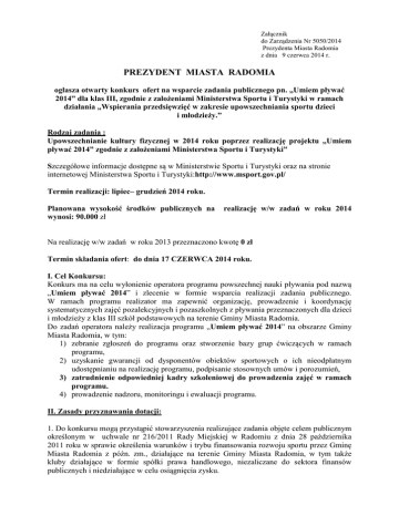 Załącznik do Zarządzenia Nr 5050/2014 Prezydenta Miasta Radomia z dnia 9 czerwca 2014 r. PREZYDENT MIASTA RADOMIA ogłasza otwarty konkurs ofert na wsparcie zadania publicznego pn. „Umiem pływać 2014” dla klas III, zgodnie z założeniami Ministerstwa Sportu i Turystyki w ramach działania „Wspierania przedsięwzięć w zakresie upowszechniania sportu dzieci i młodzieży.” Rodzaj zadania : Upowszechnianie kultury fizycznej w 2014 roku poprzez realizację projektu „Umiem pływać 2014” zgodnie z założeniami Ministerstwa Sportu i Turystyki” Szczegółowe informacje dostępne są w Ministerstwie Sportu i Turystyki oraz na stronie internetowej Ministerstwa Sportu i Turystyki:http://www.msport.gov.pl/ Termin realizacji: lipiec– grudzień 2014 roku. Planowana wysokość środków publicznych na wynosi: 90.000 zł realizację w/w zadań w roku 2014 Na realizację w/w zadań w roku 2013 przeznaczono kwotę 0 zł Termin składania ofert: do dnia 17 CZERWCA 2014 roku. I. Cel Konkursu: Konkurs ma na celu wyłonienie operatora programu powszechnej nauki pływania pod nazwą „Umiem pływać 2014” i zlecenie w formie wsparcia realizacji zadania publicznego. W ramach programu realizator ma zapewnić organizację, prowadzenie i koordynację systematycznych zajęć pozalekcyjnych i pozaszkolnych z pływania przeznaczonych dla dzieci i młodzieży z klas III szkół podstawowych na terenie Gminy Miasta Radomia. Do zadań operatora należy realizacja programu „Umiem pływać 2014” na obszarze Gminy Miasta Radomia, w tym: 1) zebranie zgłoszeń do programu oraz stworzenie bazy grup ćwiczących w ramach programu, 2) uzyskanie gwarancji od dysponentów obiektów sportowych o ich nieodpłatnym udostępnianiu na realizację programu, podpisanie stosownych umów i porozumień, 3) zatrudnienie odpowiedniej kadry szkoleniowej do prowadzenia zajęć w ramach programu. 4) prowadzenie nadzoru, monitoringu i ewaluacji programu. II. Zasady przyznawania dotacji: 1. Do konkursu mogą przystąpić stowarzyszenia realizujące zadania objęte celem publicznym określonym w uchwale nr 216/2011 Rady Miejskiej w Radomiu z dnia 28 października 2011 roku w sprawie określenia warunków i trybu finansowania rozwoju sportu przez Gminę Miasta Radomia z późn. zm., działające na terenie Gminy Miasta Radomia, w tym także kluby działające w formie spółki prawa handlowego, niezaliczane do sektora finansów publicznych i niedziałające w celu osiągnięcia zysku. 2. W postępowaniu konkursowym Gmina Miasta Radomia zastrzega sobie prawo do wyboru jednego realizatora zadania (dofinansowania jednej oferty). 3. Dofinansowanie ze środków Gminy Miasta Radomia nie może przekroczyć 25% kosztów realizacji zadania. 4.Złożenie oferty nie jest równoznaczne z przyznaniem dotacji. 5. W przypadku nie otrzymania dotacji z Ministerstwa Sportu i Turystyki, Prezydent Miasta Radomia zastrzega sobie unieważnienie konkursu. 6. Złożenie oferty o dotację nie gwarantuje przyznania środków w wysokości, o którą występuje oferent, w takim przypadku oferentowi przysługuje prawo proporcjonalnego zmniejszenia zakresu rzeczowego zadania lub rezygnacja z realizacji zadania. O fakcie rezygnacji z realizacji zadania oferent winien niezwłocznie poinformować Prezydenta Miasta Radomia w formie pisemnej. W przypadku otrzymania dotacji w wysokości mniejszej niż wnioskowana, oferent zobowiązany jest dostarczyć zaktualizowany harmonogram i kosztorys realizacji zadania w terminie 14 dni od dnia opublikowania rozstrzygnięcia konkursu. 6. Brak przedstawienia przez oferenta zaktualizowanego harmonogramu i kosztorysu w wyżej określonym terminie, uwzględniającego wysokość otrzymanej dotacji, jest równoznaczny z rezygnacją z realizacji zadania. 7. Dotacja na realizację zadania może być przeznaczona na: 1) wynajem pływalni lub zakup biletów wstępu na pływalnie, 2) pokrycie kosztów usługi instruktorskiej, wychowawczej oraz sędziowskiej, 3) ubezpieczenie uczestników zajęć; 4) pokrycie kosztów transportu/ dojazdu uczestników; 5) koszty administracyjne do wysokości 10% sumy kosztów bezpośrednich; 6) obsługi technicznej i medycznej 8. Szczegółowe warunki realizacji, finansowania oraz rozliczenia zadania reguluje umowa zawarta pomiędzy Gminą Miasta Radomia a oferentem. 9. Prawa i obowiązki dotyczące realizacji zadania nie mogą być przenoszone przez oferenta na inne podmioty bądź jednostki. III. Termin i warunki realizacji zadań: 1. Zadanie winno być zrealizowane w terminie wskazanym w ogłoszeniu z zastrzeżeniem, że szczegółowe terminy realizacji zadania określone zostaną w umowie. 2. Dopuszcza się możliwość przesunięcia wydatków w pozycji jednostkowej kosztów dotacji nieprzekraczających 10 %. Przesunięcie wydatków w wysokości nie przekraczającej 10 % pozycji jednostkowej kosztów realizowanego zadania nie wymaga zmiany umowy. 3. Zadanie winno być zrealizowane z najwyższą starannością, zgodnie z zawartą umową oraz obowiązującymi standardami i przepisami w zakresie opisanym w ofercie. IV. Termin i warunki składania ofert: 1. Warunkiem przystąpienia do konkursu jest złożenie w terminie określonym w niniejszym ogłoszeniu pisemnej oferty wraz z wymaganymi załącznikami w sekretariacie Wydziału Edukacji Sportu i Turystyki lub drogą pocztową na adres: Urząd Miejski, Wydział Edukacji Sportu i Turystyki, 26-600 Radom, ul. Żeromskiego 53 (liczy się data wpływu oferty do sekretariatu Wydziału Edukacji, Sportu i Turystyki, II piętro pokój 268 w godz. 7.30-15.30). 2. Czytelnie wypełnione oferty, złożone odrębnie dla każdego zadania, muszą być zgodne z załącznikiem nr 1 do niniejszego ogłoszenia. 3. Oferta powinna być opatrzona pieczątką oferenta oraz pieczątką imienną osób upoważnionych do składania oświadczeń woli w jego imieniu, złożona wraz z wymaganymi załącznikami w jednym egzemplarzu, w zamkniętej kopercie, na której po