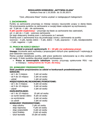 REGULAMIN KONKURSU „AKTYWNA KLASA” Konkurs trwa od 1.10.2016r. do 31.05.2017r. Tytuł „Aktywana Klasa” można uzyskać w następujących kategoriach: I. ZACHOWANIE: Punkty za zachowanie przyznają co miesiąc wszyscy nauczyciele uczący w danej klasie. Od przyznawania punktów za zachowanie w swojej klasie wyłączeni są wychowawcy. od - 5 pkt do –1 pkt - złe zachowanie, 0 pkt (punkt wyjściowy) – przyznaje się klasie za zachowanie bez zastrzeżeń, od +1 pkt do + 5 pkt - wzorowe zachowanie Do tego dołączamy średnią ocen z zachowania za I semestr Średnią ocen z zachowania liczy się przeliczając ocenę z zachowania na punkty wzorowe – 6 pkt, bardzo dobre – 5 pkt, dobre – 4 pkt, poprawne – 3 pkt, nieodpowiednie – 2 pkt. naganne – 1 pkt II. PRACA NA RZECZ SZKOŁY Udział w pracach społecznych: 0 – 10 pkt (za wykonaną pracę), Uwaga: Uczniowie sami wychodzą z propozycjami różnych prac społecznych i wykonują je pod nadzorem nauczyciela. Można uzyskać dodatkowe punkty, jeśli prace społeczne wykonywane są w dniu wolnym od nauki. O ilości punktów decyduje zespół wychowawczy. Praca w samorządzie szkolnym -punkty przyznają opiekunowie RSU –raz w miesiącu - maksymalnie do 10 pkt. dla klasy. III. KONKURSY PRZEDMIOTOWE: Ilość punktów przyznawana za udział w konkursach przedmiotowych: SZKOLNE: - od 1 do 3 miejsca 3 pkt od osoby - od 4 do 10 miejsca 2 pkt od osoby - udział 1 pkt od osoby MIĘDZYSZKOLNE/REJONOWE/POWIATOWE: - od 1 do 3 miejsca 6 pkt od osoby - od 4 do 10 miejsca 4 pkt od osoby - udział 2 pkt od osoby OGÓLNOPOLSKIE: - od 1 do 10 miejsca 10 pkt od osoby - za wynik bardzo dobry 8 pkt od osoby - za wyróżnienie 6 pkt od osoby - za udział 2 pkt od osoby KONKURSY PRZEDMIOTOWE: - etap szkolny 2 pkt od osoby - etap rejonowy 4 pkt od osoby - etap wojewódzki 6 pkt od osoby - tytuł finalisty 8 pkt od osoby - tytuł laureata 10 pkt od osoby IV.ZAWODY SPORTOWE: Ilość punktów przyznawana za udział w zawodach sportowych: - szkolnych 1 pkt od osoby - miejskich 2 pkt od osoby - powiatowych 3 pkt od osoby - rejonowych 4 pkt od osoby - wojewódzkich 5 pkt od osoby - ogólnopolskie 6 pkt od osoby V. CZYTELNICTWO Stan czytelnictwa – raz w miesiącu I miejsce 8 pkt II miejsce 6 pkt III miejsce 4 pkt Udział w akcji „Książka, którą warto przeczytać”- raz w miesiącu – 1pkt. dla uczestnika za udział w akcji VI. APELE I UROCZYSTOŚCI Udział w akademiach i apelach, można uzyskać od 1 do 15pkt (dla klasy, gdy klasa przygotowuje daną uroczystość) lub 1 pkt (od osoby np. dla uczniów występujących w zespole wokalnym), ale nie więcej niż 10 pkt dla klasy. POSTANOWIENIA KOŃCOWE: 1. W konkursie biorą udział wszystkie klasy. 2. Przewodniczący klas składają do 1 – go dnia następnego miesiąca raporty dotyczące działalności klasy w miesiącu poprzednim, do p.Elżbiety Wójcik 3. Jeżeli raporty za dany miesiąc nie zostaną złożone w terminie, dodatnie punkty dla klasy za ten okres nie będą doliczane do ogólnego stanu punktowego w następnych miesiącach. Tytuł „Aktywna Klasa” w danej kategorii może uzyskać tylko ta klasa, która w miesięcznym (a później w rocznym) podsumowaniu konkursu w danej kategorii uzyska najwiekszą liczbę puntów i w kategorii zachowanie uzyska wynik nieujemny. 7. Nagrody – NIESPODZIANKI!!!!! ufundowane przez dyrektora szkoły są przyznawane na koniec roku, całym klasom, ale wychowawca ma prawo wykluczyć z nagrody uczniów, którzy nie przyczynili się do sukcesu.