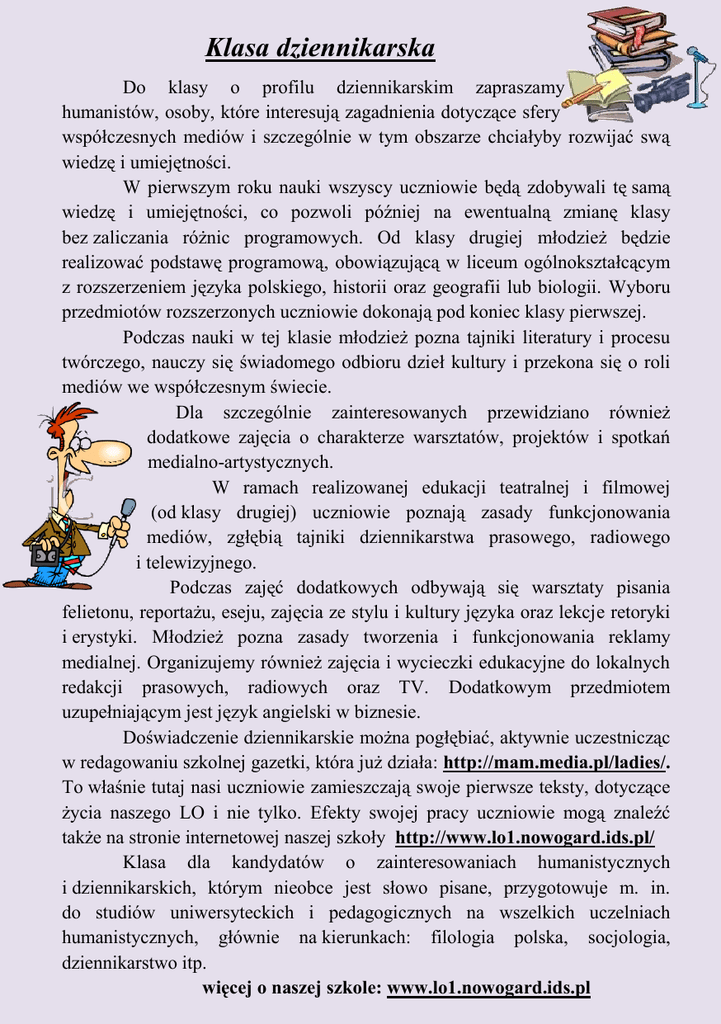 Klasa dziennikarska Do klasy o profilu dziennikarskim zapraszamy humanistów, osoby, które interesują zagadnienia dotyczące sfery współczesnych mediów i szczególnie w tym obszarze chciałyby rozwijać swą wiedzę i umiejętności. W pierwszym roku nauki wszyscy uczniowie będą zdobywali tę samą wiedzę i umiejętności, co pozwoli później na ewentualną zmianę klasy bez zaliczania różnic programowych. Od klasy drugiej młodzież będzie realizować podstawę programową, obowiązującą w liceum ogólnokształcącym z rozszerzeniem języka polskiego, historii oraz geografii lub biologii. Wyboru przedmiotów rozszerzonych uczniowie dokonają pod koniec klasy pierwszej. Podczas nauki w tej klasie młodzież pozna tajniki literatury i procesu twórczego, nauczy się świadomego odbioru dzieł kultury i przekona się o roli mediów we współczesnym świecie. Dla szczególnie zainteresowanych przewidziano również dodatkowe zajęcia o charakterze warsztatów, projektów i spotkań medialno-artystycznych. W ramach realizowanej edukacji teatralnej i filmowej (od klasy drugiej) uczniowie poznają zasady funkcjonowania mediów, zgłębią tajniki dziennikarstwa prasowego, radiowego i telewizyjnego. Podczas zajęć dodatkowych odbywają się warsztaty pisania felietonu, reportażu, eseju, zajęcia ze stylu i kultury języka oraz lekcje retoryki i erystyki. Młodzież pozna zasady tworzenia i funkcjonowania reklamy medialnej. Organizujemy również zajęcia i wycieczki edukacyjne do lokalnych redakcji prasowych, radiowych oraz TV. Dodatkowym przedmiotem uzupełniającym jest język angielski w biznesie. Doświadczenie dziennikarskie można pogłębiać, aktywnie uczestnicząc w redagowaniu szkolnej gazetki, która już działa: http://mam.media.pl/ladies/. To właśnie tutaj nasi uczniowie zamieszczają swoje pierwsze teksty, dotyczące życia naszego LO i nie tylko. Efekty swojej pracy uczniowie mogą znaleźć także na stronie internetowej naszej szkoły http://www.lo1.nowogard.ids.pl/ Klasa dla kandydatów o zainteresowaniach humanistycznych i dziennikarskich, którym nieobce jest słowo pisane, przygotowuje m. in. do studiów uniwersyteckich i pedagogicznych na wszelkich uczelniach humanistycznych, głównie na kierunkach: filologia polska, socjologia, dziennikarstwo itp. więcej o naszej szkole: www.lo1.nowogard.ids.pl